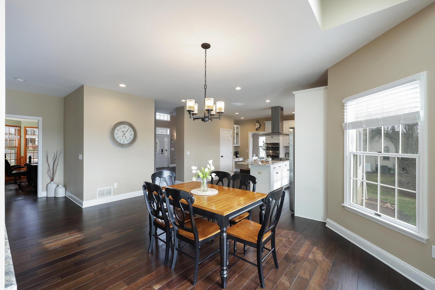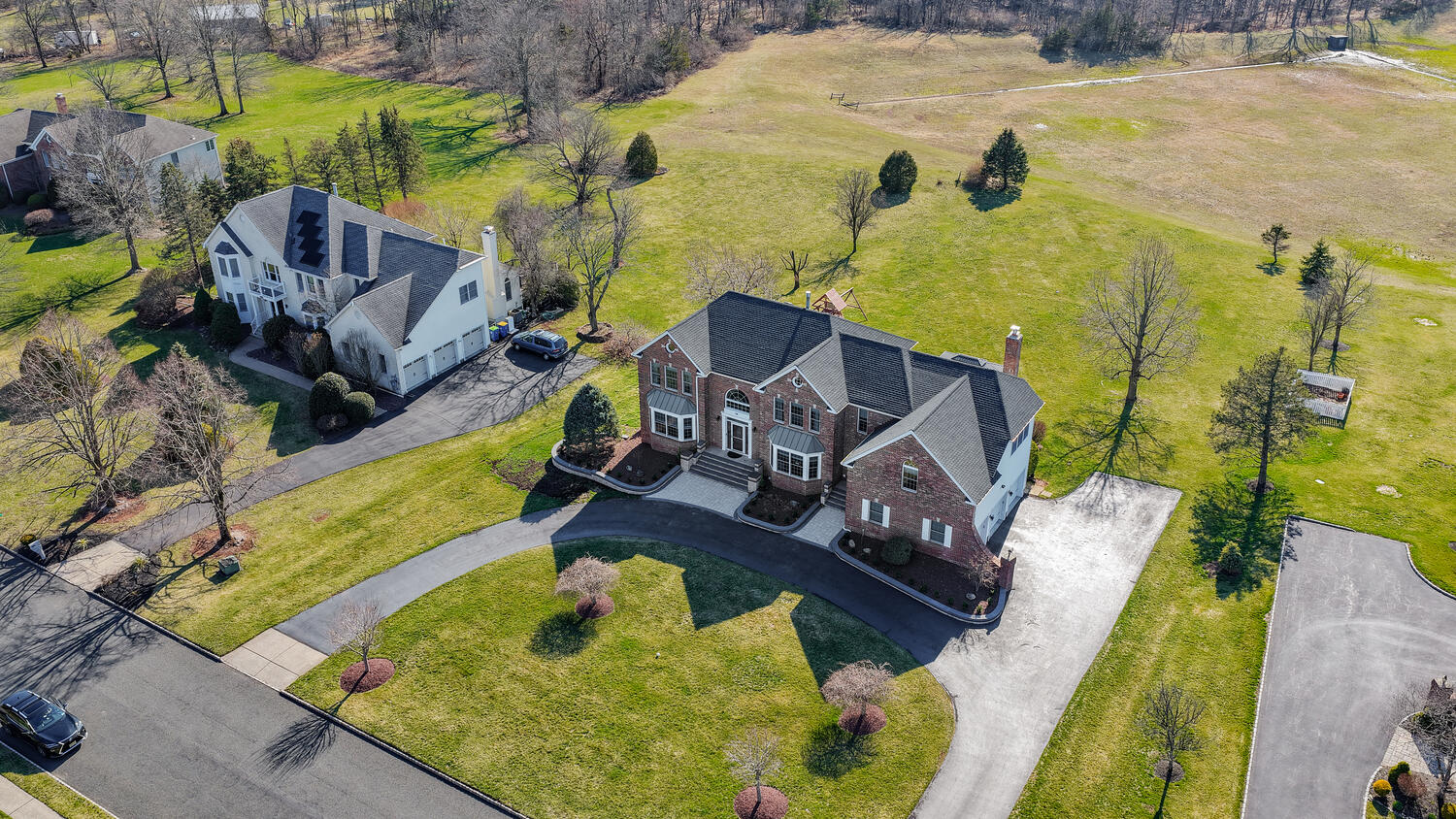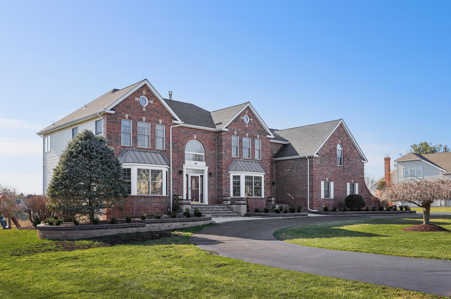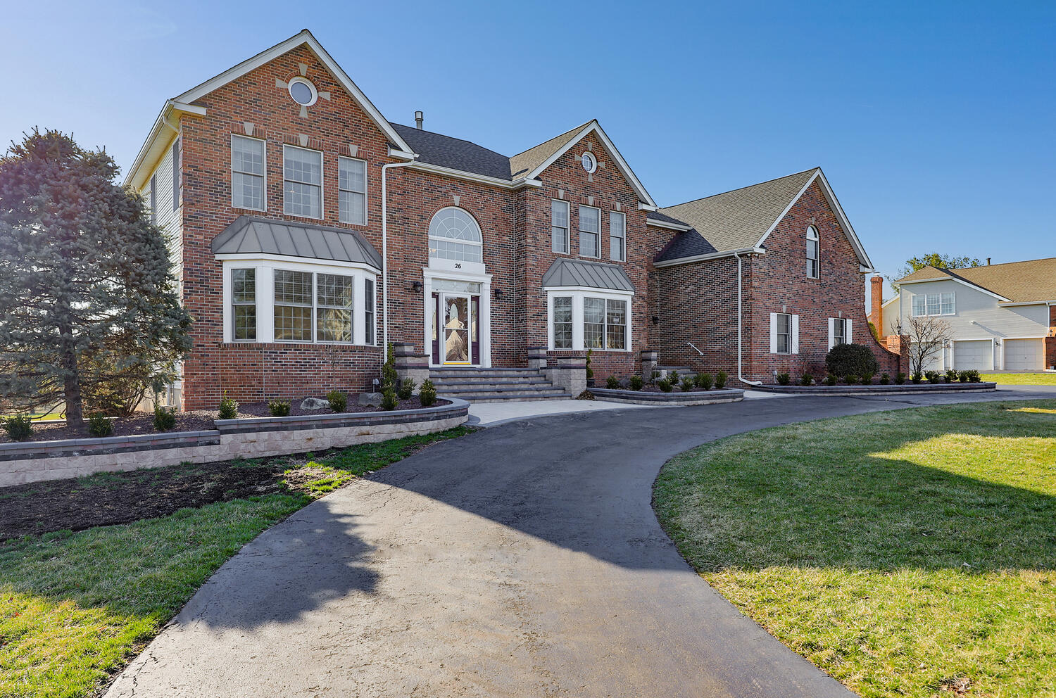 Stunning brick-front colonial offering 5 Bedrooms, 3.5 Baths and approx. 4,134 sq ft of beautifully updated living space. A grand two-story foyer with hardwood floors sets the tone, flanked by a private office with custom built-ins, wainscoting, and recessed lighting. The elegant Dining Room features hardwood flooring, tray ceiling, chair rail, and decorative columns. The spacious Kitchen is designed for both function and style, boasting a large center island, granite countertops, coffee station, and newer cooktop and dishwasher. The inviting living room offers bay windows and recessed lighting, while the dramatic two-story family room showcases skylights, a second staircase, and a floor-to-ceiling whitewashed brick wood-burning fireplace. A well-appointed laundry/mudroom with exterior access and an updated powder room complete the main level. Upstairs, the luxurious primary suite features double-door entry, a spa-like bath with quartz dual vanity, jetted tub, separate shower, private commode, and an exceptional walk-in closet with custom built-ins, ironing center, valet, and jewelry storage. Bedrooms 2-5 include custom closets, and recessed lighting. The basement offers epoxy floors, shelving and direct access to the 3-car garage. The exterior offers a spacious open yard with sweeping views and composite deck (2022). Additional highlights: Roof (2019), 2 HVAC's (2018) ext. lighting, security system, Ring doorbell, smart thermostat, Tesla charger, New Hardwood Floors (2020) and custom blinds throughout (2024).