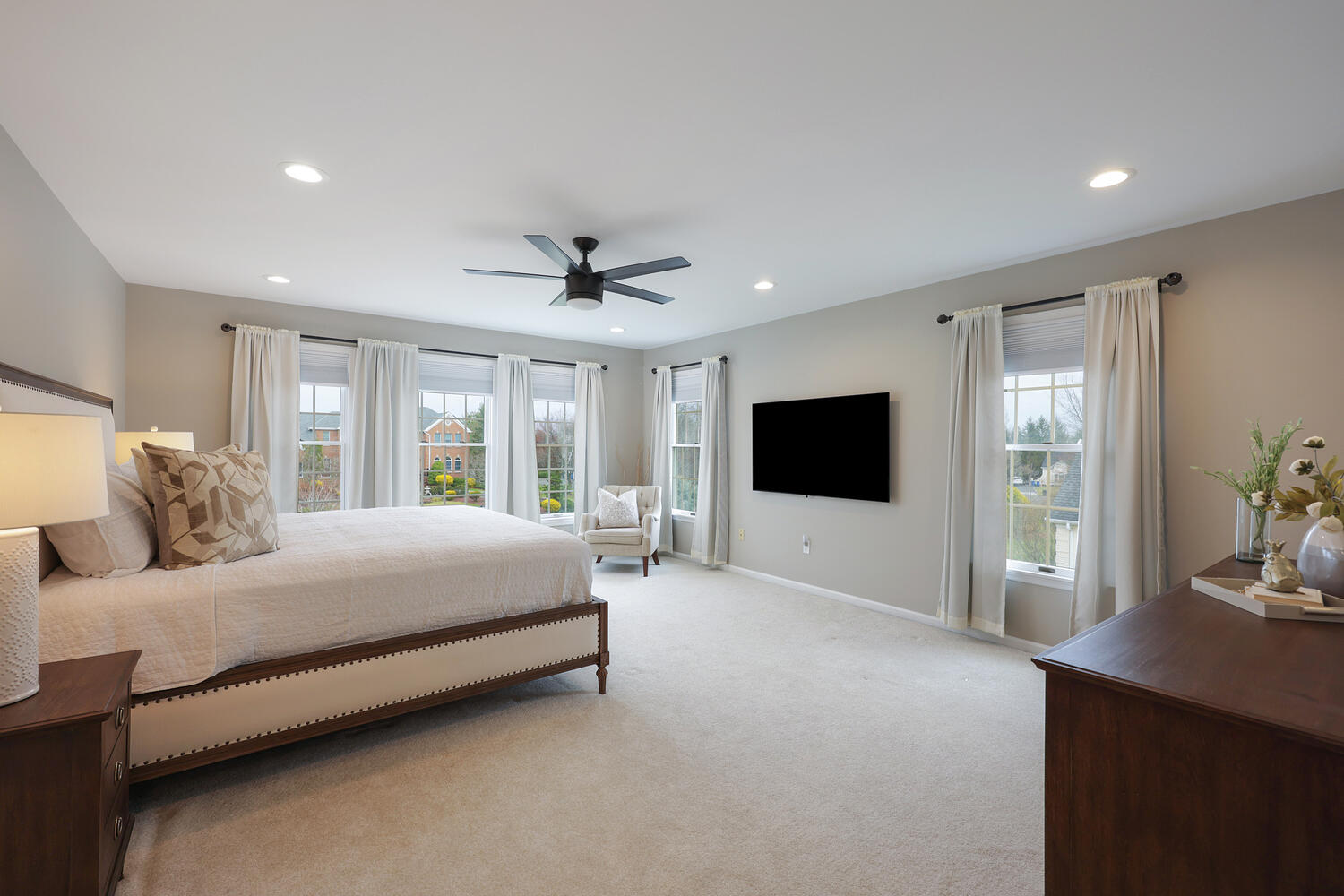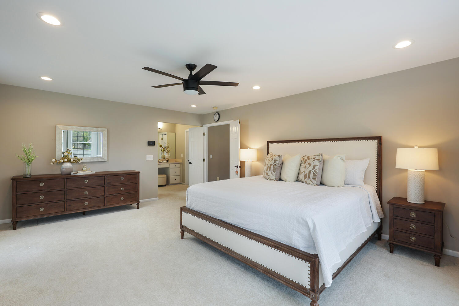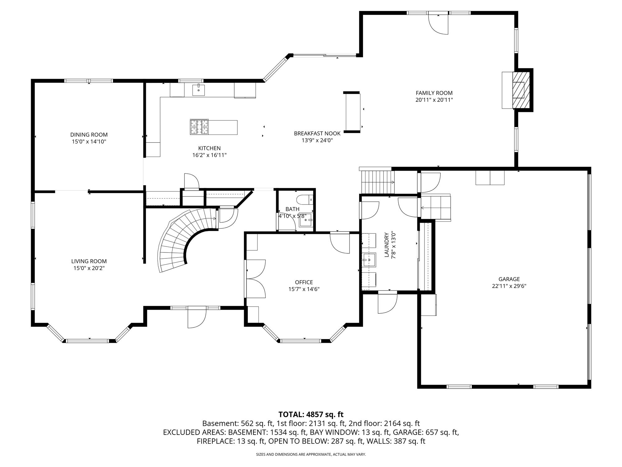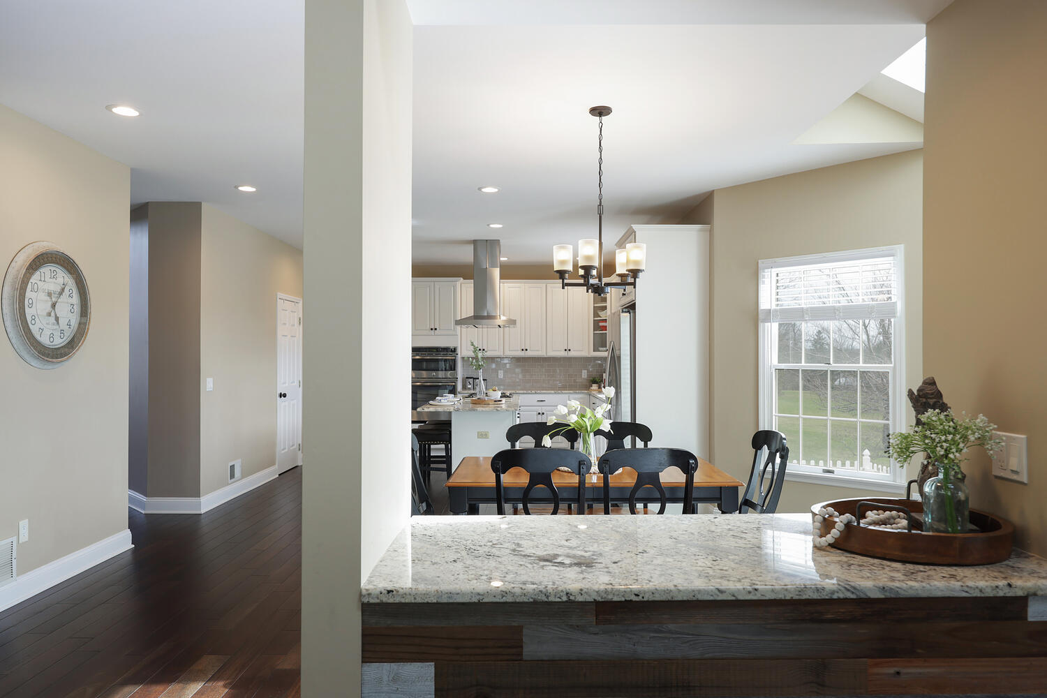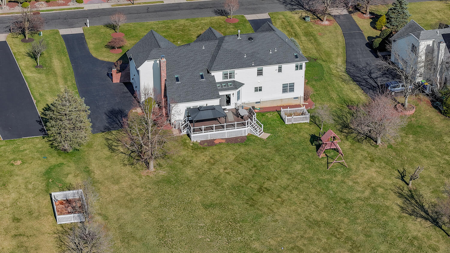 Stunning brick-front colonial offering 5 Bedrooms, 3.5 Baths and approx. 4,134 sq ft of beautifully updated living space. A grand two-story foyer with hardwood floors sets the tone, flanked by a private office with custom built-ins, wainscoting, and recessed lighting. The elegant Dining Room features hardwood flooring, tray ceiling, chair rail, and decorative columns. The spacious Kitchen is designed for both function and style, boasting a large center island, granite countertops, coffee station, and newer cooktop and dishwasher. The inviting living room offers bay windows and recessed lighting, while the dramatic two-story family room showcases skylights, a second staircase, and a floor-to-ceiling whitewashed brick wood-burning fireplace. A well-appointed laundry/mudroom with exterior access and an updated powder room complete the main level. Upstairs, the luxurious primary suite features double-door entry, a spa-like bath with quartz dual vanity, jetted tub, separate shower, private commode, and an exceptional walk-in closet with custom built-ins, ironing center, valet, and jewelry storage. Bedrooms 2-5 include custom closets, and recessed lighting. The basement offers epoxy floors, shelving and direct access to the 3-car garage. The exterior offers a spacious open yard with sweeping views and composite deck (2022). Additional highlights: Roof (2019), 2 HVAC's (2018) ext. lighting, security system, Ring doorbell, smart thermostat, Tesla charger, New Hardwood Floors (2020) and custom blinds throughout (2024).