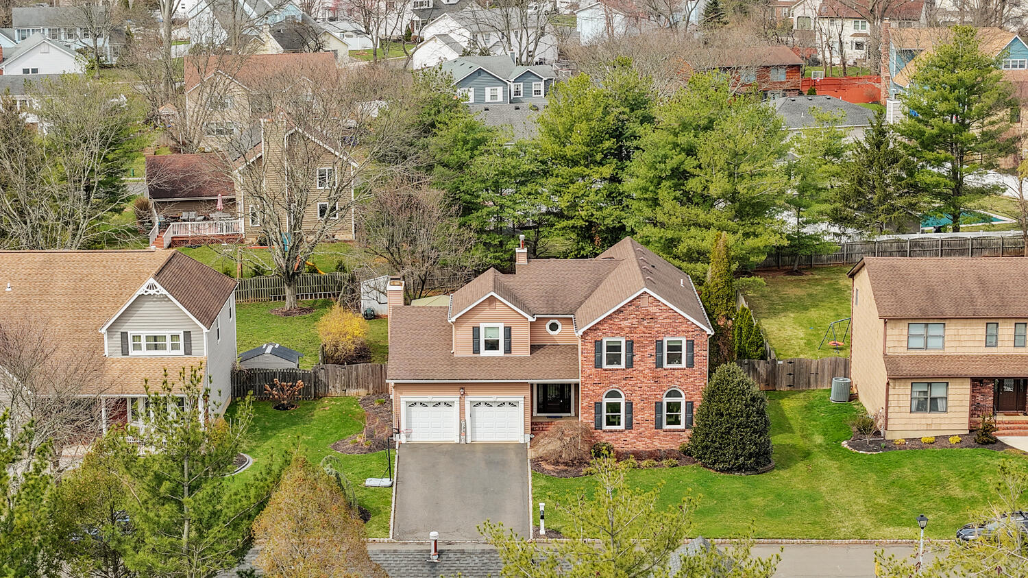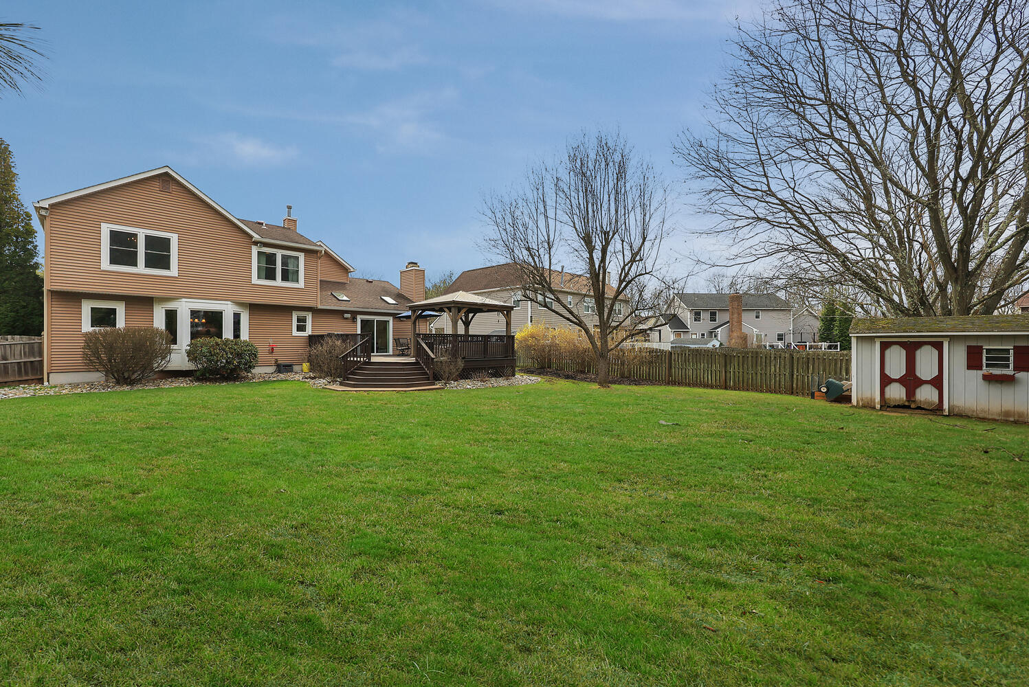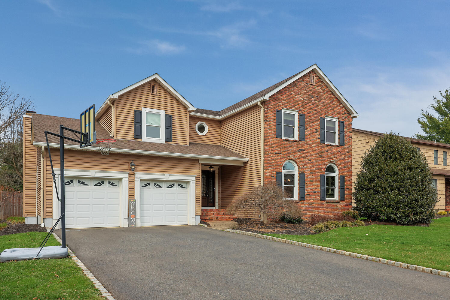 Welcome to this beautifully maintained home in the sought-after Rohill Estate section of Hillsborough. Offering 4 Bedrooms, 2.5 Bathrooms, and nearly 2,800 sq ft of living space + a finished basement, this home blends comfort, style, and functionality. Striking curb appeal features a brick front and newer vinyl siding. Designed for everyday living and entertaining, the backyard boasts a recently updated wood deck with pergola perfect for relaxing or hosting gatherings. Inside, each room has been thoughtfully designed. The family room with engineered Hardwood floors, vaulted ceiling with skylights and remote solar shades, and a stone-surround gas fireplace is the heart of the home. The living and dining rooms feature refinished Hardwood floors and elegant crown molding. The remodeled kitchen (2010) offers granite countertops, pull-out pantry shelves, Wolf 6-burner oven and cooktop, vented hood, beverage center, wine fridge, bay window, recessed lighting, and a cleverly concealed laundry area. Upstairs, all four bedrooms feature laminate flooring. The spacious primary suite includes a custom closet and a beautifully updated ensuite bath (2018) with dual vanity, quartz countertops, oversized shower with bench and recessed niche, and a full-length linen closet behind a charming barn door. A secondary bedroom includes bonus storage space ideal for finishing for a home office or playroom. The finished basement adds versatile living space with carpeting, drop ceiling, built-ins, and a cedar closet completing this exceptional home.