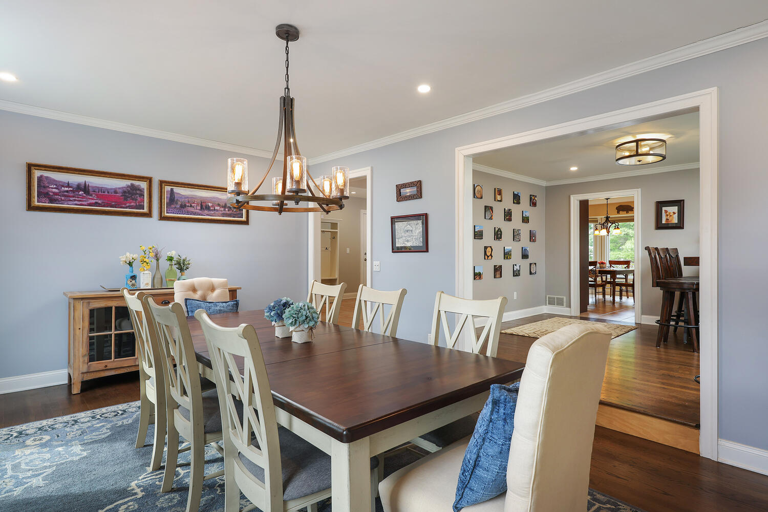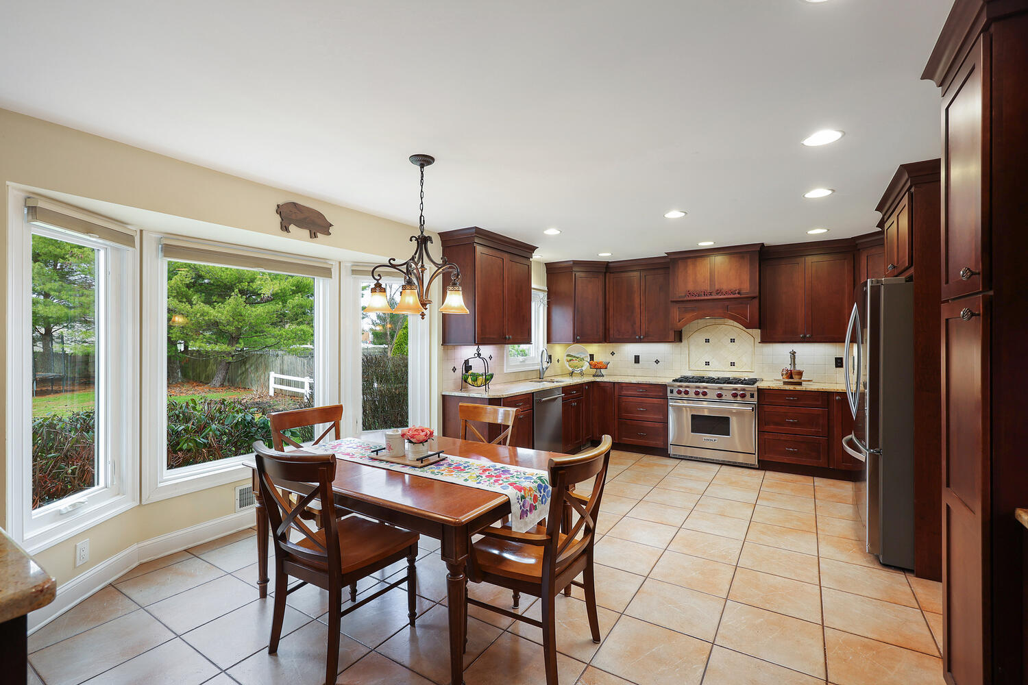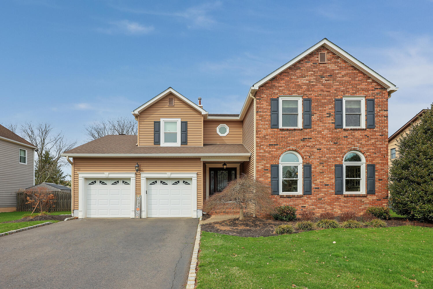 Welcome to this beautifully maintained home in the sought-after Rohill Estate section of Hillsborough. Offering 4 Bedrooms, 2.5 Bathrooms, and nearly 2,800 sq ft of living space + a finished basement, this home blends comfort, style, and functionality. Striking curb appeal features a brick front and newer vinyl siding. Designed for everyday living and entertaining, the backyard boasts a recently updated wood deck with pergola perfect for relaxing or hosting gatherings. Inside, each room has been thoughtfully designed. The family room with engineered Hardwood floors, vaulted ceiling with skylights and remote solar shades, and a stone-surround gas fireplace is the heart of the home. The living and dining rooms feature refinished Hardwood floors and elegant crown molding. The remodeled kitchen (2010) offers granite countertops, pull-out pantry shelves, Wolf 6-burner oven and cooktop, vented hood, beverage center, wine fridge, bay window, recessed lighting, and a cleverly concealed laundry area. Upstairs, all four bedrooms feature laminate flooring. The spacious primary suite includes a custom closet and a beautifully updated ensuite bath (2018) with dual vanity, quartz countertops, oversized shower with bench and recessed niche, and a full-length linen closet behind a charming barn door. A secondary bedroom includes bonus storage space ideal for finishing for a home office or playroom. The finished basement adds versatile living space with carpeting, drop ceiling, built-ins, and a cedar closet completing this exceptional home.