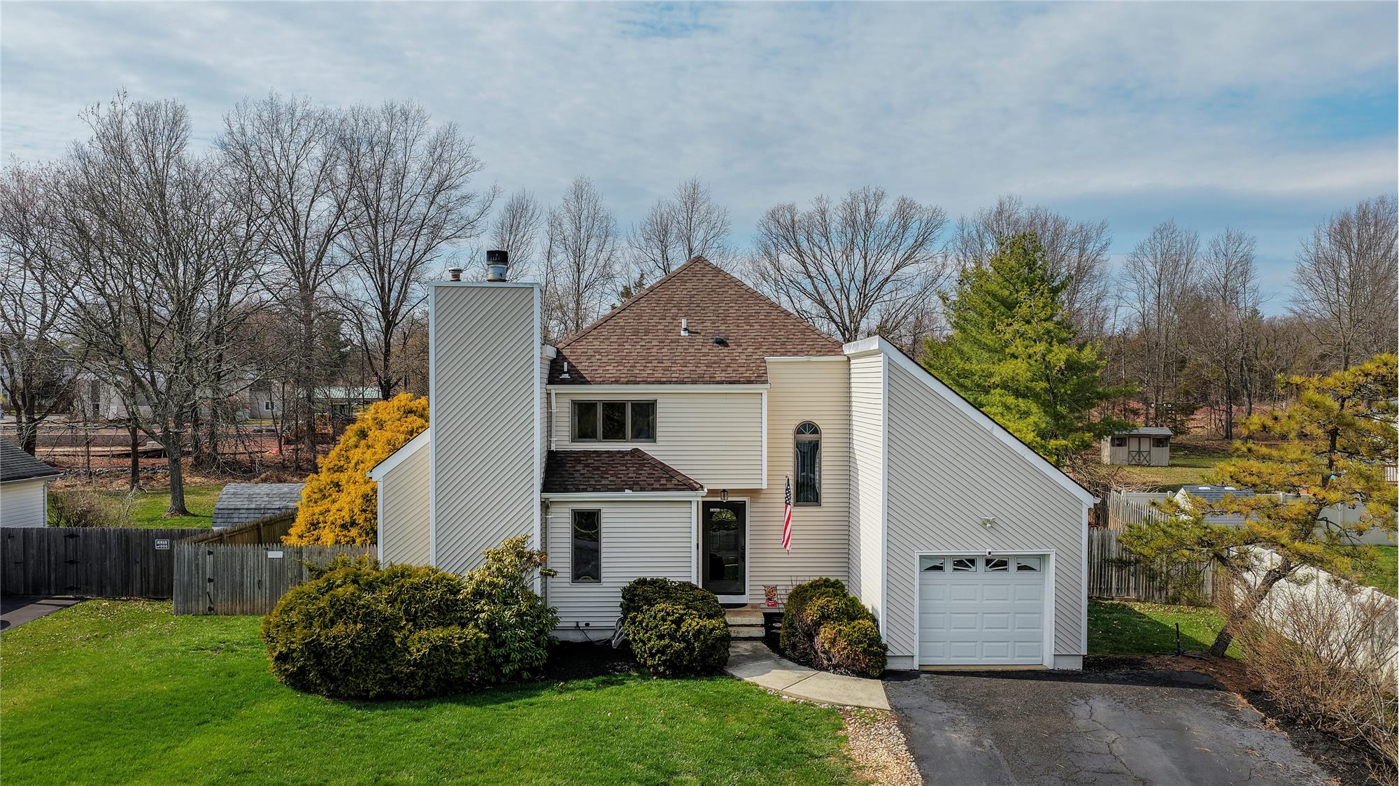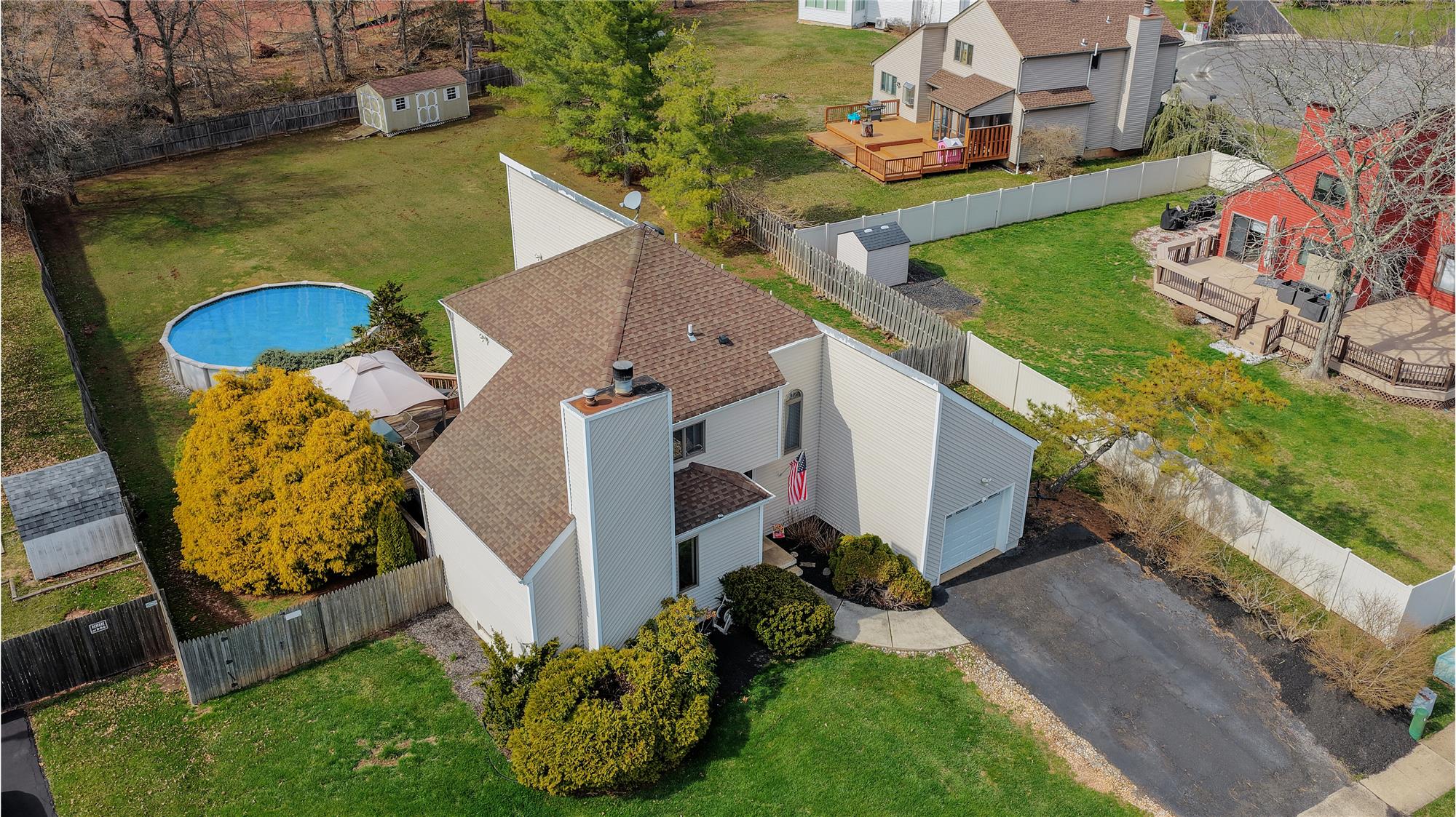 You'll love the nearly 1,900 square feet of living space in this freshly painted, spacious, and charming 3-bedroom, 2.5-bath home with a 1-car garage featuring MyQ app remote access. The backyard is perfect for entertaining or relaxing, offering a deck with pergola, a fenced yard, shed, and above-ground pool. Inside, a tiled foyer welcomes you, flanked by a vaulted-ceiling living room with a Heatilator fireplace and a dining room with hardwood floors with a Pella slider with inset blinds. The kitchen flows seamlessly into the family room with a second Pella slider and a bay window that fills the space with natural light and provides a lovely backyard view. Upstairs, all bedrooms feature carpeting, ample closet space, and ceiling fans with lights. The primary features an ensuite bath, and the main hall bathroom was tastefully updated in 2023. If you're seeking a clean, well-maintained home with plenty of space and the opportunity to add your personal touch, this one is not to be missed.