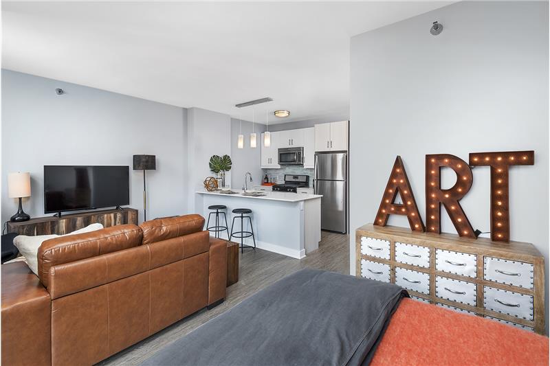 Grey-tone plank flooring throughout, including bedrooms Floor-to-ceiling windows with roller shades Dual-tone kitchen cabinetry Stainless steel Whirlpool appliances Glass tile mosaic backsplash Quartz counter tops in kitchen and bath Terrazzo base and glass-enclosed shower Full-size Whirlpool washer and dryer Custom closet shelving USB ports in kitchen and bedroom Wi-Fi and smart phone-compatible thermostat Wired for up to 1GB internet connectivity Pendant lighting Keyless Entry Default Building Desc.: Outdoor pool and sundeck Fitness center Yoga studio Media room Game room