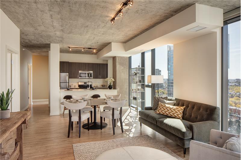 Hardwood throughout, floor to ceiling windows, modern gourmet kitchen, spacious 12 foot balcony! Interior residences are modern, warm and welcoming. Nothing has been sacrificed in delivering these upscale Chicago apartments. From the moment you walk through the door, youll know you are home. Interiors - Each apartment comes with soaring ceilings and exposed concrete surfaces that provide an urban ambience. - The rental residences are 21st century modern with keyless entry and solid core doors, brushed chrome hardware - floor-to-ceiling windows that showcase the picturesque Chicago