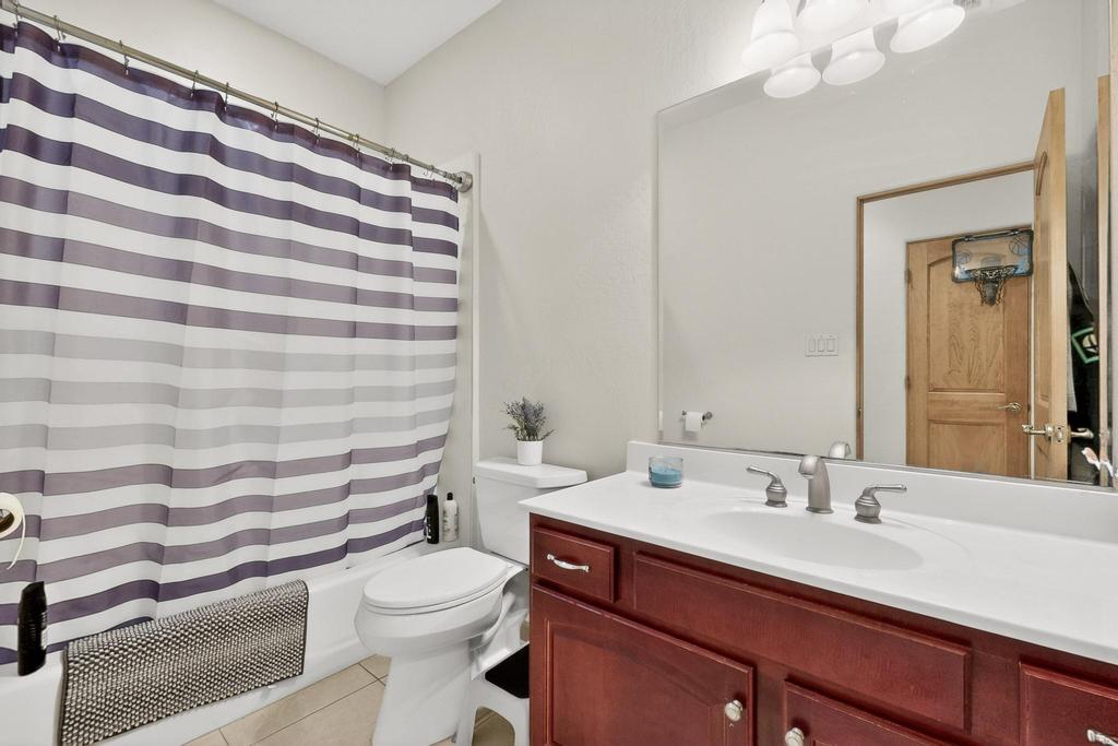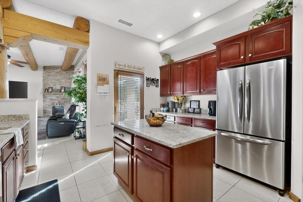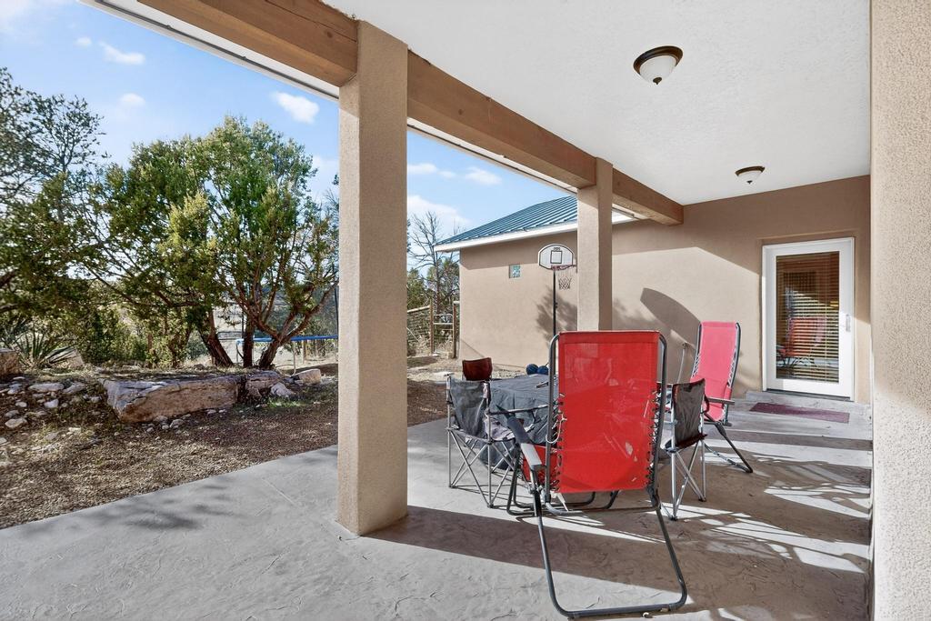 Tucked among mature junipers, this Southwest-inspired home offers privacy and natural beauty. Inside, enjoy exposed ponderosa pine vigas, sun-filled windows, a stacked-stone fireplace, and tile living areas. The kitchen features cherry cabinetry, granite countertops, pantry, and bar-top seating, opening to a covered patio for easy indoor-outdoor living.