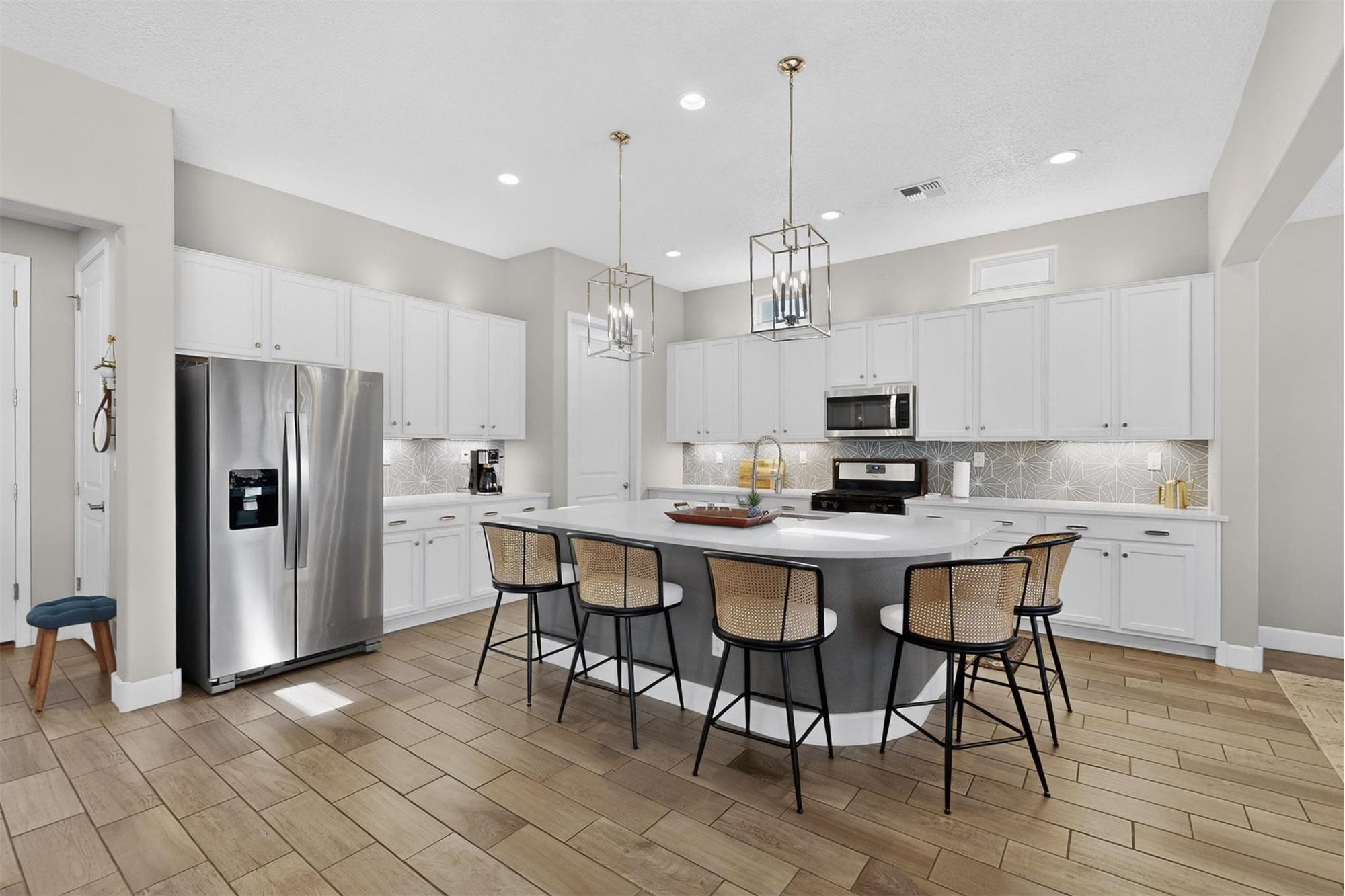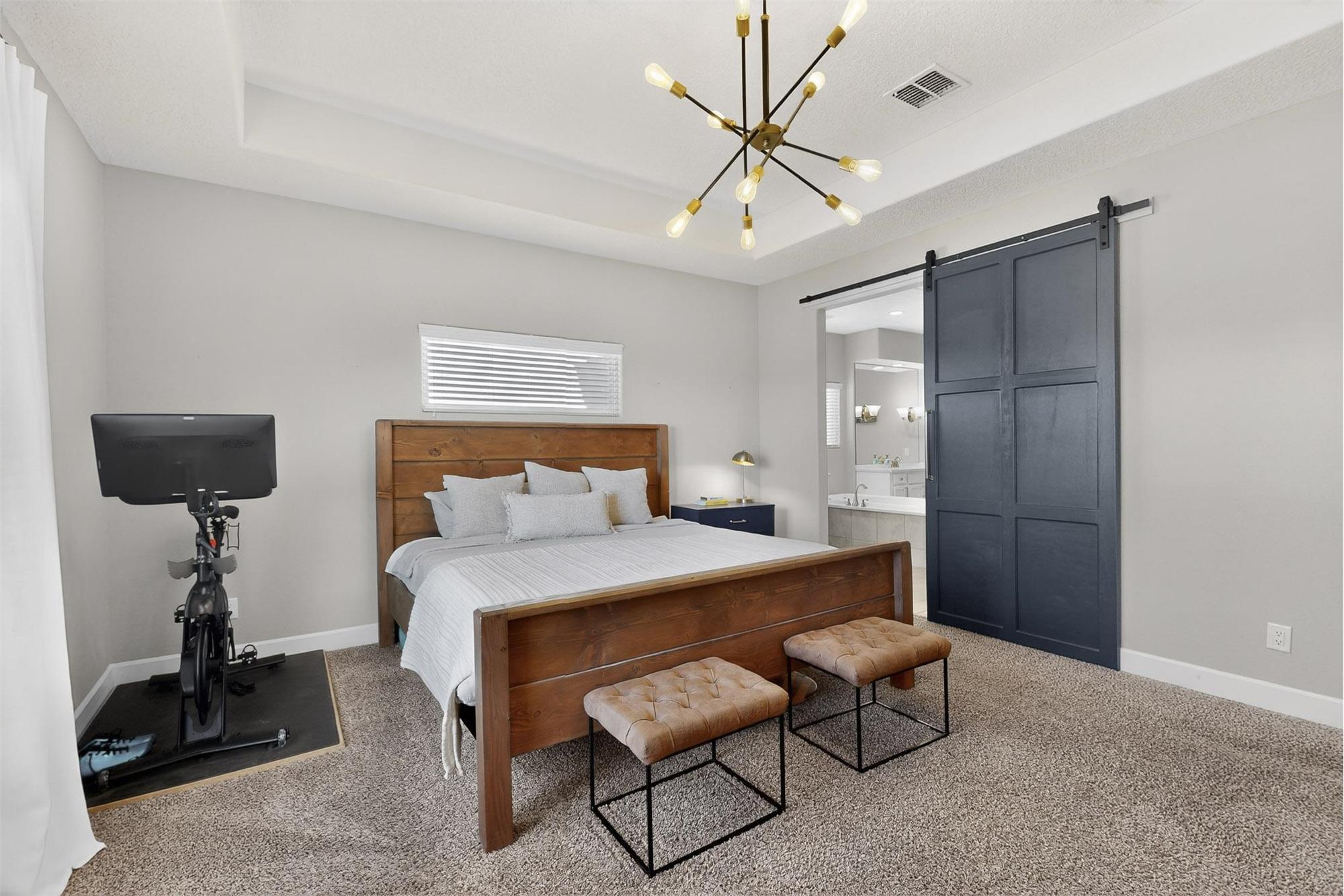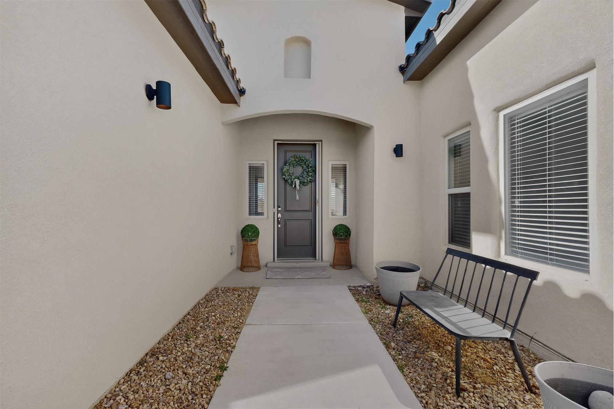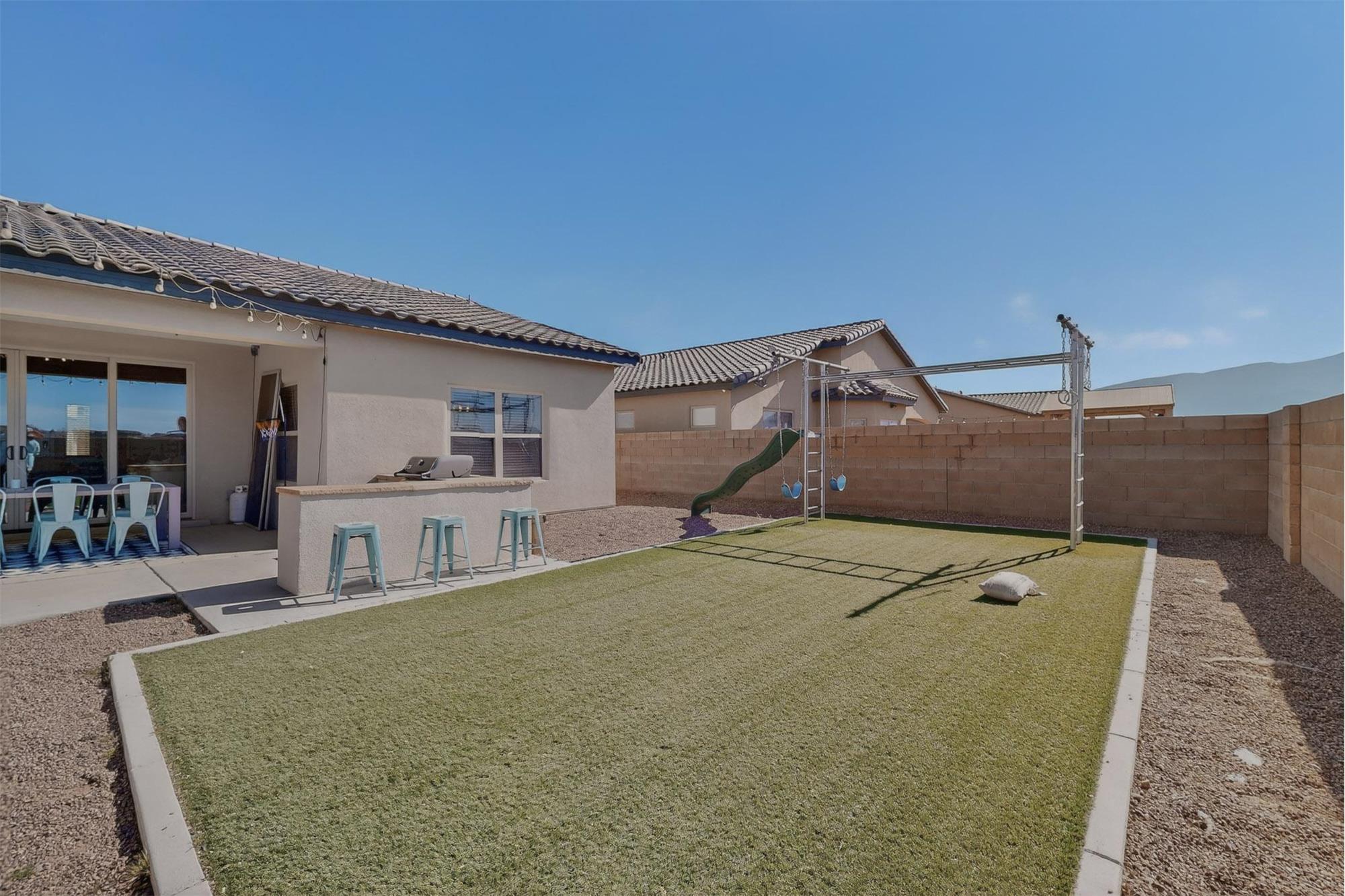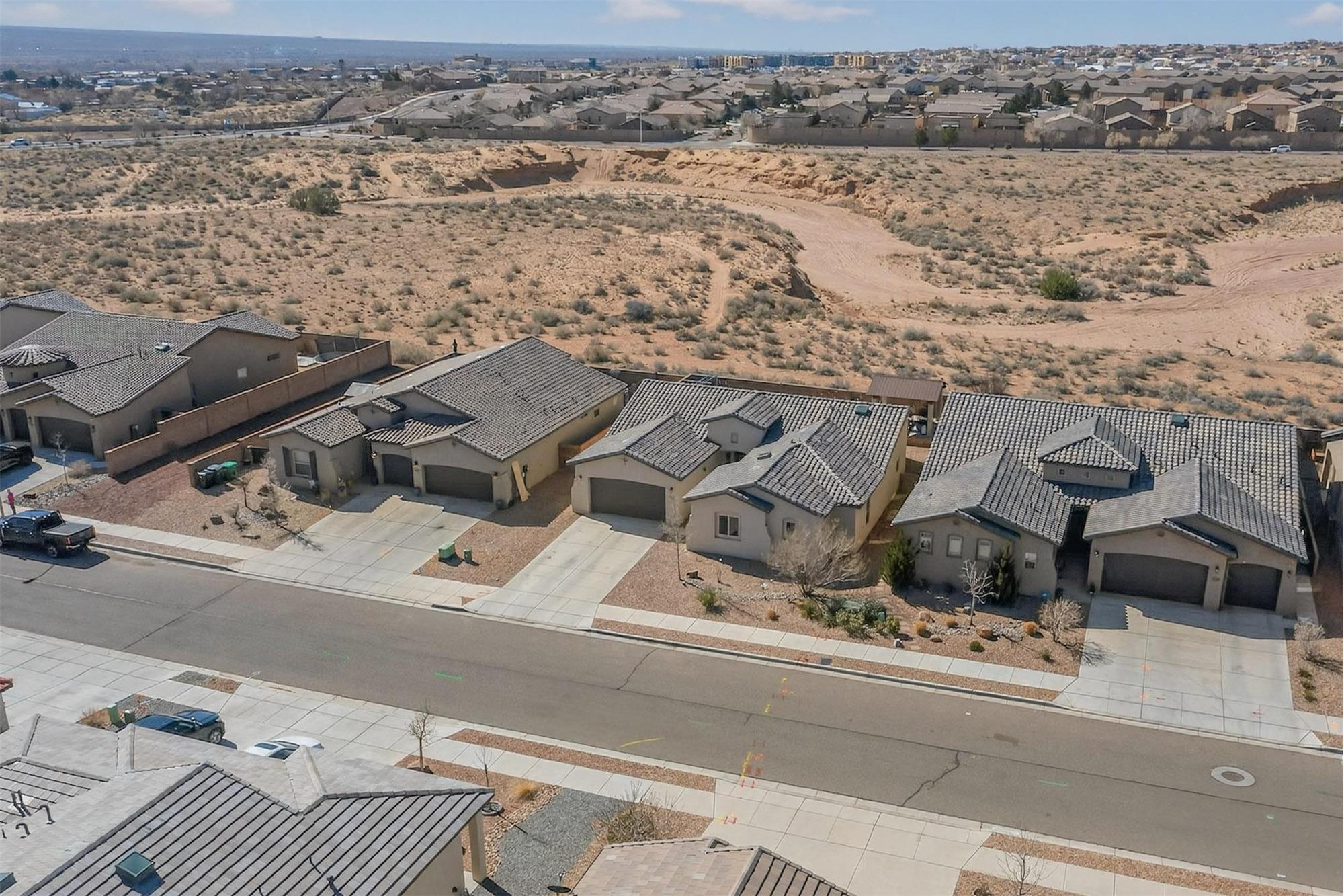 Experience the perfect blend of comfort and elegance in this beautifully designed open-concept home. The spacious great room, with oversized glass doors flood the space with natural light. The gourmet kitchen is nicely appointed and designed to impress, featuring a spacious island with a farmhouse sink, a striking decorative backsplash, stylish lighting, a gas stove, and pantry. The private primary suite is thoughtfully separated from the other bedrooms, offering a peaceful retreat complete with an expansive walk-in closet and a spa-inspired bath featuring a relaxing garden tub and dual vanities. Backing to an arroyo with no neighbors behind, you can relax and unwind on the patio, surrounded by low-maintenance turf, a charming gazebo, and stunning views of the Sandia Mountains.
