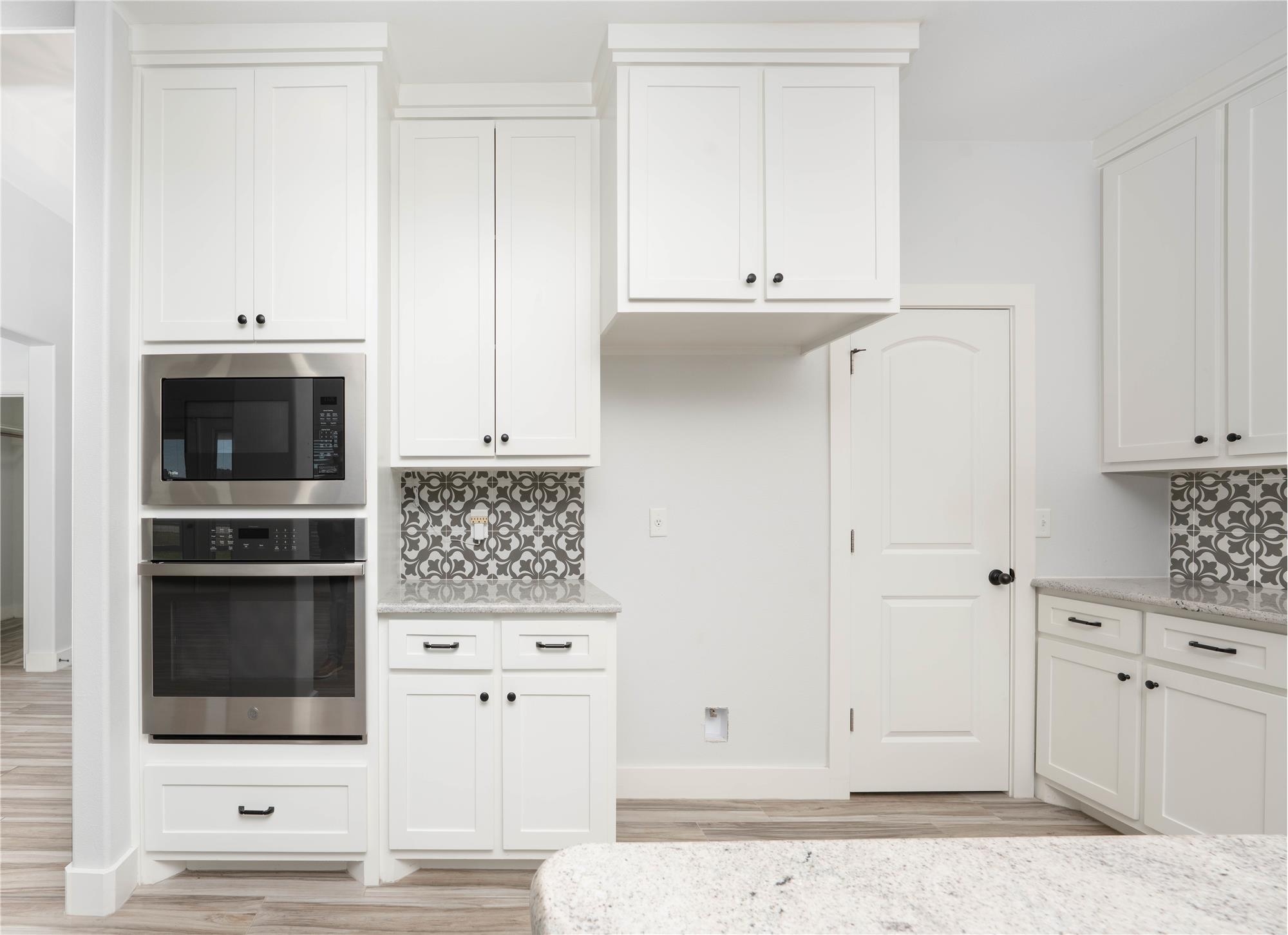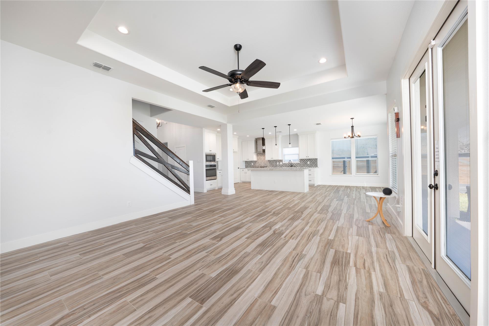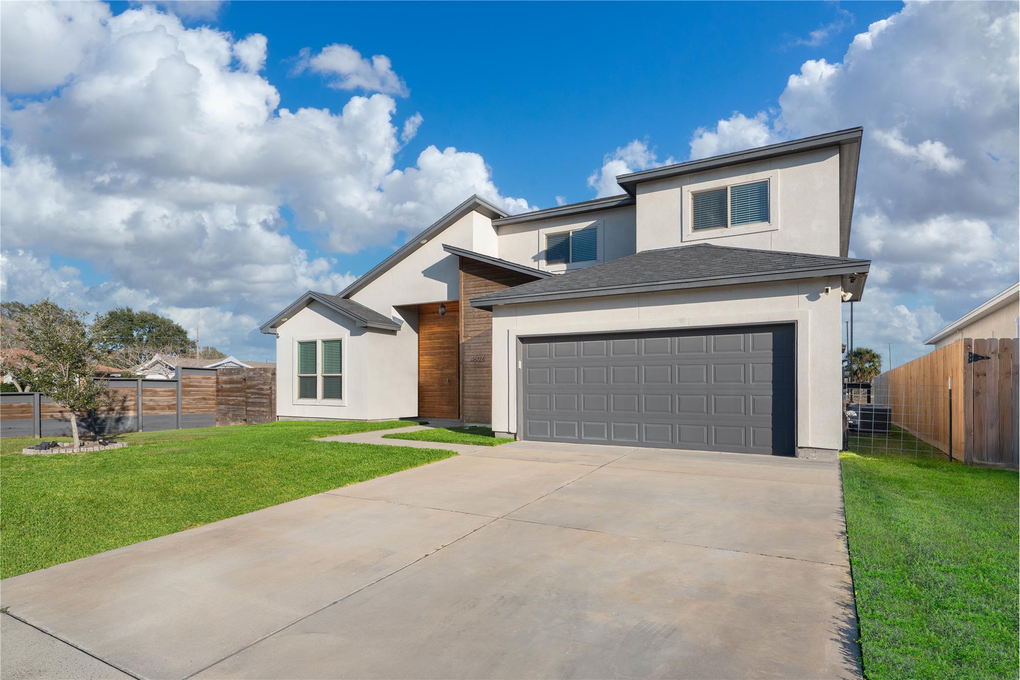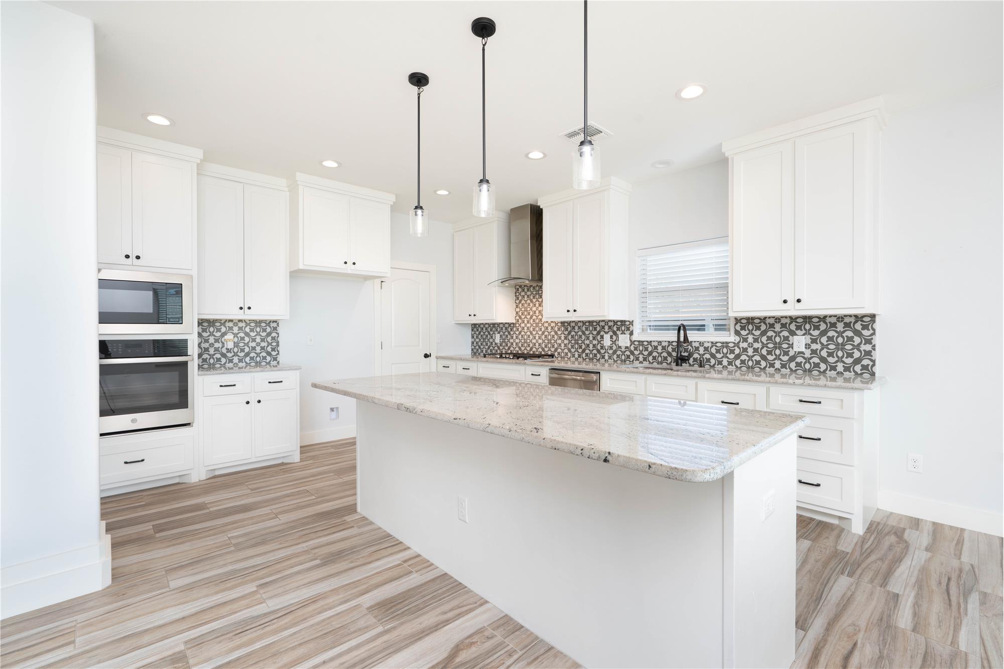 Thoughtfully designed with modern style and everyday comfort in mind, 4802 Del Paseo Dr offers a striking blend of clean architecture and warm finishes in the heart of Corpus Christi. From the moment you arrive, the contemporary exterior and inviting entry to set the tone for what awaits inside. The open-concept floor plan features soaring ceilings, abundant natural light, and wood-look tile flooring that flows seamlessly through the main living areas. At the center of the home is a show-stopping kitchen designed for both function and entertaining, complete with an oversized island, stone countertops, extensive white cabinetry, built-in stainless appliances, gas cooktop with vent hood, and a bold designer tile backsplash that adds texture and visual interest. Pendant lighting and recessed fixtures enhance the bright, airy feel while providing a polished, modern touch.