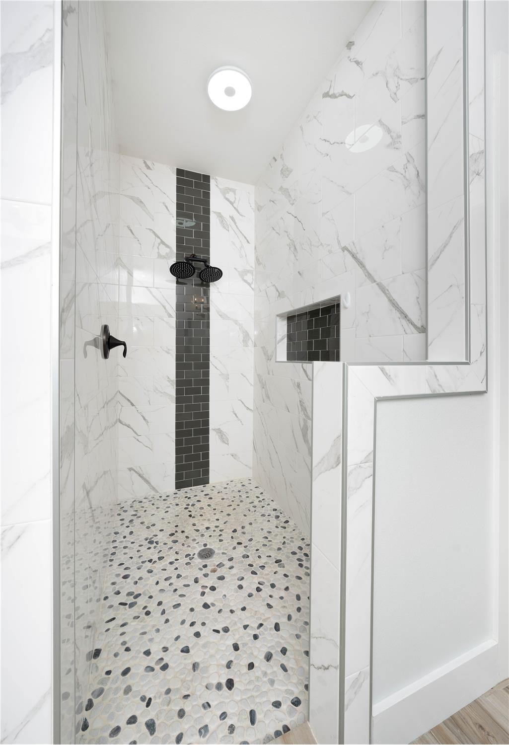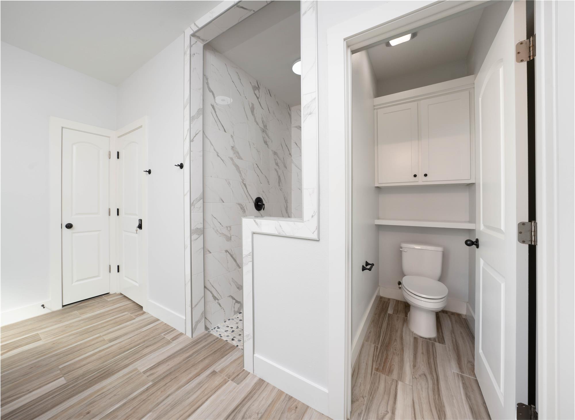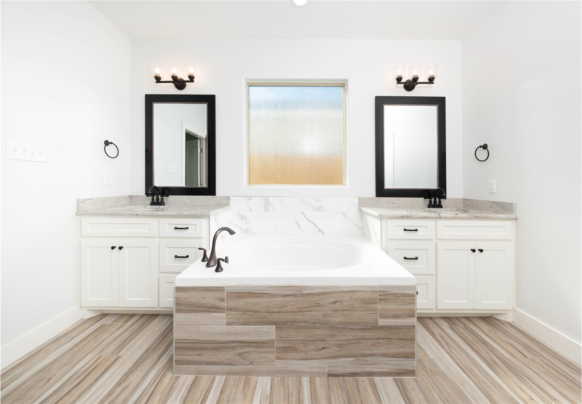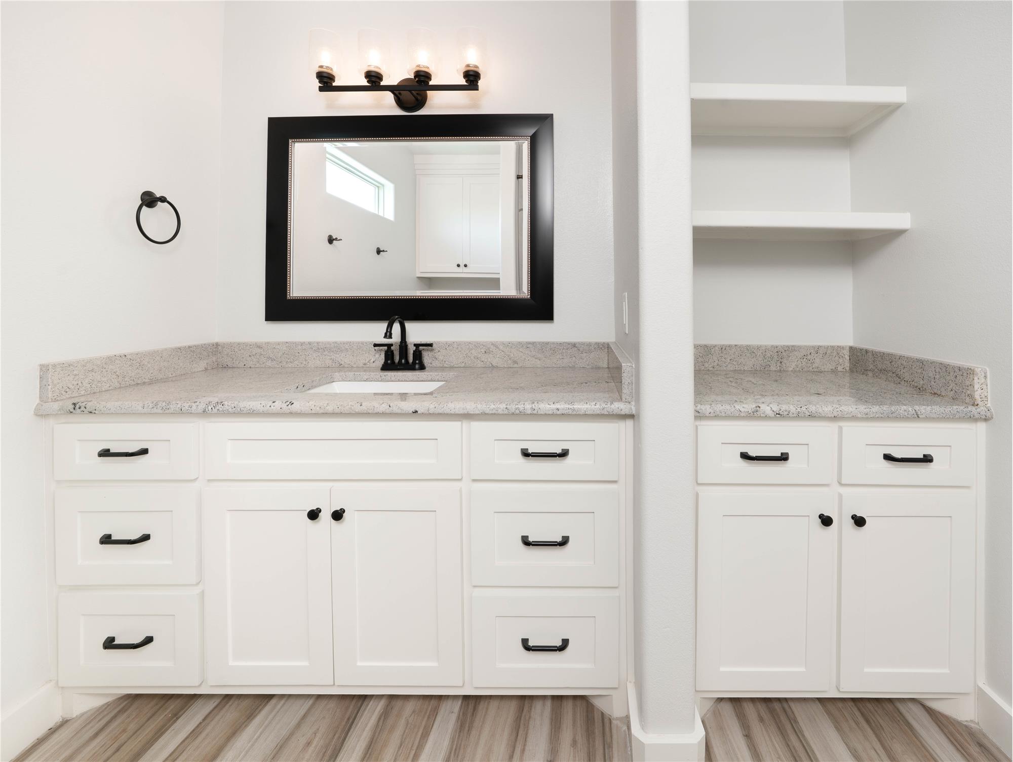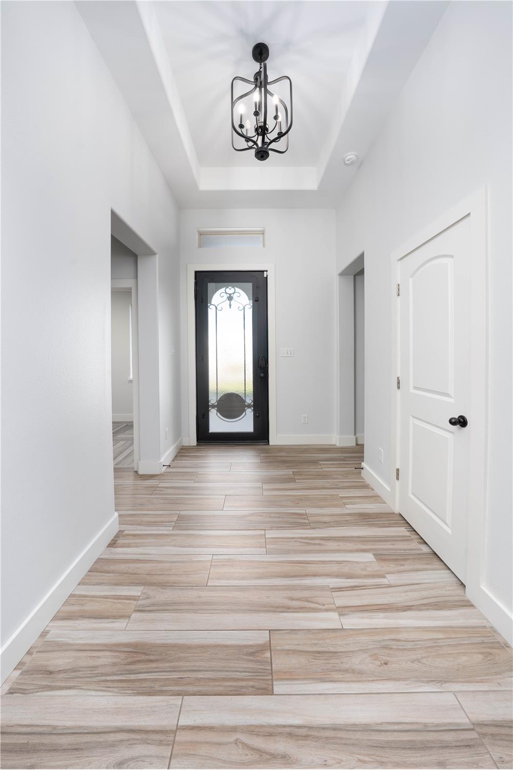 Thoughtfully designed with modern style and everyday comfort in mind, 4802 Del Paseo Dr offers a striking blend of clean architecture and warm finishes in the heart of Corpus Christi. From the moment you arrive, the contemporary exterior and inviting entry to set the tone for what awaits inside. The open-concept floor plan features soaring ceilings, abundant natural light, and wood-look tile flooring that flows seamlessly through the main living areas. At the center of the home is a show-stopping kitchen designed for both function and entertaining, complete with an oversized island, stone countertops, extensive white cabinetry, built-in stainless appliances, gas cooktop with vent hood, and a bold designer tile backsplash that adds texture and visual interest. Pendant lighting and recessed fixtures enhance the bright, airy feel while providing a polished, modern touch.