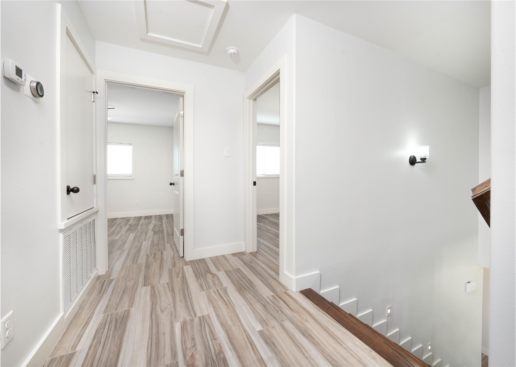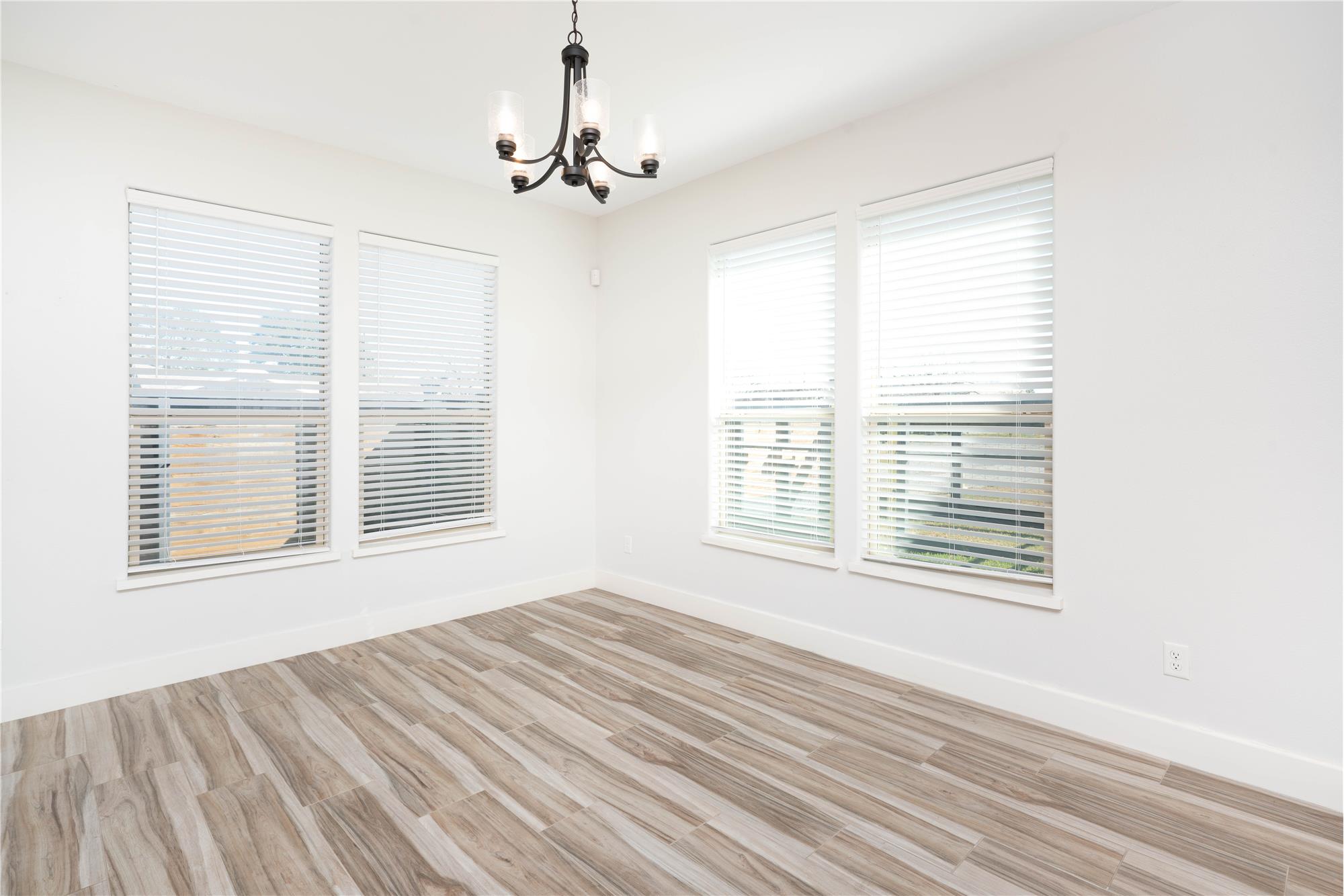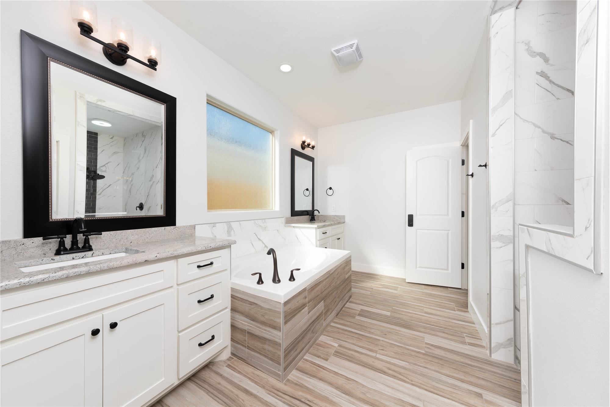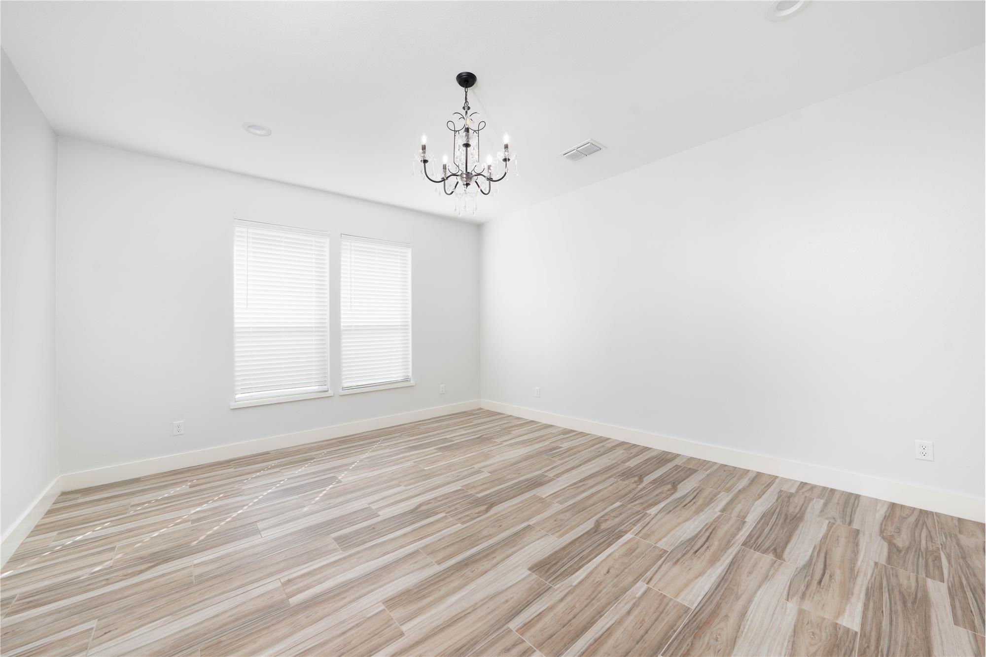 The living area is equally impressive, showcasing custom built-ins and a warm wood accent wall that creates a natural focal point and ideal space for gathering or relaxing. A spacious dining area with stylish chandelier lighting overlooks the backyard, offering an inviting setting for everyday meals or special occasions. The primary suite provides a private retreat with generous space and a spa-inspired bath featuring contemporary finishes, a soaking tub, and a walk-in shower. Additional bedrooms are well-sized with clean lines, modern lighting, and ample closet space, offering flexibility for guests, home office, or family living.