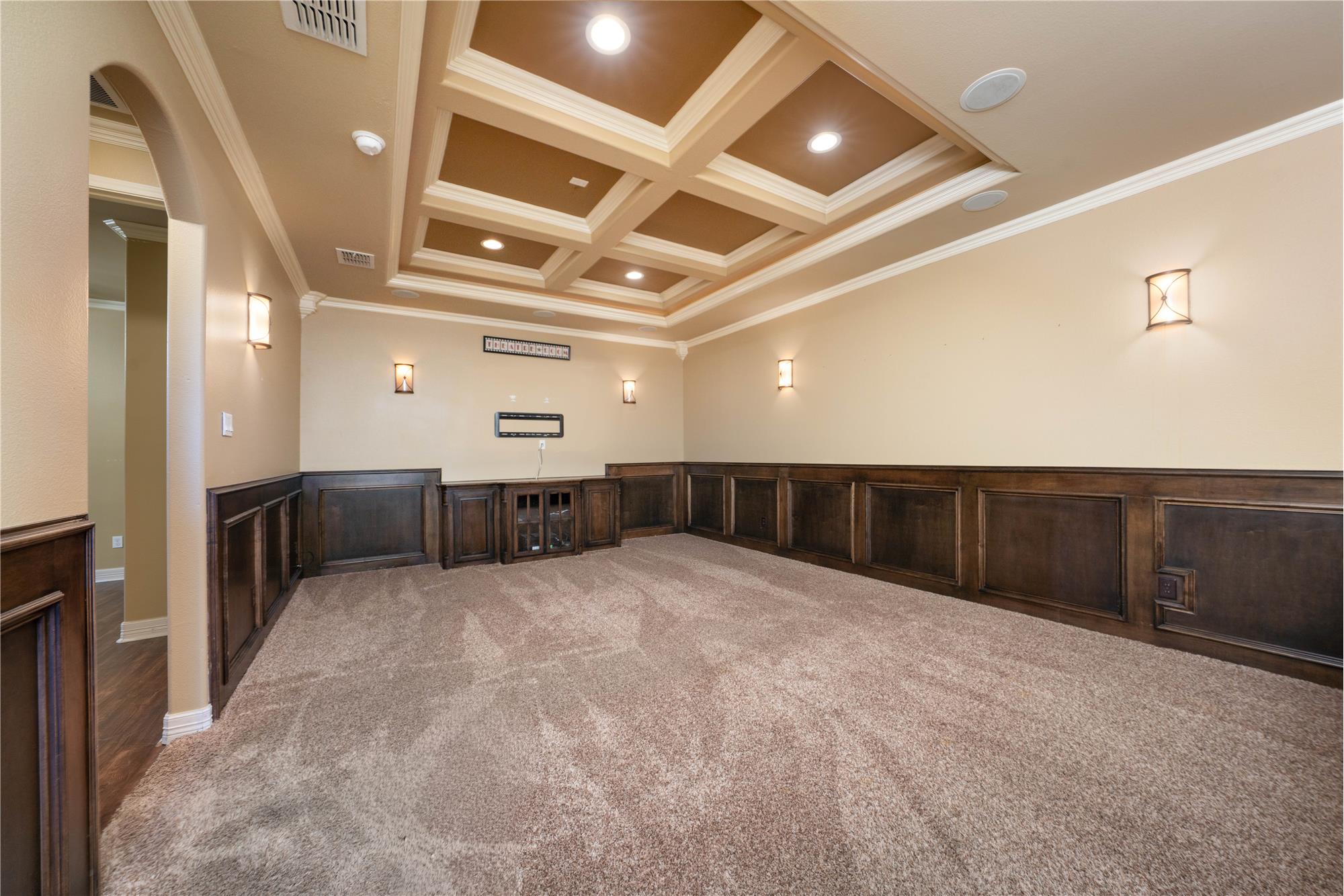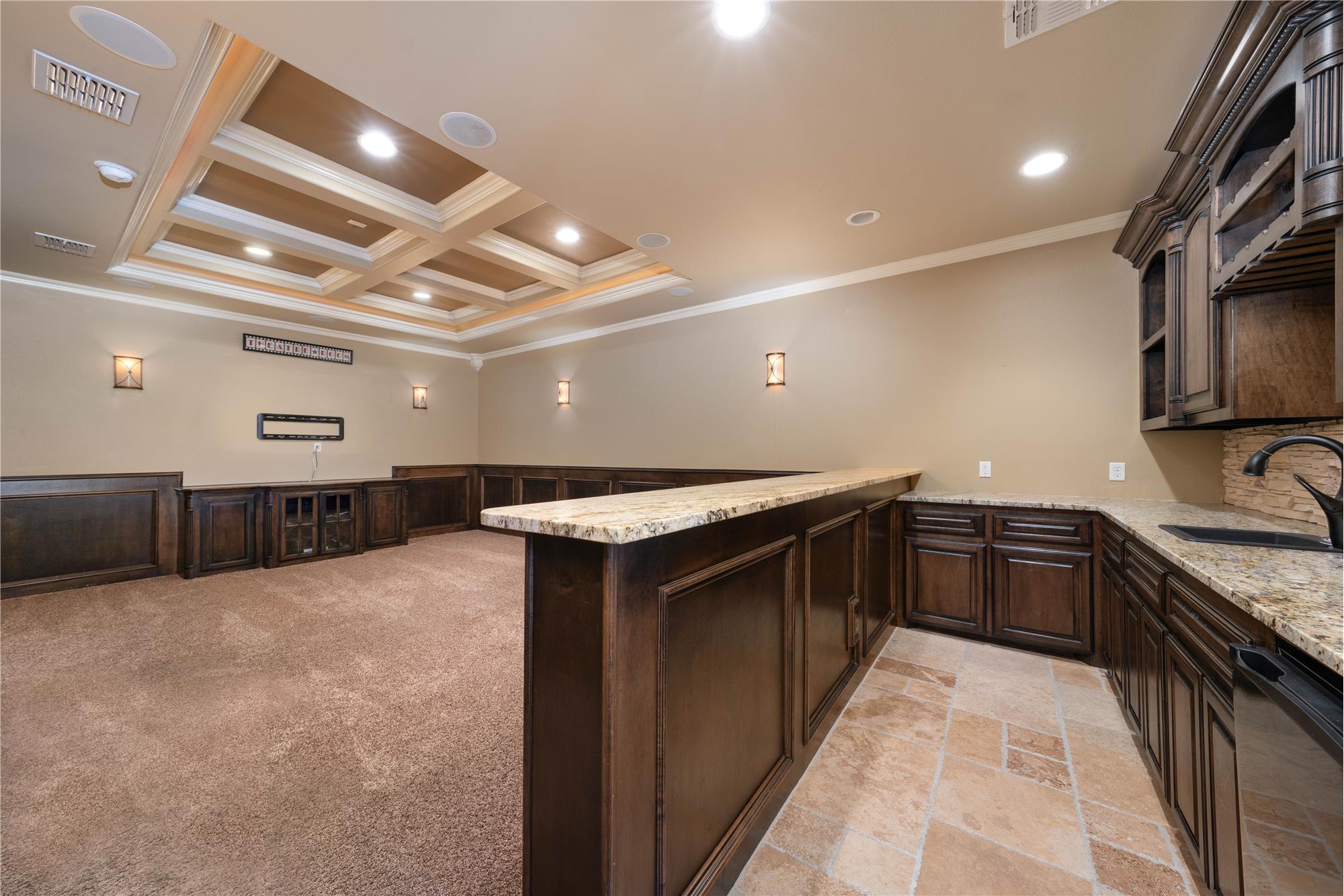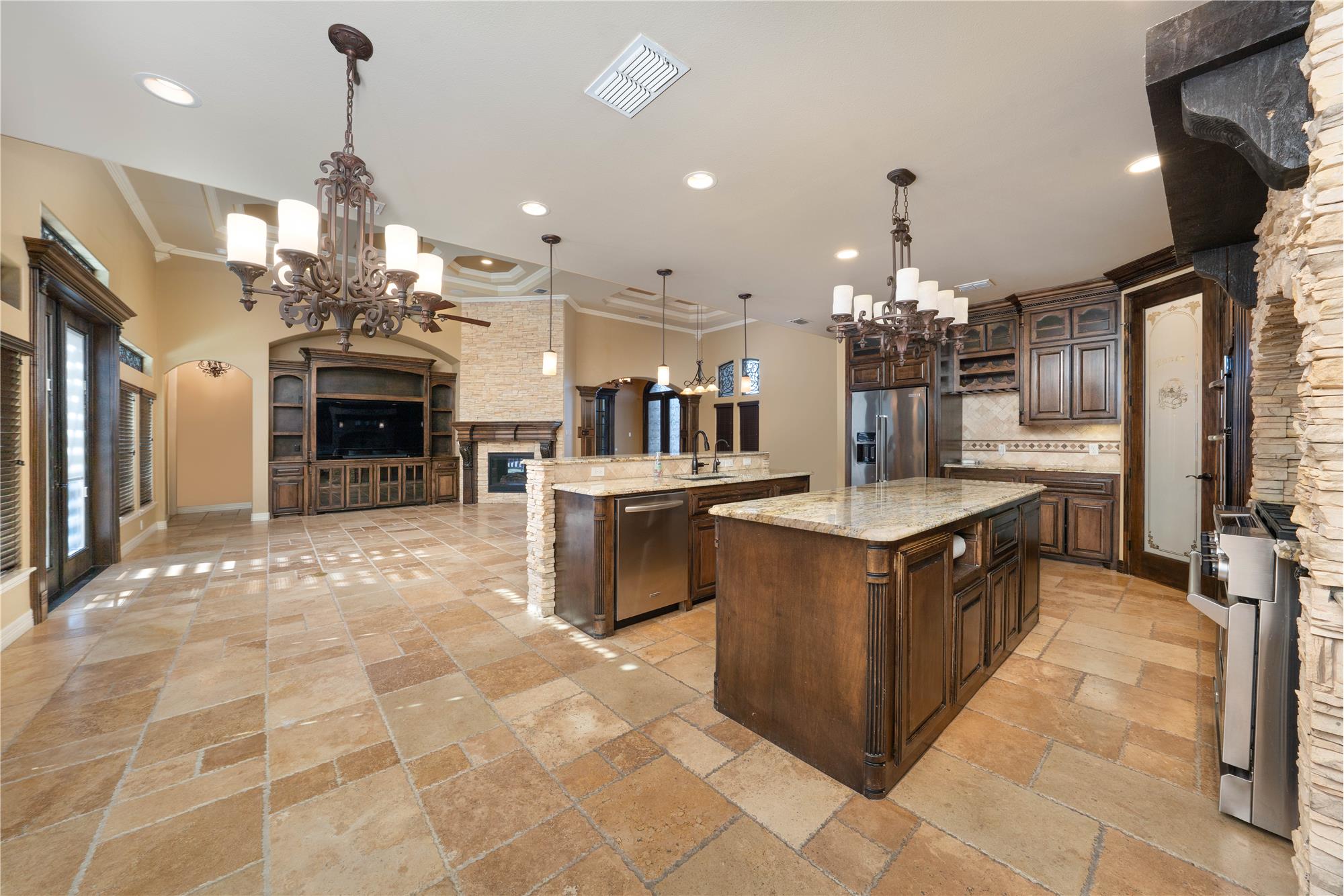 The heart of the home is the chefs kitchen, featuring rich custom wood cabinetry, granite countertops, a large center island, double ovens, and a stunning stone surround framing the cooktop. A walk-in pantry with decorative glass door adds both function and charm, while the open layout flows seamlessly into the dining and living spacesperfect for entertaining or everyday living.