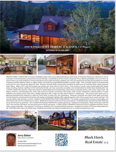 NEW PRICE: PRIVATE FAMILY COMPOUND/35 Acres/2 Buildable Lots/Luxury Retreat/Bordering 4000 Acres of Protected Wilderness Welcome to one of CO's most extraordinary private land offerings--a breathtaking 35-acre estate comprised of Two Adjoining Buildable Lots (20 acres + 15 acres), each entitled for a primary residence and an accessory dwelling unit. This rare opportunity provides the foundation for a family compound, private wellness retreat, or legacy estate, surrounded by unparalleled mountain views. Unrivaled Location and Views at the end of a one-mile private dead-end road, discover a ...