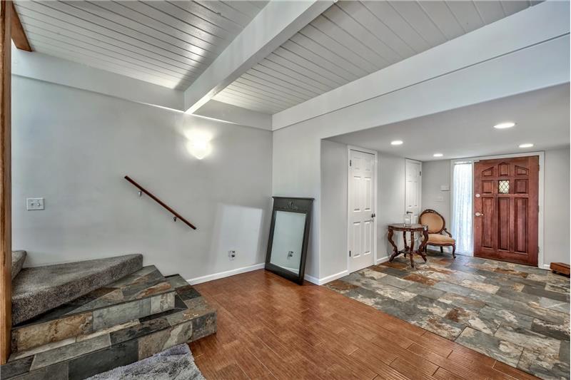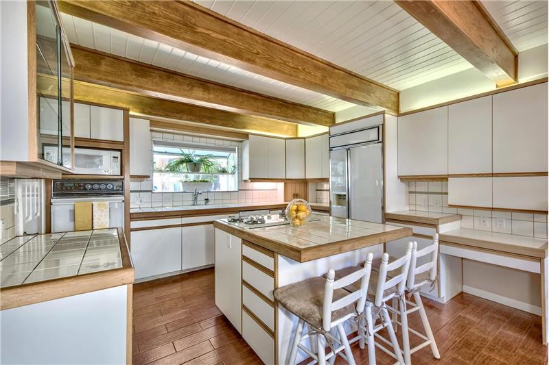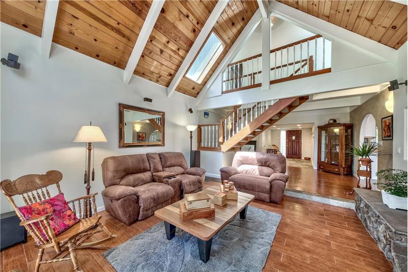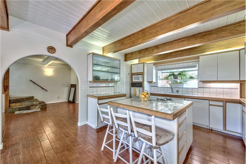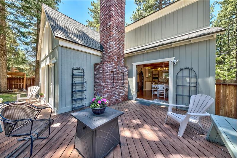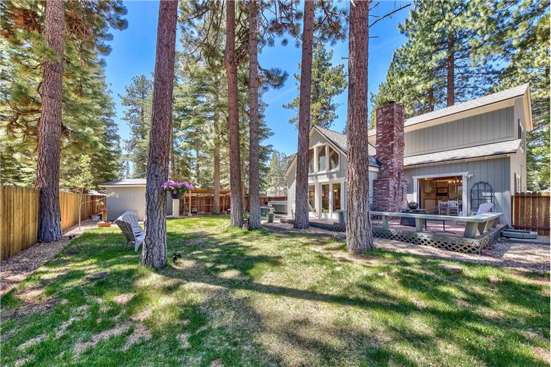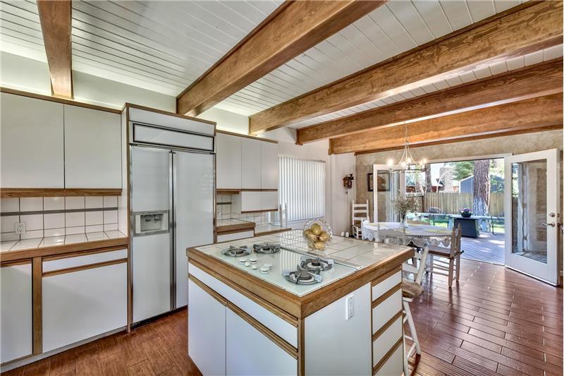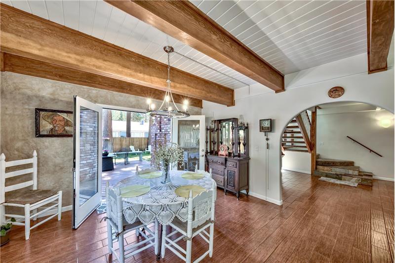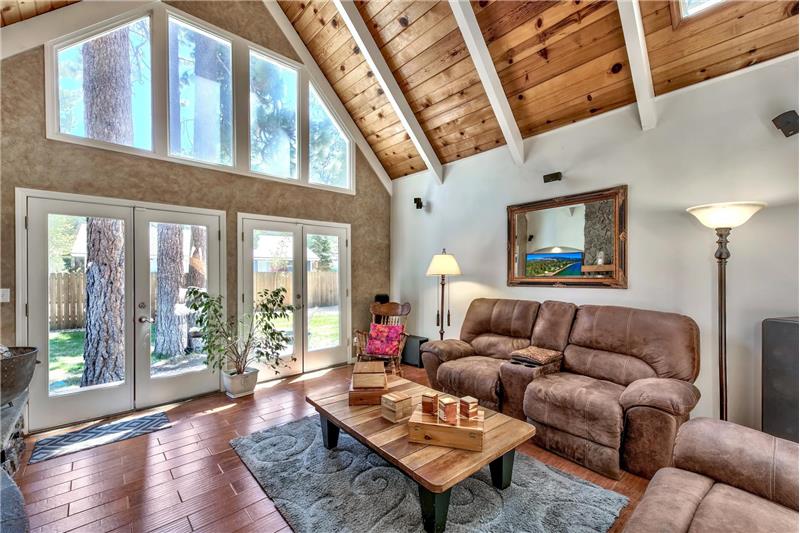Looking for a gorgeous property in the county of South Lake Tahoe? This luxurious home boasts vaulted ceilings with open beams throughout and is located in the highly sought after Montgomery Estates neighborhood with a conservancy lot next door and surrounded by forest, meadow, and hiking trails. A paver driveway, large front deck, and slate entry welcome you in. Natural light abounds with a skylight in the living room and French doors that lead to one of three decks. The open kitchen and dining area is nice and airy complete with a walk-in pantry, double oven, and another set of French doors