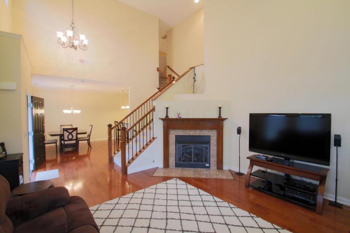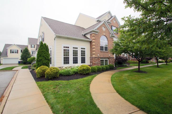 Sophisticated 3 BR floor plan offers 9' ceiling master suite w/ luxury bath inc jetted tub & walk in closet w/ organizers. Impressive great room with soaring ceilings & walls of windows, cozy gas log fireplace. Large loft/office. Formal dining room w/ open concept! Spacious dine in kitchen w/ 42' cabinets w/large pantry, granite counters, tile back splash & stainless appliances. Hardwood floors on the entire first floor. Finished rec room w/ egress window. Enjoy your private patio. Worthington Ohio community minutes from Bluffviews Elementary/convenient to shopping, restaurants & more.