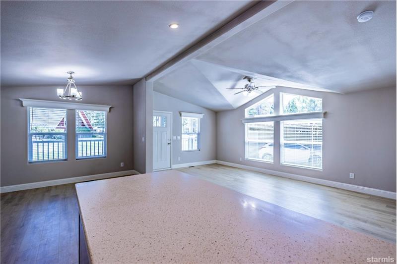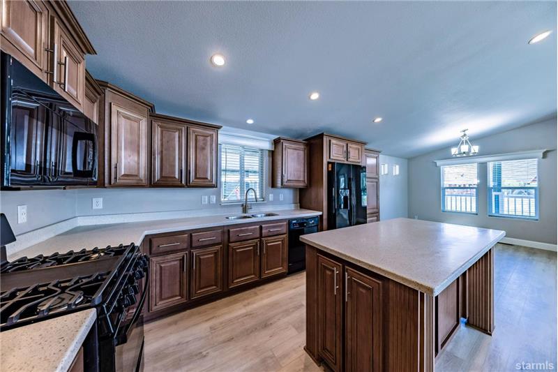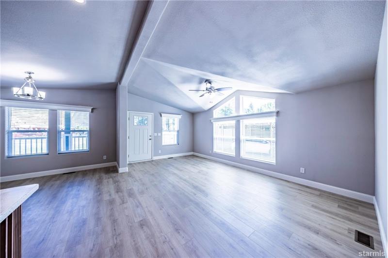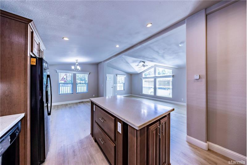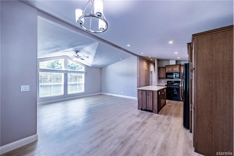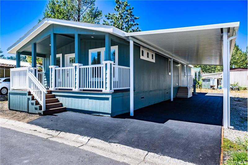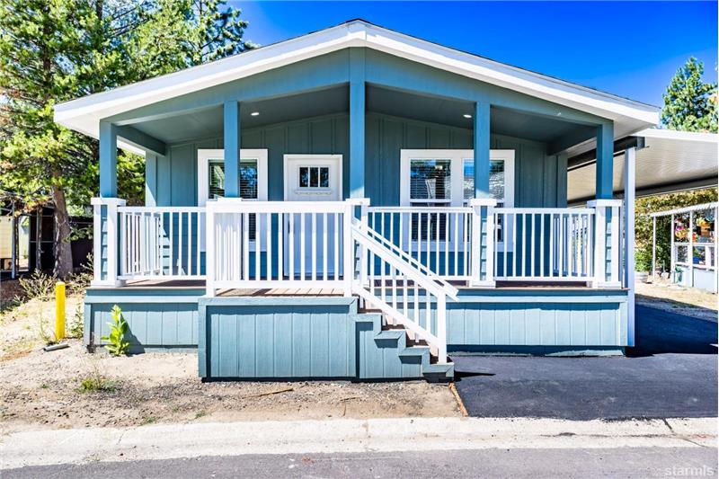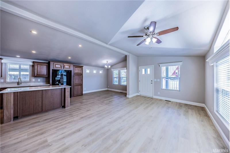 Affordable Tahoe living! Brand new unit that is situated directly across from the Tahoe Verde Mobile Home Parks swimming pool! 1200 square feet. 2 bedroom 2 bath. Vaulted ceilings. Open kitchen, dining room and living room. Center island. Black GE appliances. Solid surface counter tops in the kitchen and bathrooms. Oversized windows. Laminate and carpet flooring. Ceiling fans in the living room and bedrooms. Primary bedroom is large with a walk in closet. Primary bath has double sinks with a big shower. Separate laundry room. Parking for 2 cars in the carport.