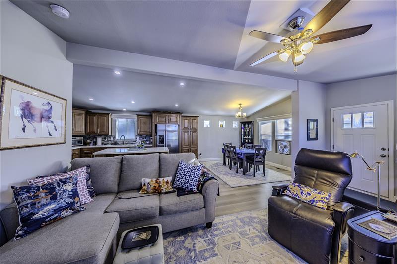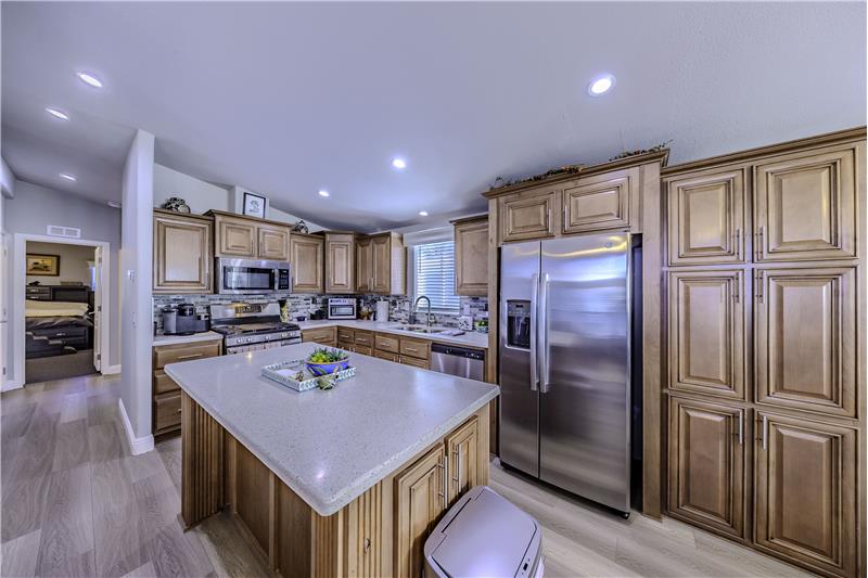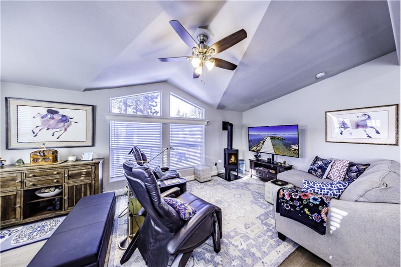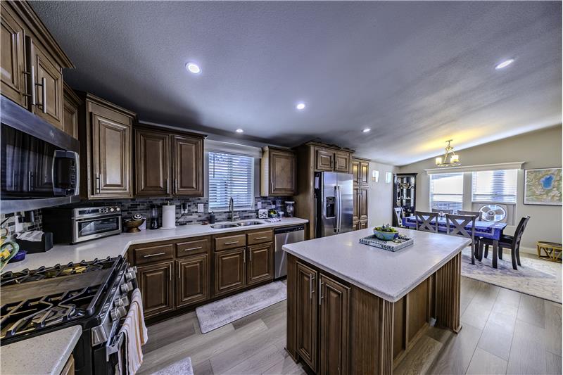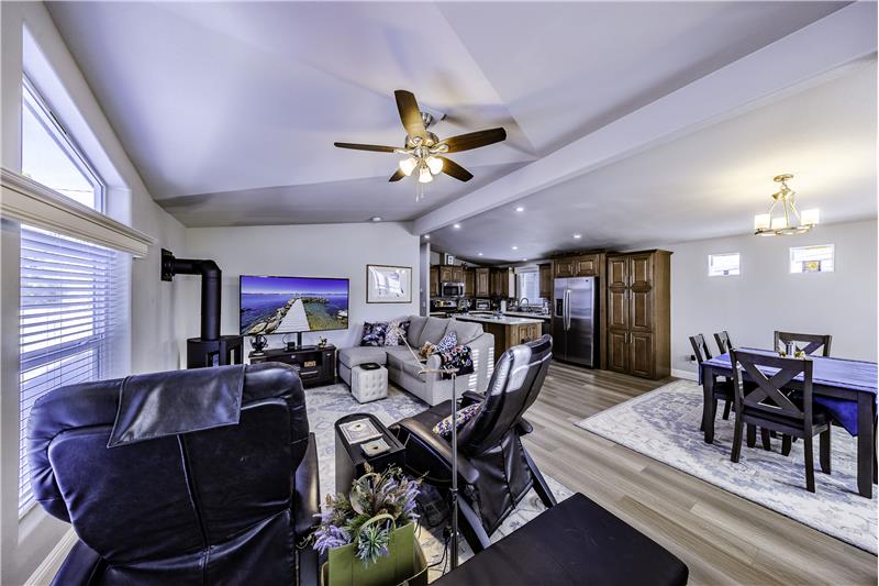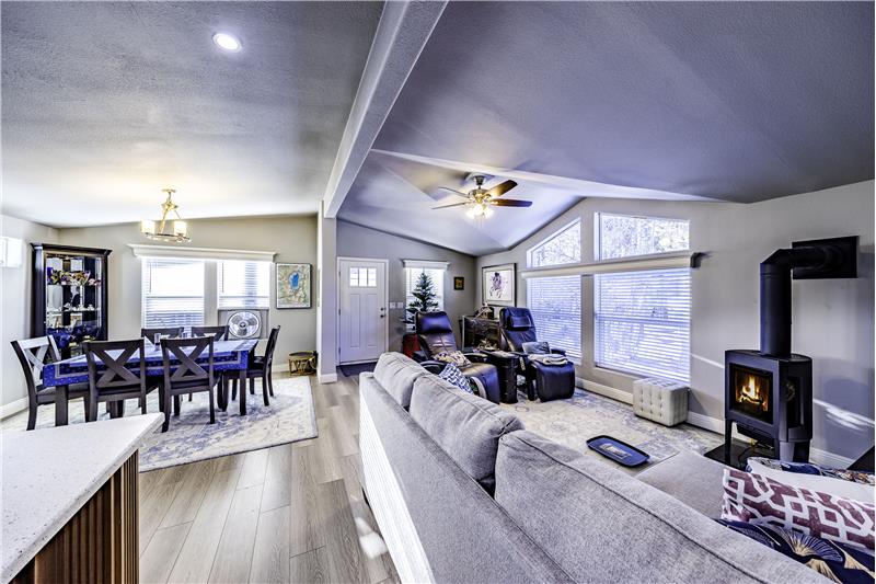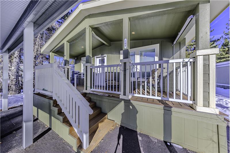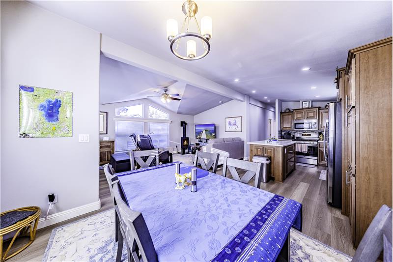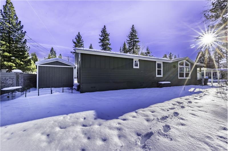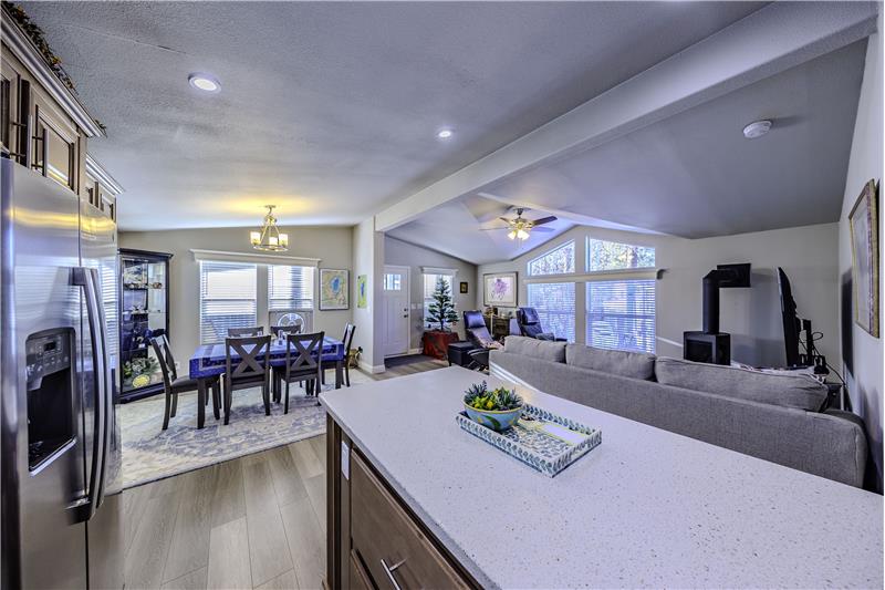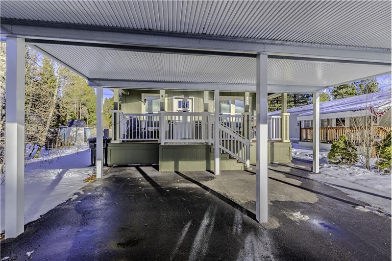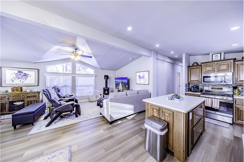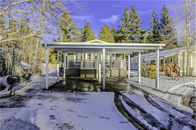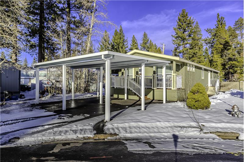 Built in 2021 and situated on one of the parks largest lots is a 2 bedroom 2 bath beautiful manufactured home located in the city of South Lake Tahoe. Large covered front porch with an added sunshade. Inside are vaulted ceilings throughout with oversized windows to let in all the natural sunlight. Open concept kitchen, dining room and living room are great for family gatherings and entertaining. Top end Jotul freestanding gas fireplace in the living room. The kitchen has stainless steel appliances along with quartz countertops and a big center island with additional seating.