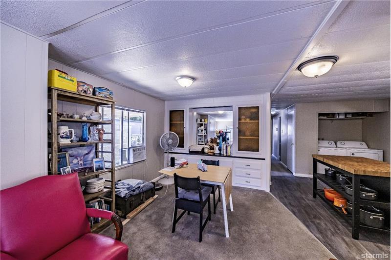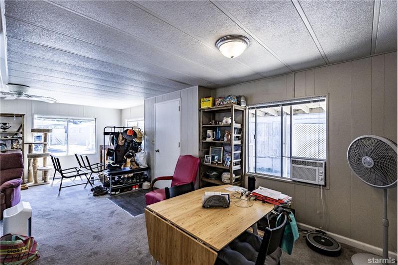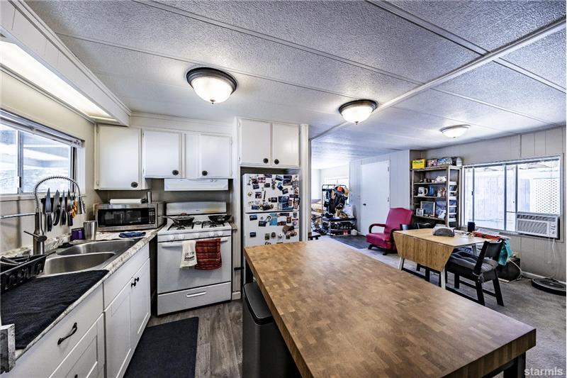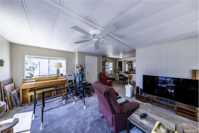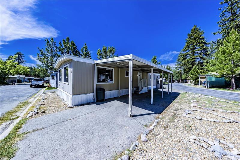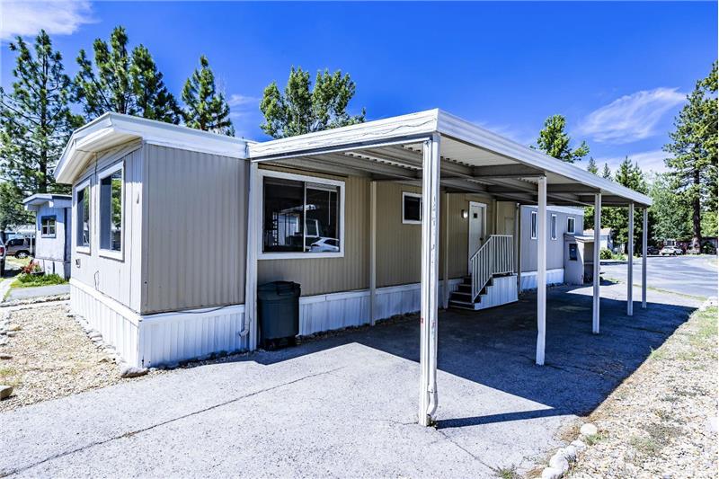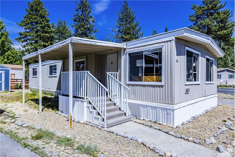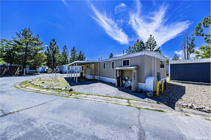 Affordable Lake Tahoe living. This manufactured home needs a little tlc but is priced to sell! The 2 bedroom 2 bath unit is situated on a nice corner lot. 1200 square feet of space and has a good floorplan. An inviting covered front porch leads into the open living room, dining room and kitchen areas. Center kitchen island. Laundry area off the kitchen. Tankless hot water heater. Primary bedroom and bathroom with lots of closets. Newer membrane roof. Rare drive through carport for 2 cars with an additional parking area. Large Tuff Shed for all your seasonal items storage.