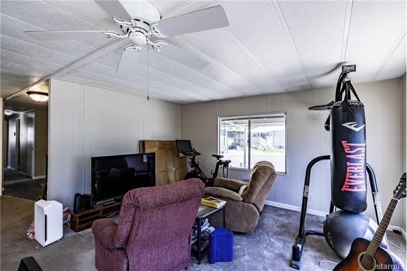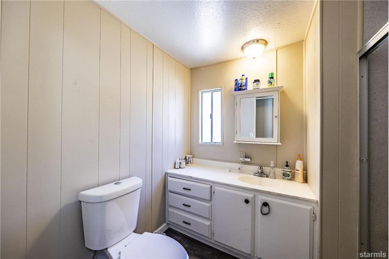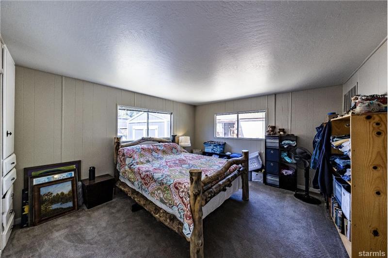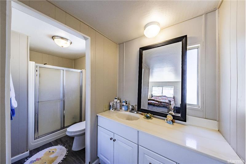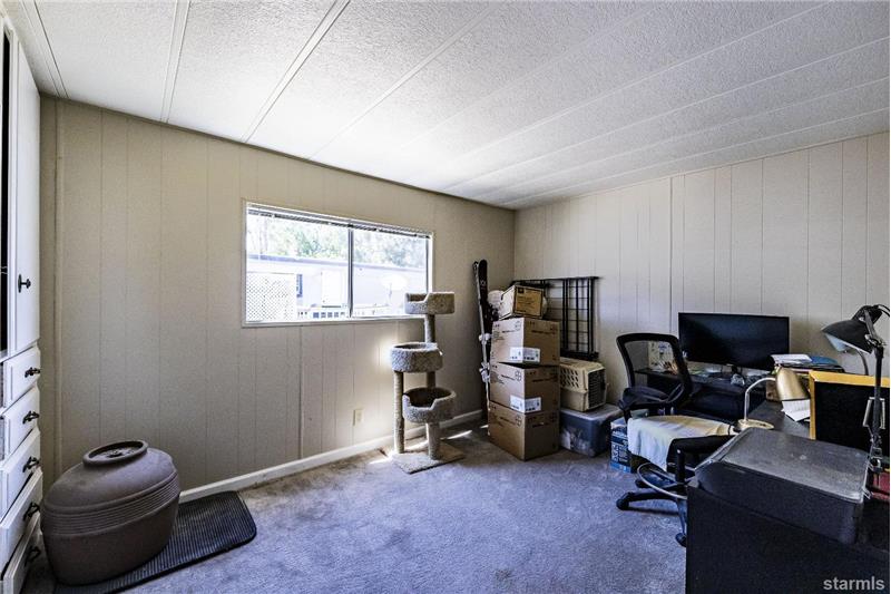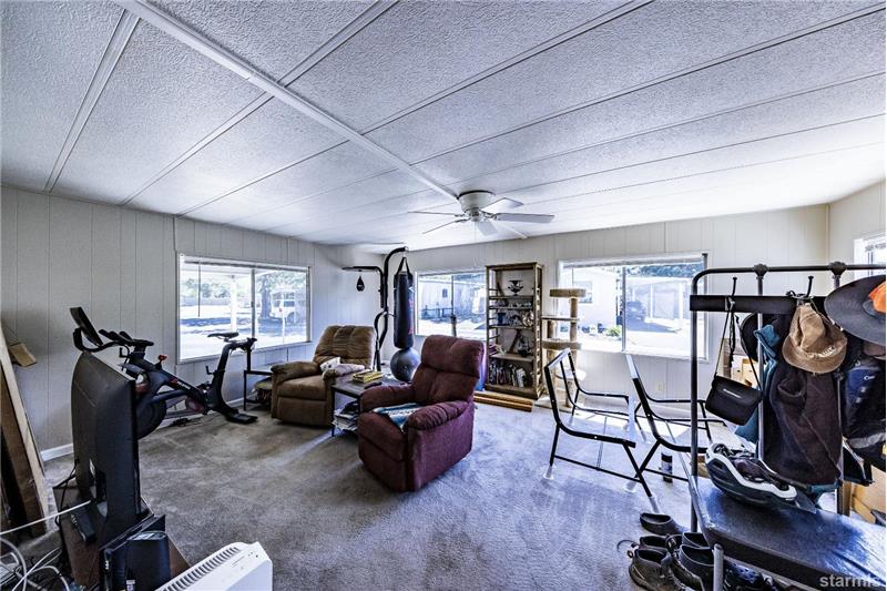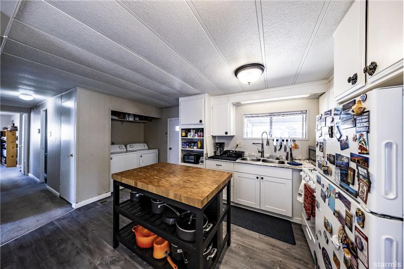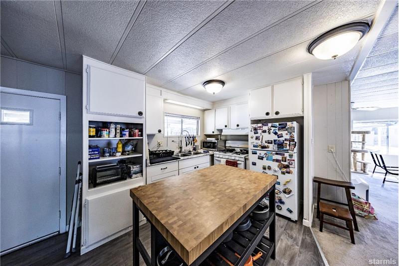 Affordable Lake Tahoe living. This manufactured home needs a little tlc but is priced to sell! The 2 bedroom 2 bath unit is situated on a nice corner lot. 1200 square feet of space and has a good floorplan. An inviting covered front porch leads into the open living room, dining room and kitchen areas. Center kitchen island. Laundry area off the kitchen. Tankless hot water heater. Primary bedroom and bathroom with lots of closets. Newer membrane roof. Rare drive through carport for 2 cars with an additional parking area. Large Tuff Shed for all your seasonal items storage.