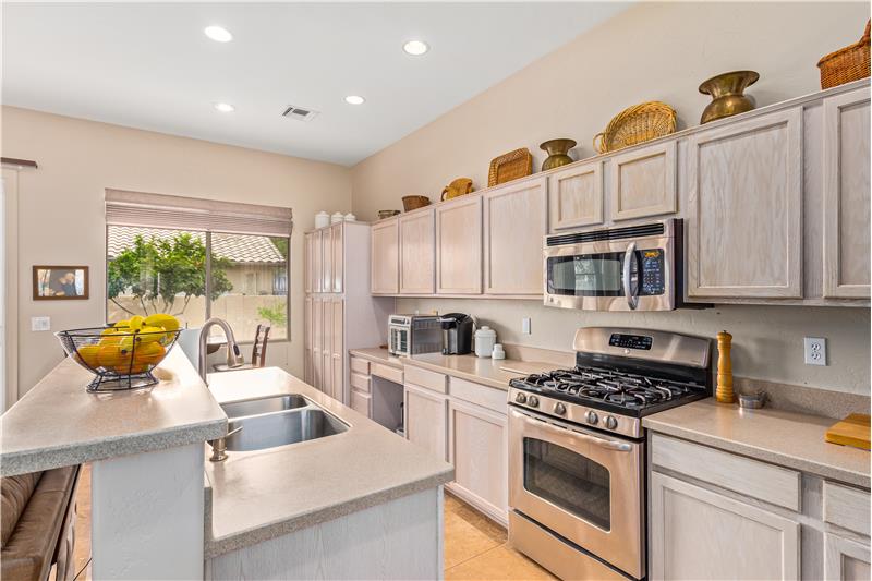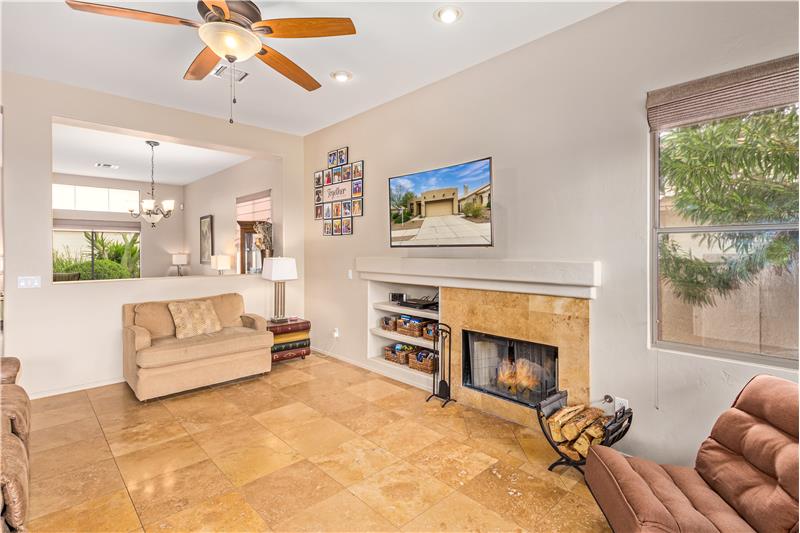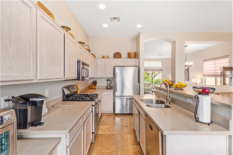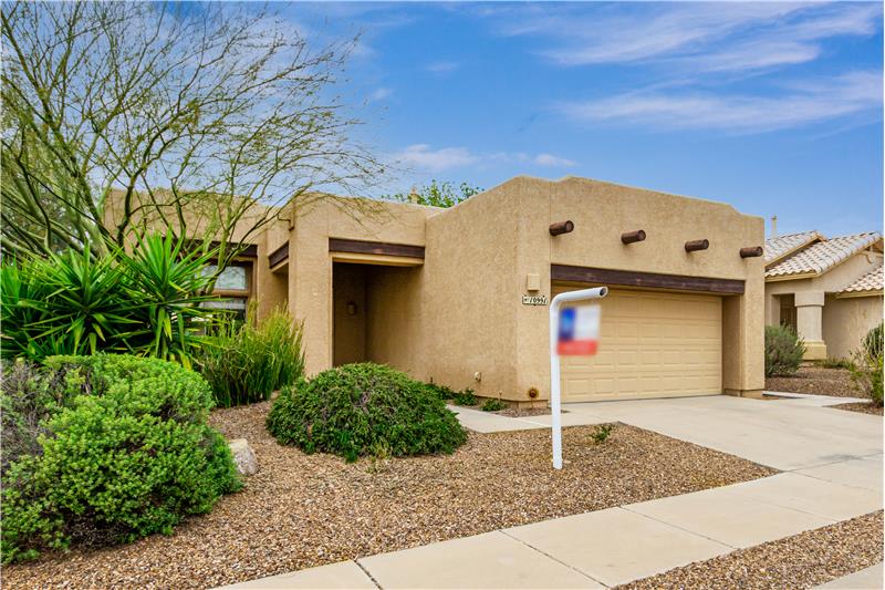 Great location in Oro Valley! Updated home with pleasant color tones in a open floorplan , Light & Bright with lots of windows viewing backyard, updated kitchen to family room featuring quartz counters and newer GE gas range. All Appliances Included! The open floorplan features lots of planter shelving, arched doorways, plus both living room and family room with a gas fireplace, ceiling fans throughout, and custom window treatments. Master bath has garden tub and separate shower and hall bath newly remodeled. Garage floors are epoxy coated and have storage utility cabinets.