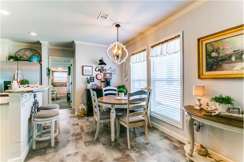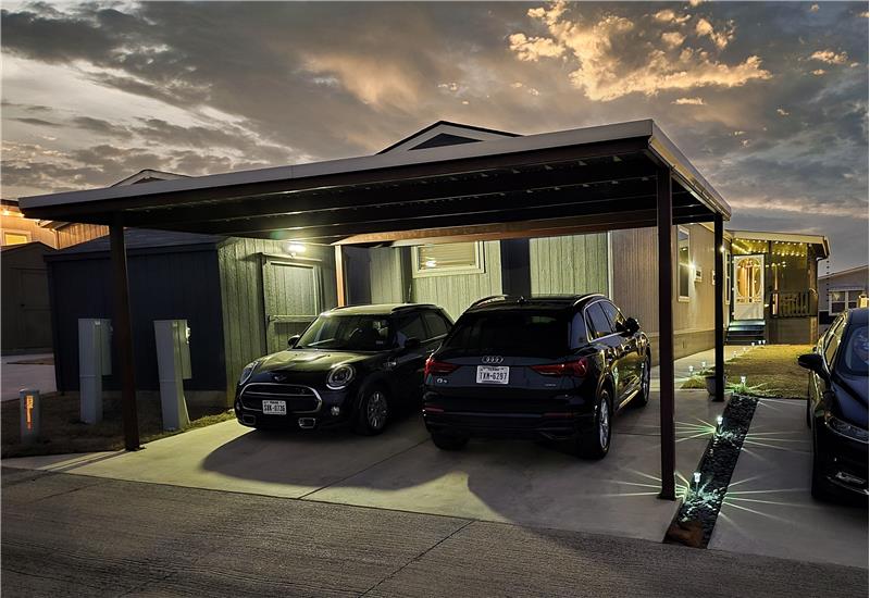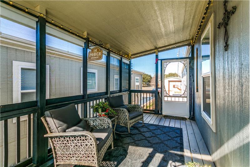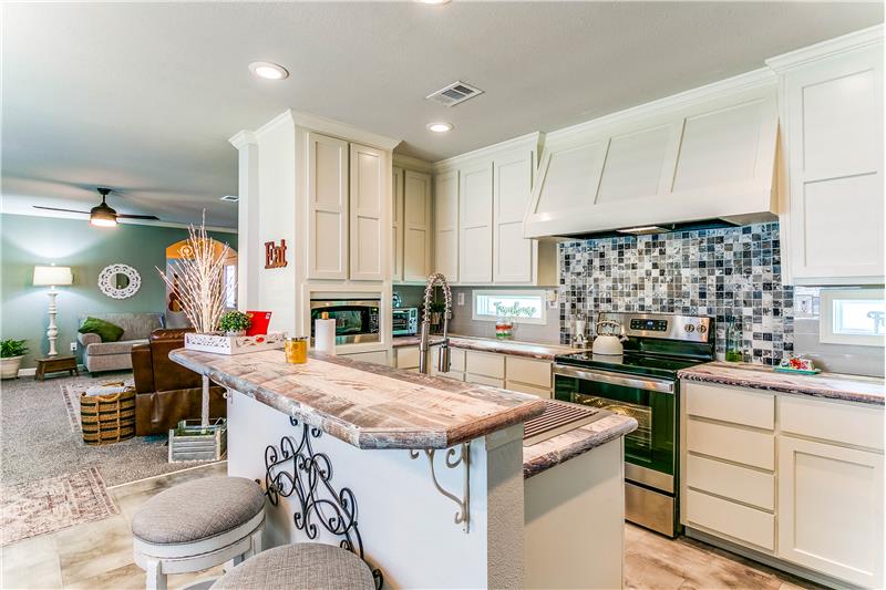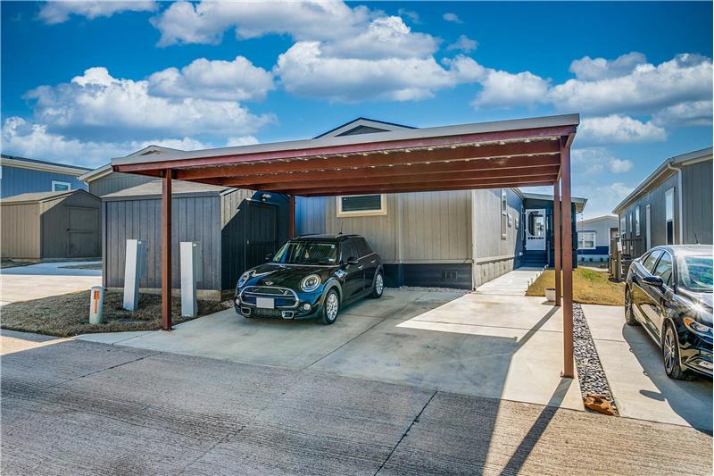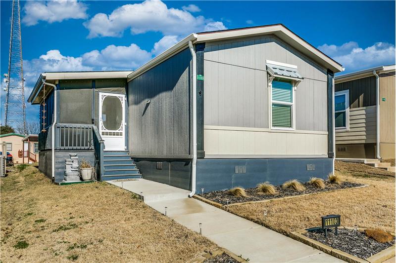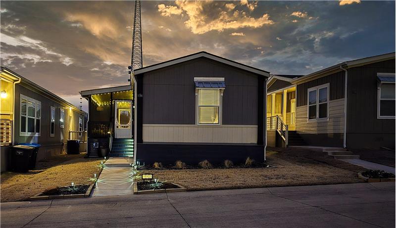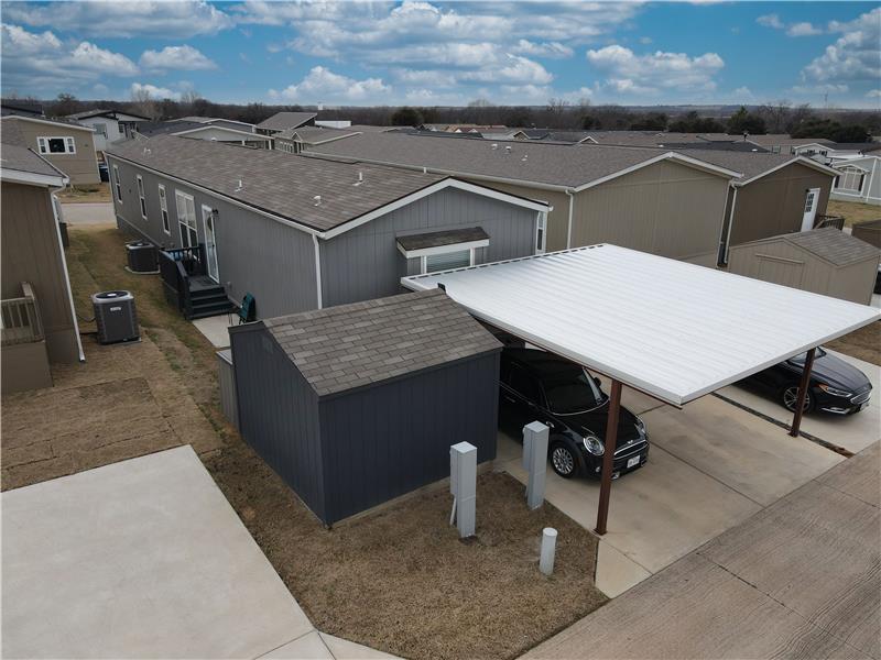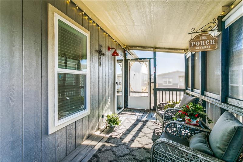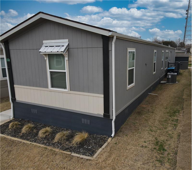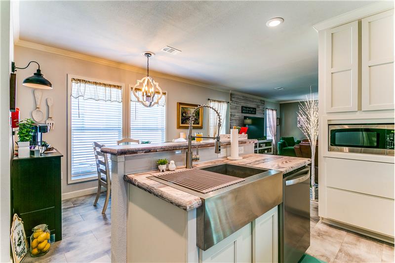 Open House, Sat, 9/27/25, between 1:00 - 3:00 p.m. This stunning home combines modern charm with top-tier functionality! This cute, move-in-ready manufactured home offers luxury & style at an unparalleled value. This 2-bed, 2-bath gem offers too many great features to list – you’ve gotta see it! The kitchen impresses with SS/black appliances (refrigerator, range, microwave, dishwasher), elegant venthood, granite-look Formica countertops, breakfast bar w/corbels, and stunning stone & tile backsplash, huge SS farm sink w/bold faucet having single-handle pull-down sprayer.
