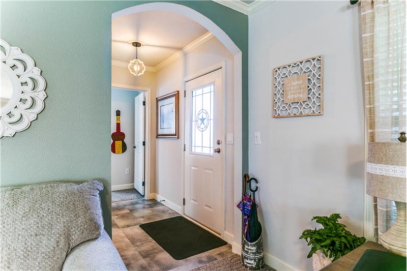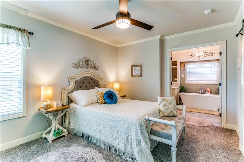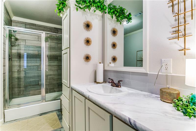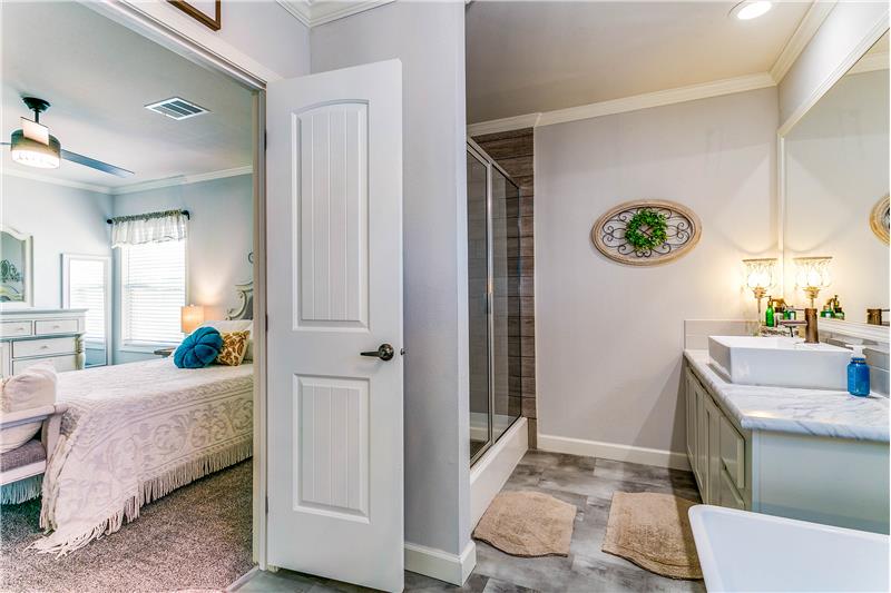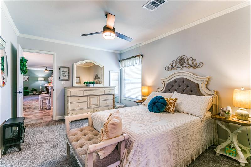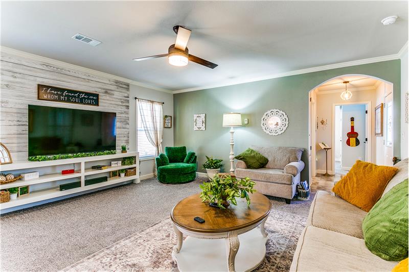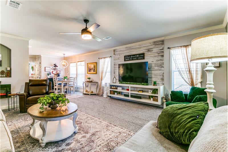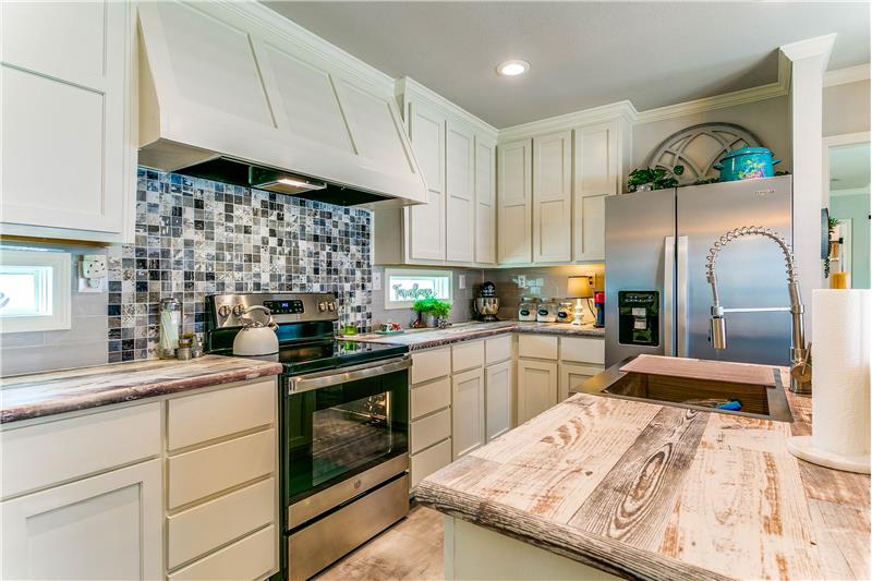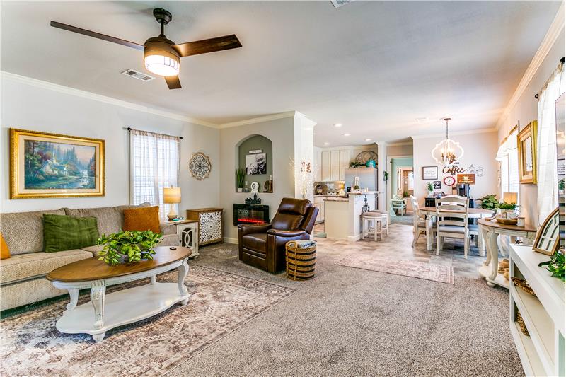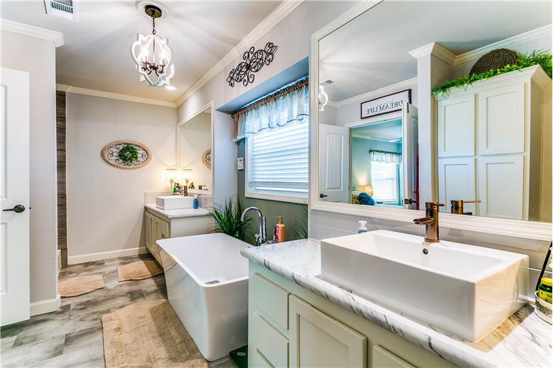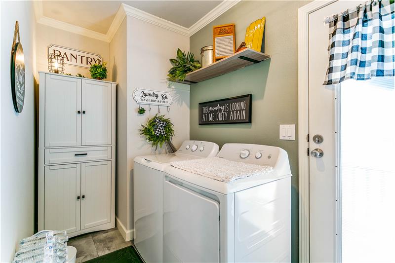 Open House, Sat, 9/27/25, between 1:00 - 3:00 p.m. This stunning home combines modern charm with top-tier functionality! This cute, move-in-ready manufactured home offers luxury & style at an unparalleled value. This 2-bed, 2-bath gem offers too many great features to list – you’ve gotta see it! The kitchen impresses with SS/black appliances (refrigerator, range, microwave, dishwasher), elegant venthood, granite-look Formica countertops, breakfast bar w/corbels, and stunning stone & tile backsplash, huge SS farm sink w/bold faucet having single-handle pull-down sprayer.