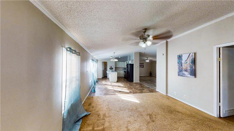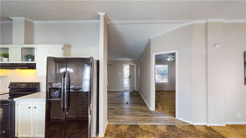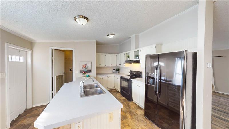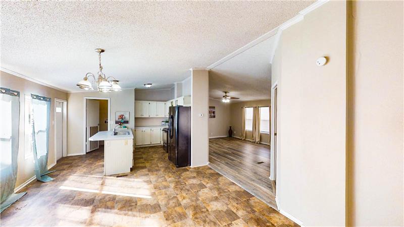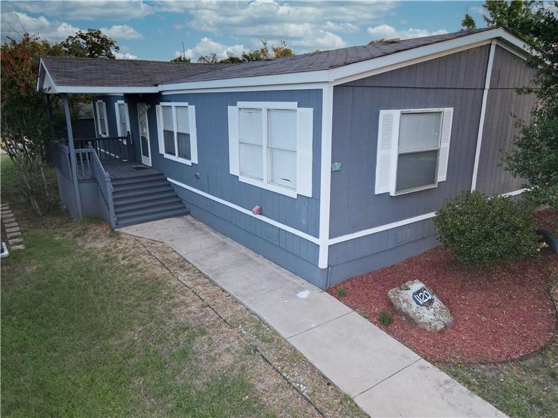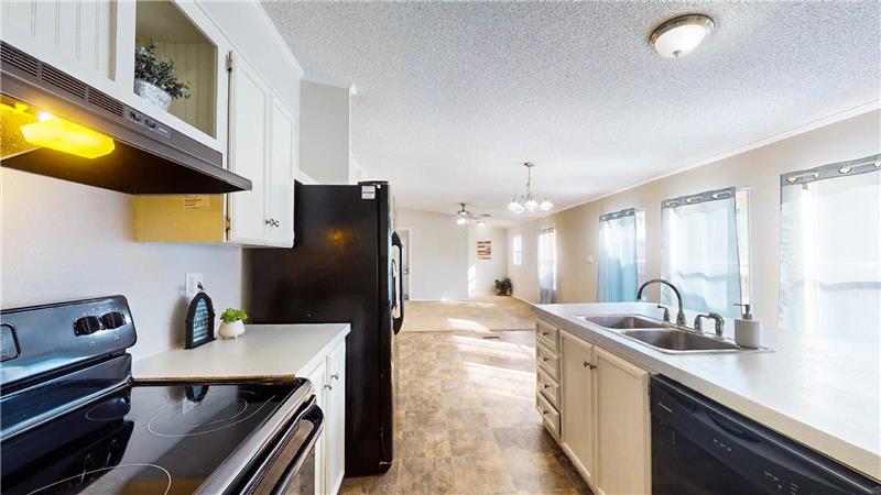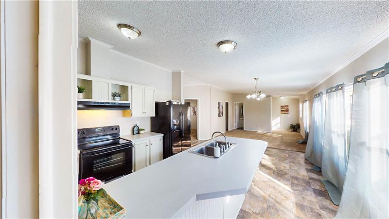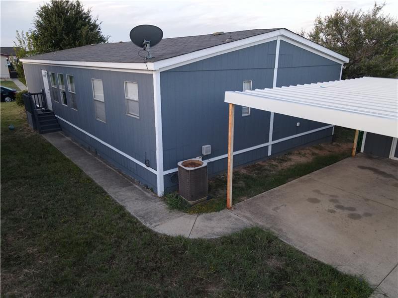 Super affordable (2002) manufactured home in fantastic Harston Woods community. Great features - kitchen has tile-look vinyl flooring, formica counters, lots of cabinets-storage, black appliances & venthood. Kitchen has large island with breakfast bar. Neutral color scheme & modern fixtures throughout. Open floorplan& kitchen opens to living & dining. Ceiling fans & window coverings. Master bath has double vanities, shower, and huge walk-in closet. Several rooms w vaulted ceilings. Separate utility room with shelving. Landscaped lot. 2-car carport; large covered front porch; storage shed!
