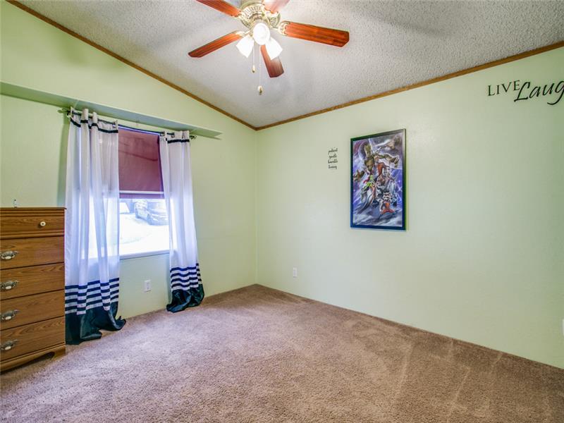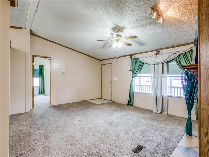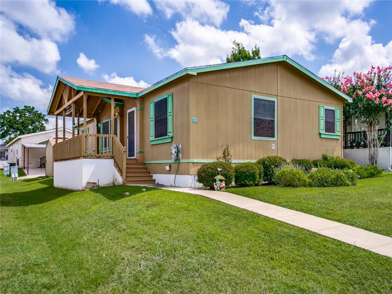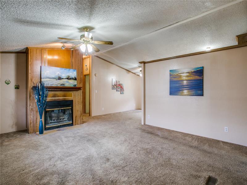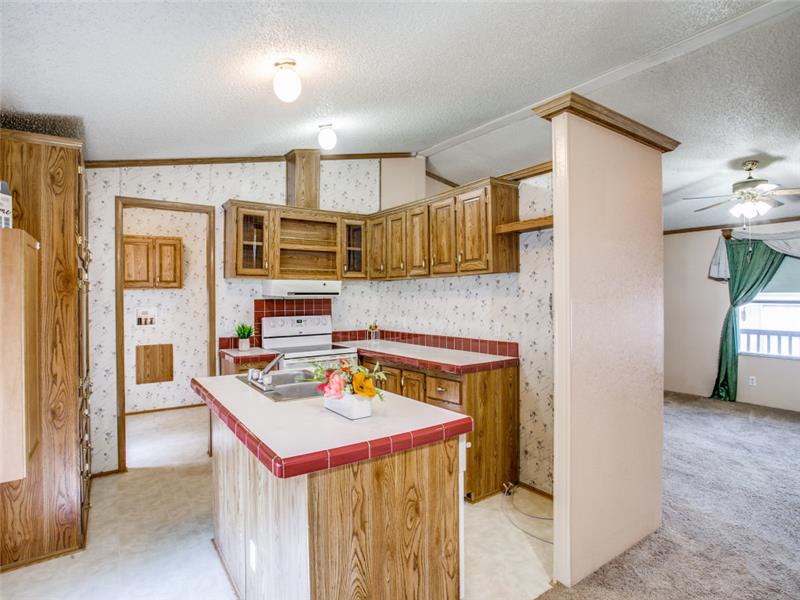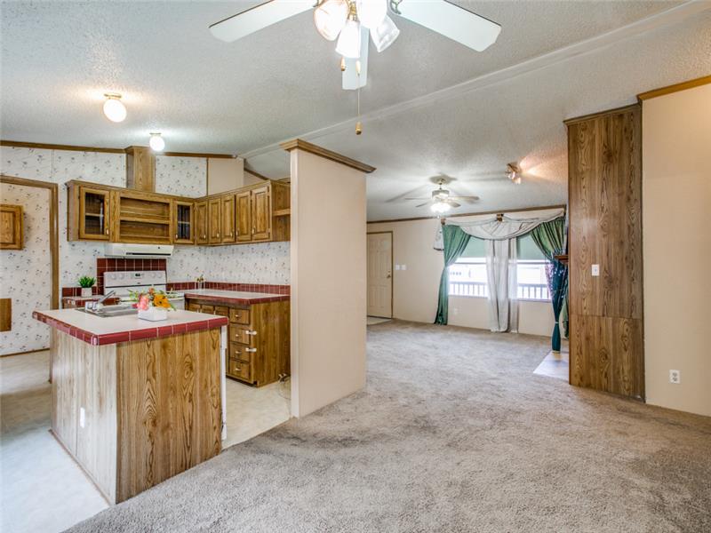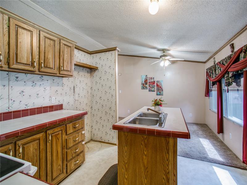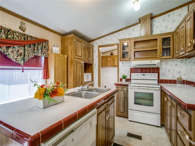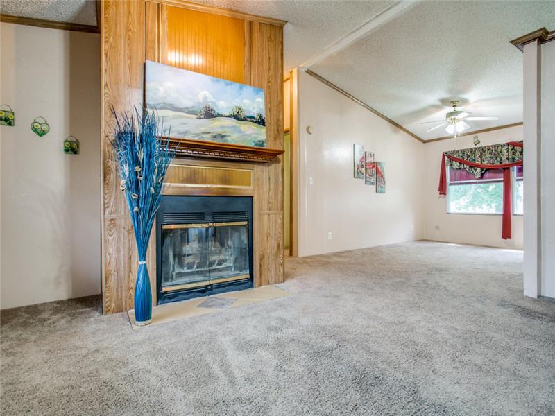Great starter home (1994 manufactured home) in fantastic Harston Woods community! Great features – kitchen has formica & tile counter w/tile backsplash, island + abundant wood cabinets w pulls, vinyl flooring, open to living & dining! Lrg living room w/wood-panel wood-burning fireplace w/tile hearth & wood mantle. Neutral color scheme. Ceiling fans & window coverings. Master bath has double vanities, shower & garden tub, & large walk-in closet; lots of wood cabinets w/pulls. Several rooms w vaulted ceilings. Separate utility room w/cabinets.