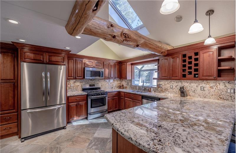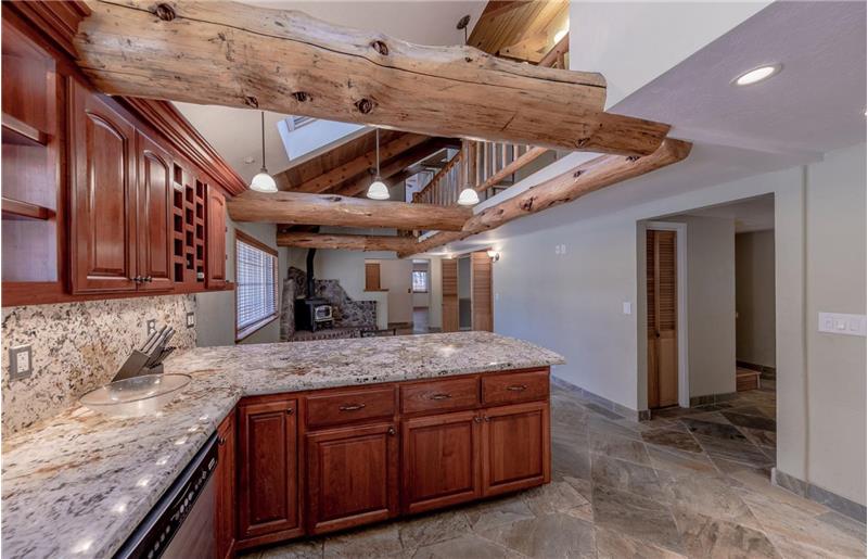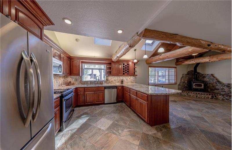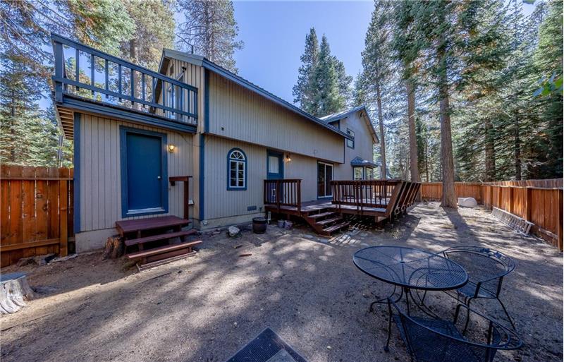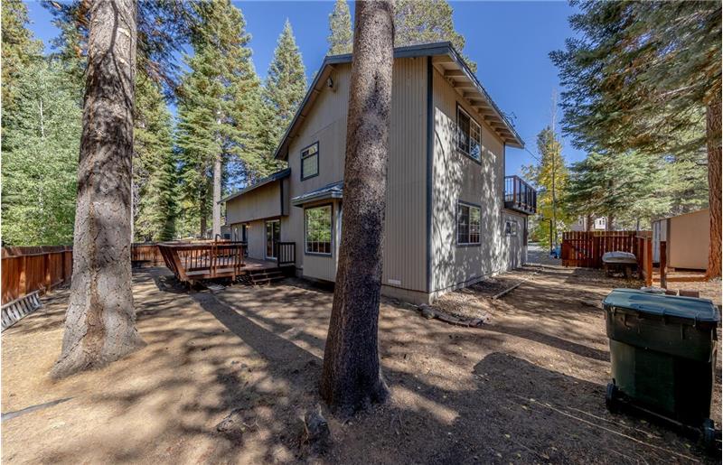 Spacious Tahoe charmer with lots of privacy situated on a huge double lot overlooking national forest and conservancy land. Perfect for a Vacation Rental or a part/full time residence, with plenty of room to park an RV, boat, trailer or other toys. Vast kitchen with granite countertops, cherry cabinetry for plenty of storage, stainless appliances and an adjacent pantry. Freestanding wood stove with river rock surround, hand hewn logs, multiple skylights, slate floors and a laundry room off of the kitchen. Three decks with unique vantage points and a flowing open floor plan
