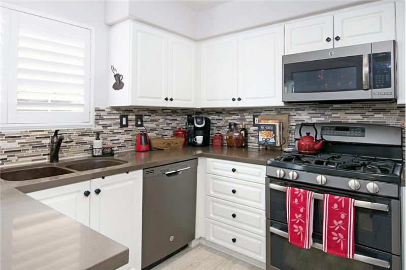 A real dazzler. Upgraded both inside and out this property is sure to please. This end unit townhome is away from the road, with a two car garage and HUGE, HUGE storage area. Inside you will find custom distressed hardwood flooring, plush carpet, plantation shutters, and beautiful custom lighting. The kitchen sparkles with quartz counters, glass/metal and tile finishes. The appliances are all upgraded as well as sink and fixtures. The bathrooms have also been upgraded. The bedrooms are large and spacious, both with walk in closets. This property is move in ready.