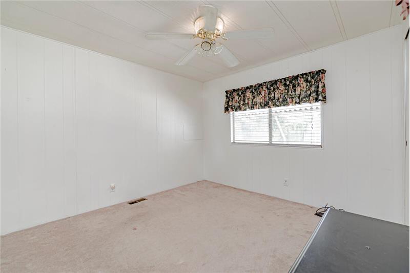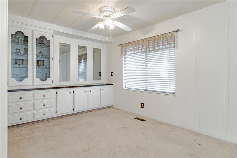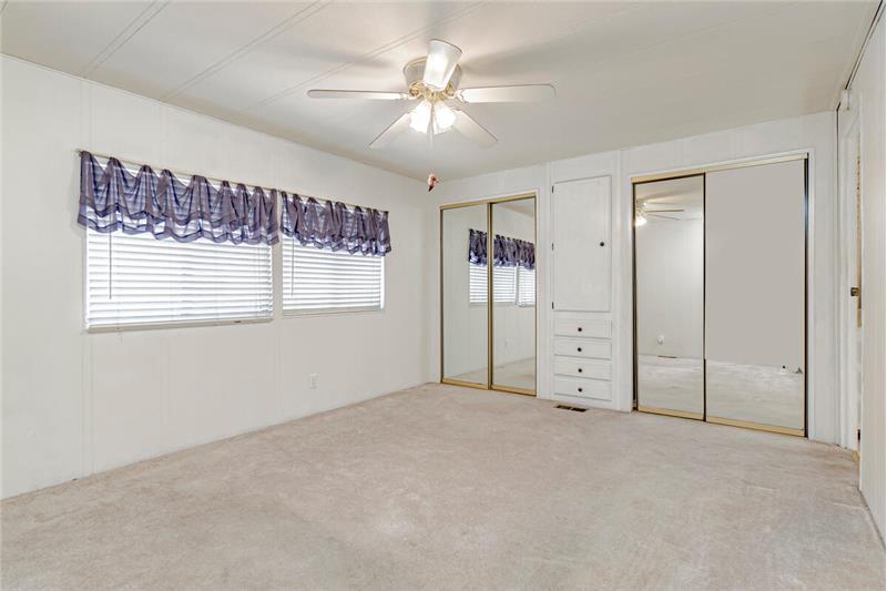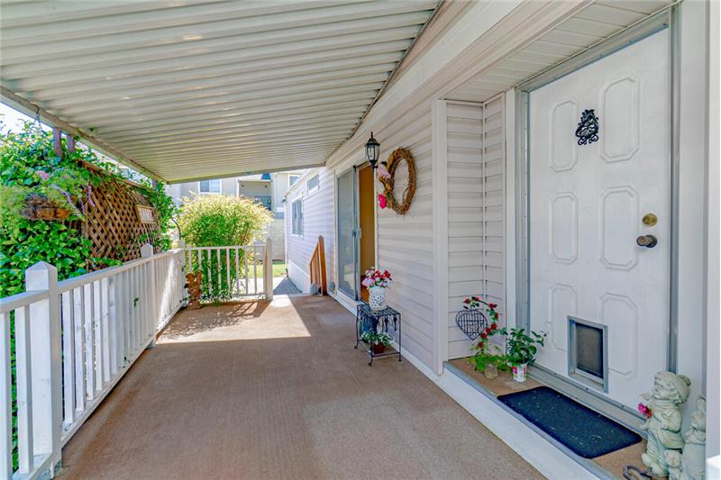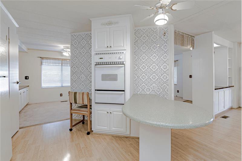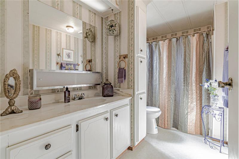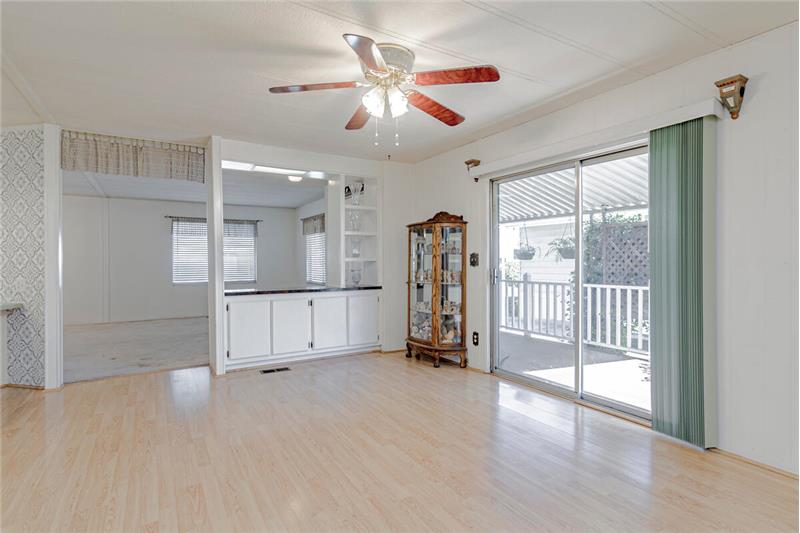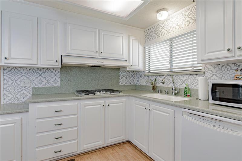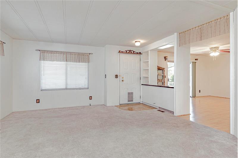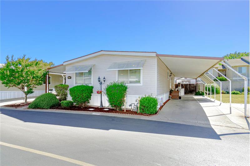 Bright, open floor plan in this sunny double-wide. Spacious great room with built in cabinet storage, large dining area with slider to back porch, two generous sized bedrooms, two full bathrooms, and indoor laundry room with a home-office desk built in. PLUS at the heart of the home an updated kitchen with solid-surface counters, stylish backsplash wallpaper, five-burner gas stove, oven with warming drawer, large pantry, abundant cabinet space for storage, and wood laminate flooring. Outside you'll love the back lawn, storage shed, and covered porch for relaxing. Enjoy a simpler life...