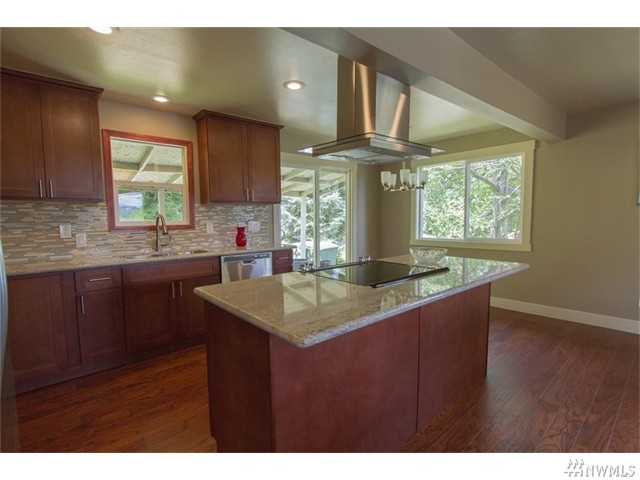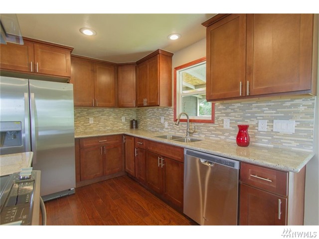 Beautifully remodeled home features 3 beds 2 full baths wood floors and nearly 1200 sq ft of living space. Gorgeous kitchen features granite slab counters, island, full back-splash and stainless steel appliances. Bathrooms include granite slab counters and tile showers with mosaic. Very convenient location a stones throw away from downtown Seattle and light rail station. Huge lot backs up to a green belt for privacy and a driveway big enough for several cars and a boat/RV. Territorial/Mnt View