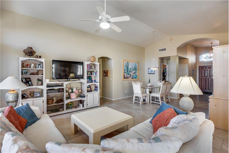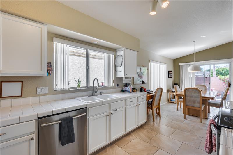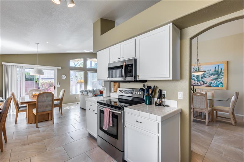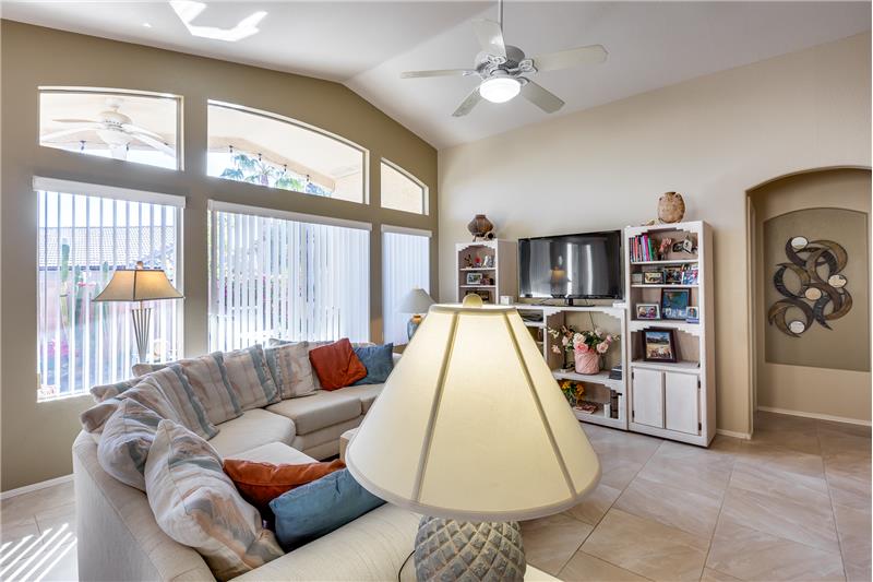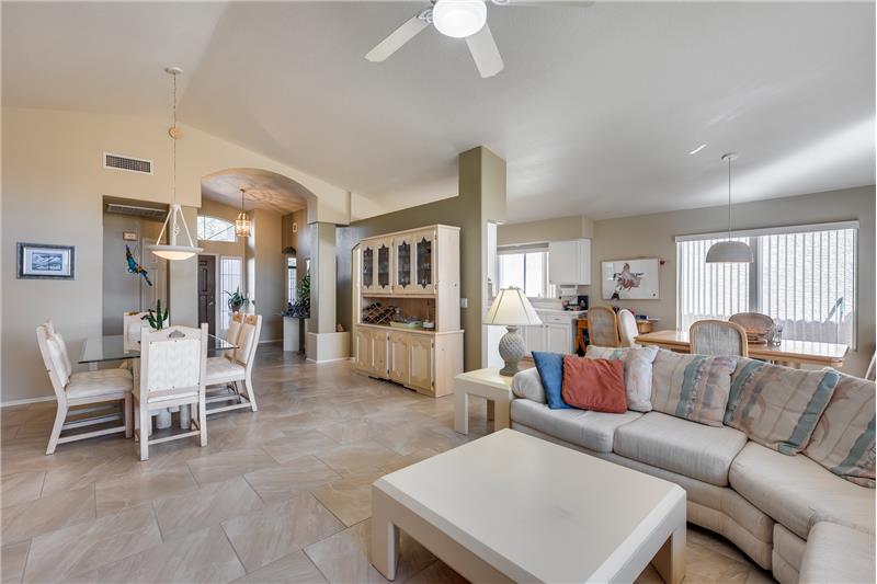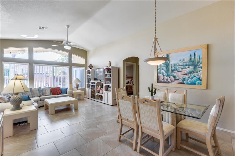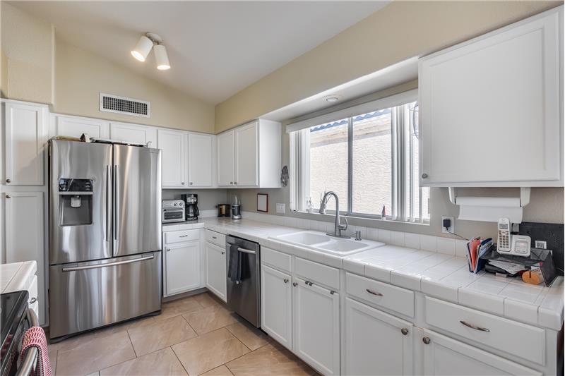 Resort Living in Sun Village - Welcome to this FURNISHED & EXPANDED Valencia plan. Vaulted ceilings and many windows let in the Arizona sunshine.HVAC (2020), Tile floors, painted kitchen cabinets with tile countertops and newer SS appliances are a few upgrades in this home. Entertain on the large south facing back patio. Located on a corner lot near the sport courts! Sun Village is a 55+ Gated, Resort Style Community. Enjoy the 18 hole par 3 golf course, gigantic heated pool & spa, pickleball, tennis, fitness gym, woodshop, billiards, onsite entertainment in our ball room and onsite restaurant