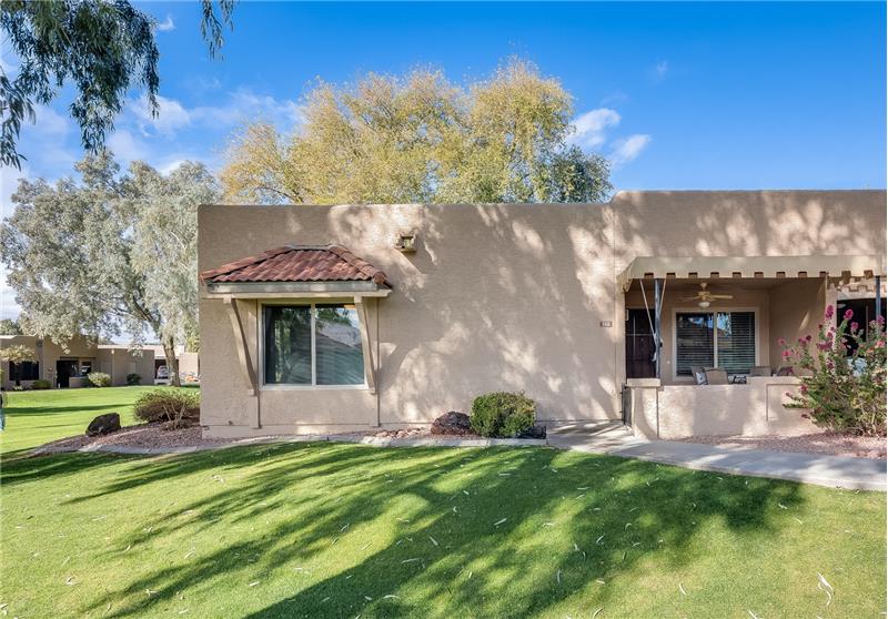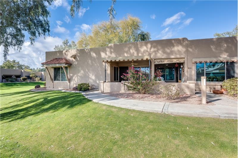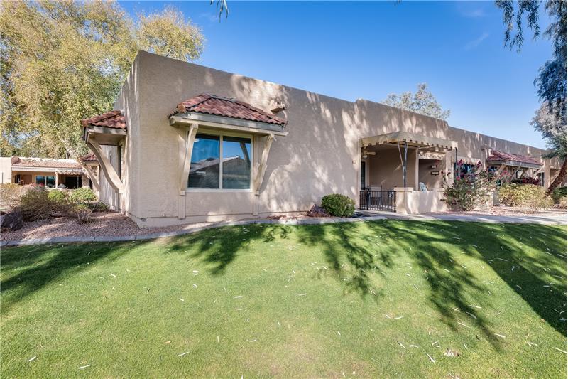Location! Great corner unit on the greenspace! East facing patio for morning sun. Updated Penasco plan. Nice kitchen has updated appliances w/Bosch dish washer, RO system & disposal too. Spacious living and dining area. Hall bath for guest. Laundry can fit full size w/d. Good size(17x13) master bedroom shares no wall with neighboring unit and has windows that face green space. Master Private bath. Windows 19', HVAC 22', Water Heater 20', Kitchen countertops, sink, faucet & disposal 19', bathroom & kitchen floors 19'. newer patio awning too. don't miss this one. Gated Community also!
