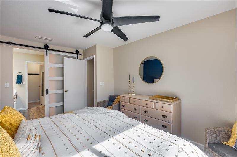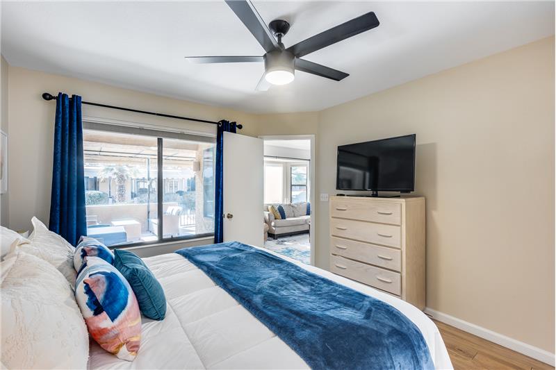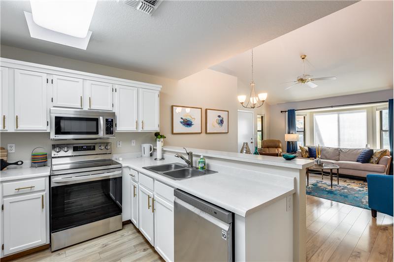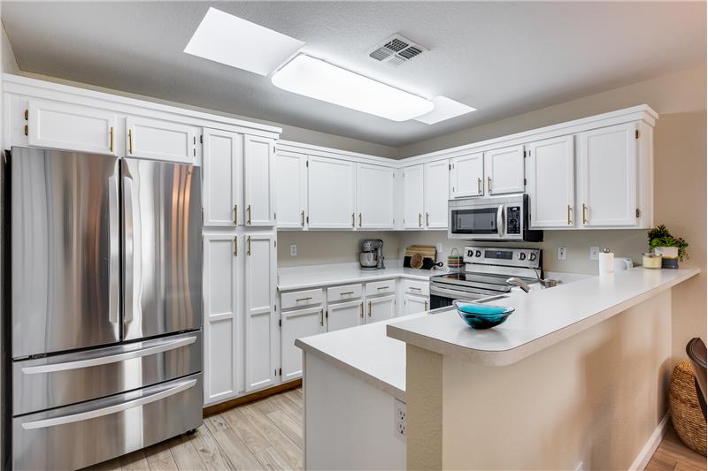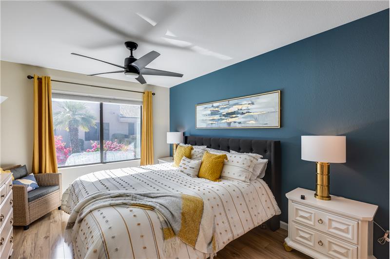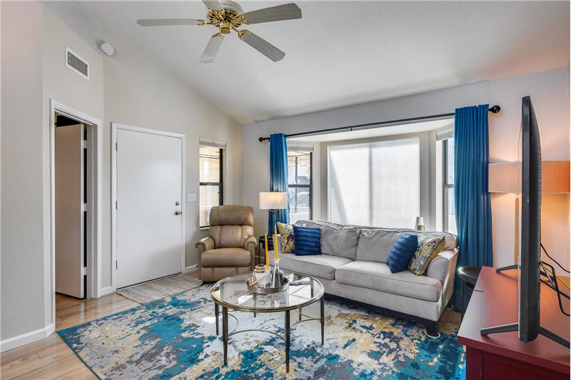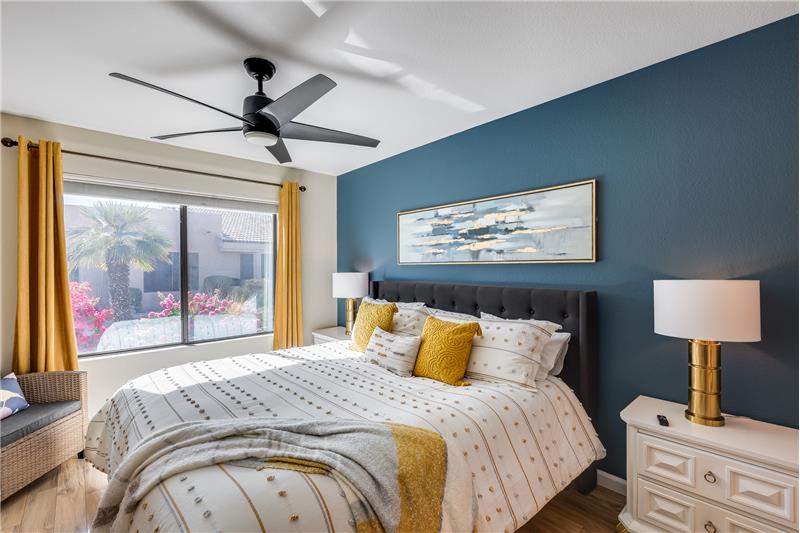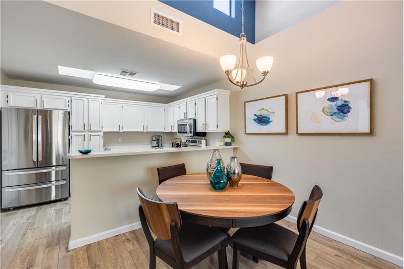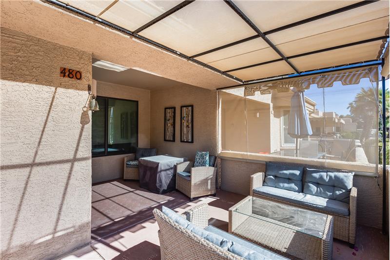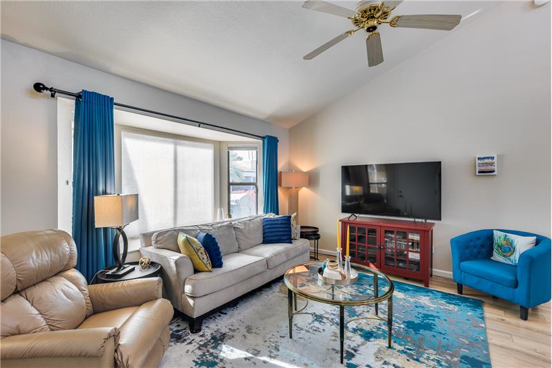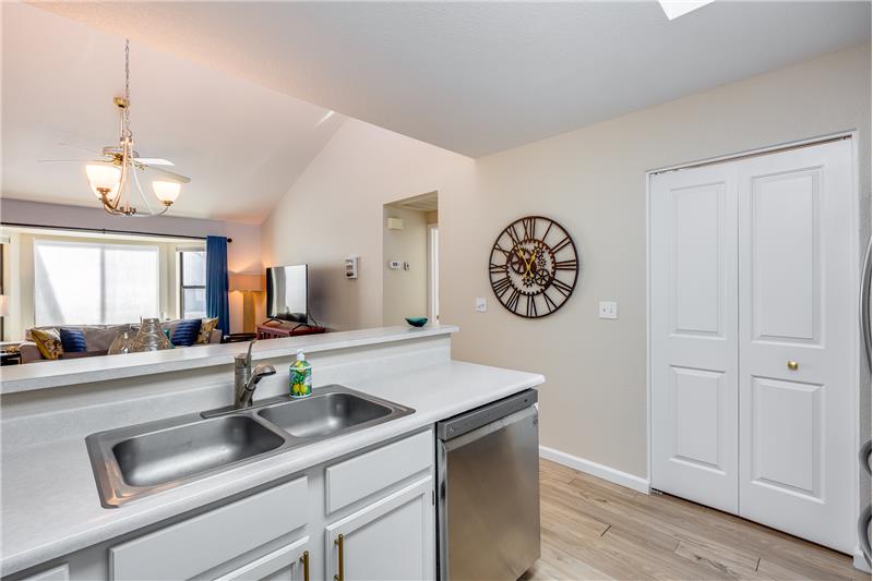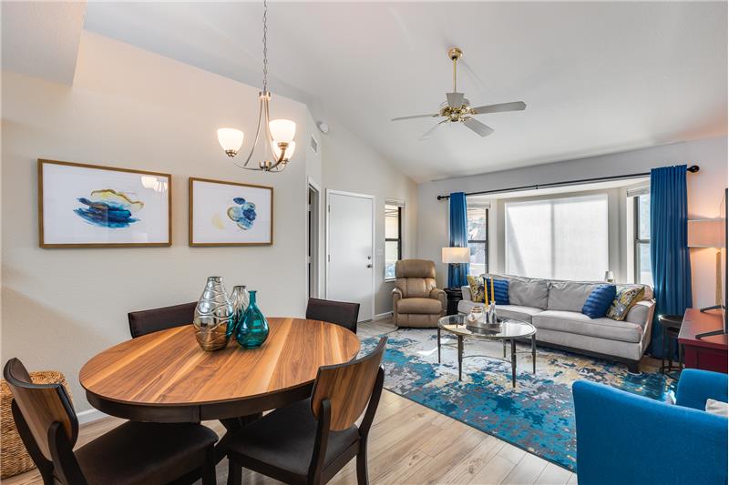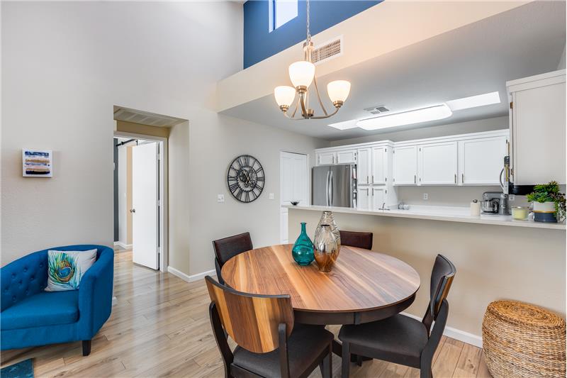 TURN KEY Resort Living! Great Vaulted FURNISHED 2b/2b split plan condo. Each room with its own bathroom! Vaulted ceiling and south facing makes things light and bright! Nicely updated with painted cabinets, newer SS appliances & laminate flooring. Barn door on master bath, double sinks and walk in closet. Bump out in living room for extra room and light. South facing HUGE patio!Sun Village is a 55+ Gated, Resort Style Community. Enjoy the 18 hole par 3 golf course, gigantic heated pool & spa, pickleball, tennis, fitness gym, woodshop, billiards, onsite entertainment & onsite restaurant!