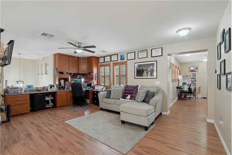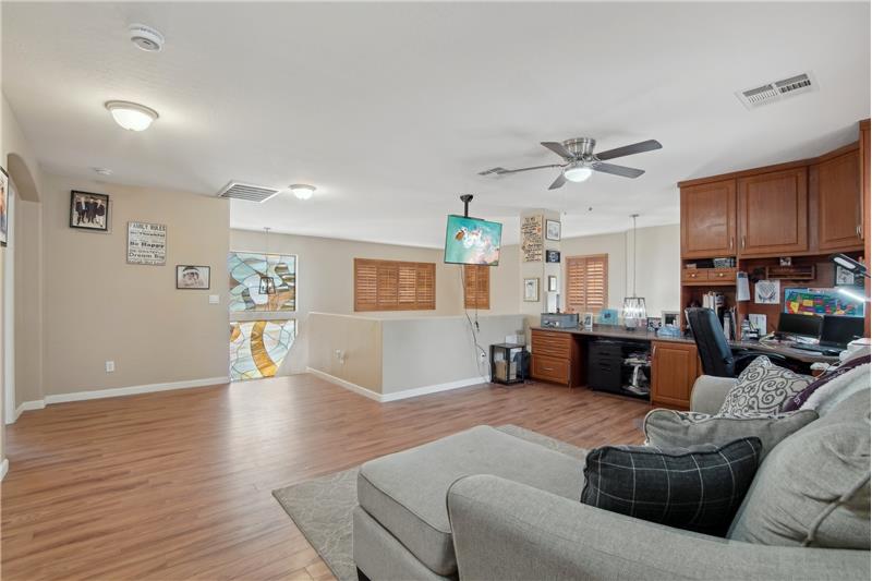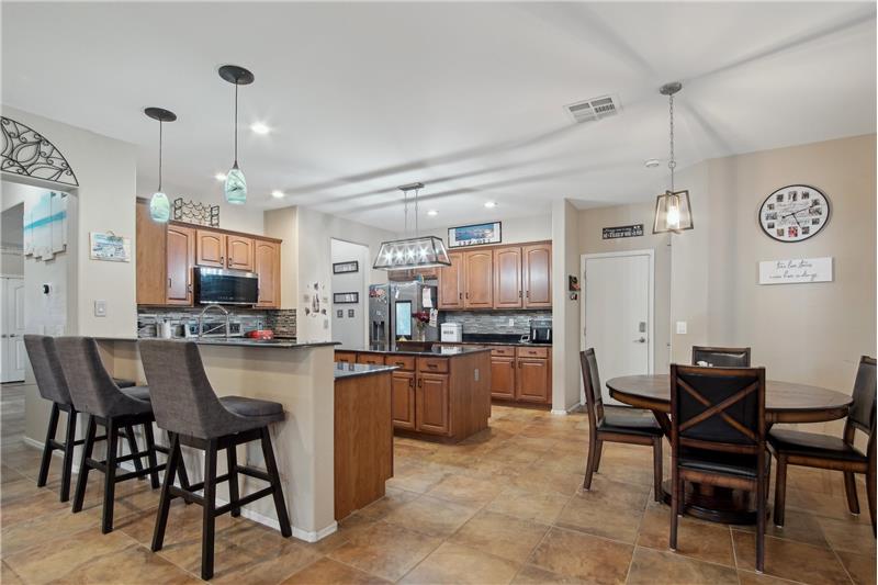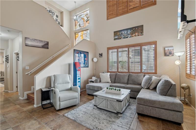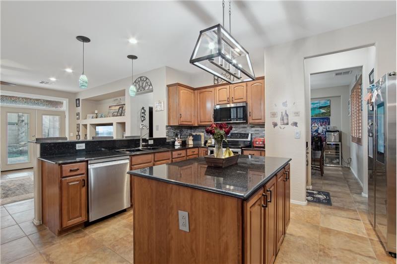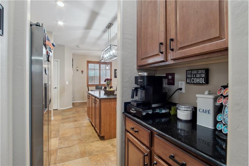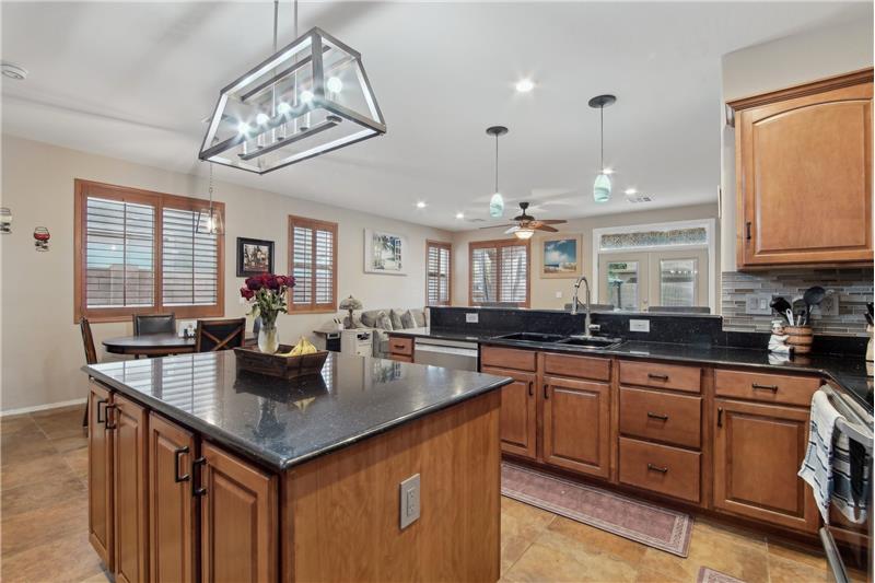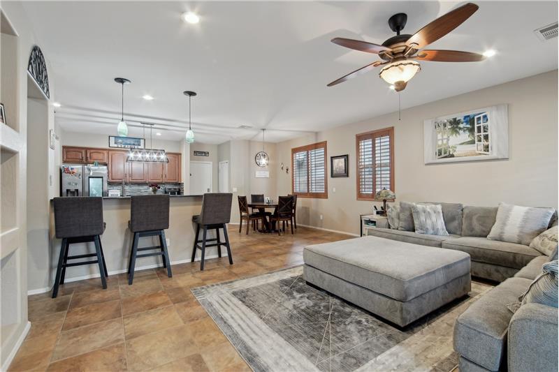 This beautifully upgraded 3-bedroom + loft home has been lovingly maintained and feels just like a model. From the moment you walk in, you'll notice the thoughtful touches: no carpet anywhere, just sleek 18'' tile and updated laminate floors, plus plantation shutters, custom paint, and stylish lighting and fans throughout. The kitchen is the heart of the home, and this one shines with granite counters, a center island with breakfast bar, stainless steel appliances, and rich maple cabinetry—perfect for everyday living or entertaining a crowd.