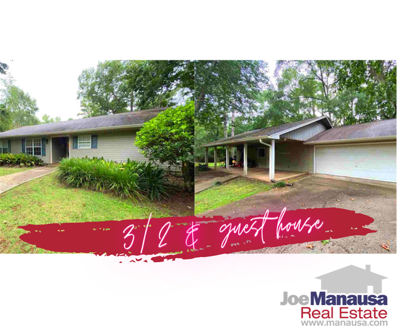 This home features a detached guest house with family room, dining space, kitchen, bedroom and bathroom. Workshop and 2 car garage are also located in this building. Main house is a split bedroom plan, featuring 3 bdr/2bath, oversized master bedroom. Living area is open concept with a vaulted ceiling, large dining area and screened porch overlooking great views of the beautiful back yard. Very private property, set back off the road - you cannot see the neighbors! This is a perfect property for multi-generational family, home office, exercise space or visiting family and friends. Main house ha