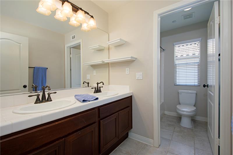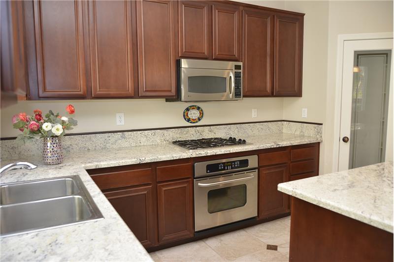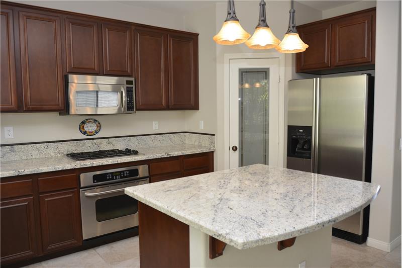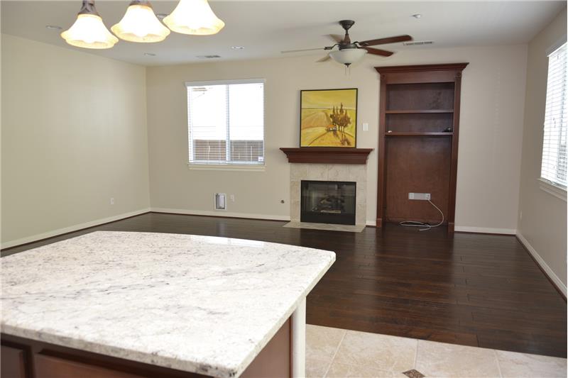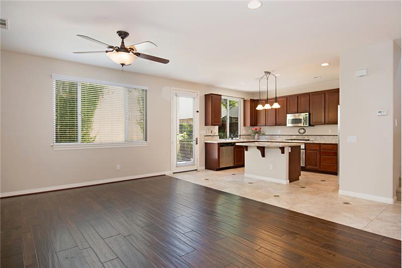 Wonderful open floor plan featuring a center island kitchen with granite counters, stainless appliances,and big pantry,  Richly colored cabinetry throughout with upgraded fireplace mantel and TV casement.  Big squares of Travertine flooring in the entry level with rich gleaming wood flooring in family room and easy care blinds throughout.Very light and bright with good breezes from the front door.  There is  A/C plus ceiling fans in each bedroom and family room.  Rooms are very spacious, the master bedroom is large with a luxurious bath and big walk in closet.  The yard is private and eas ...