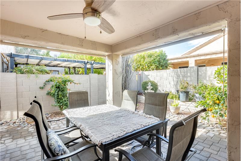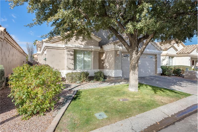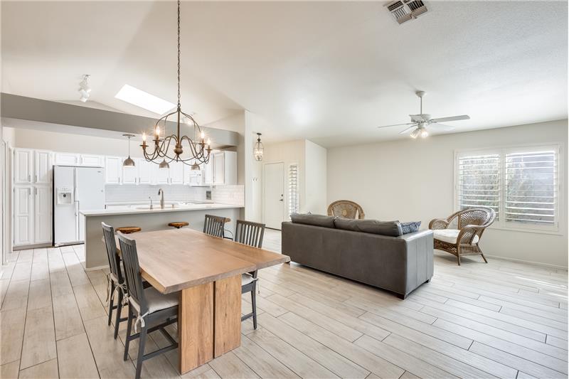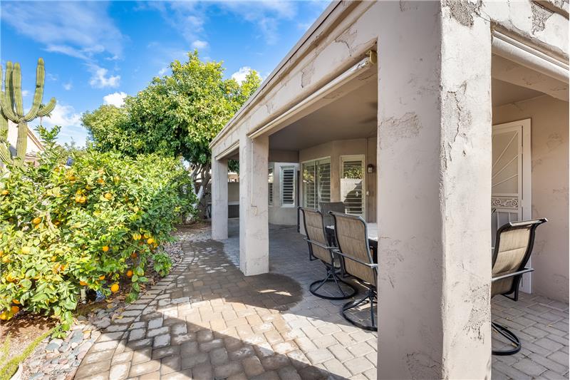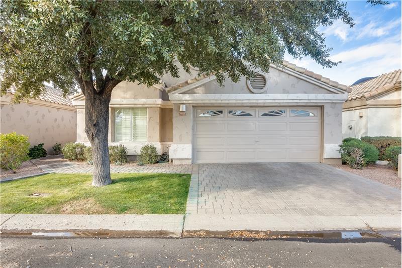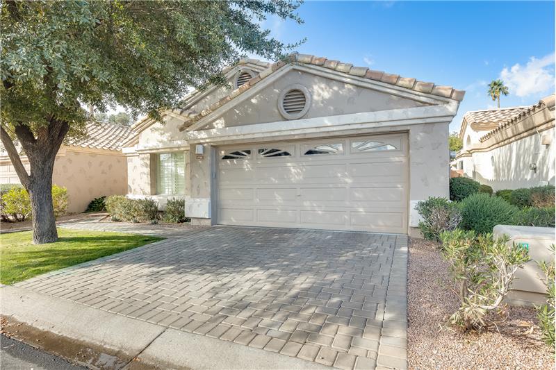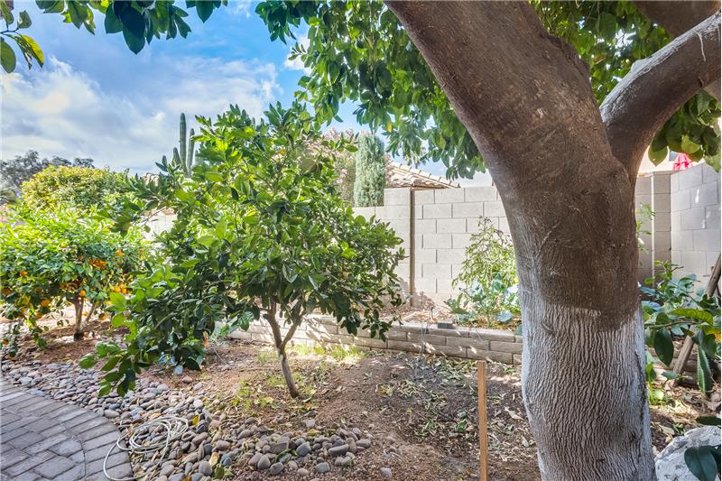 Updated Taos split plan. OWNED SOLAR. Paver driveway and sidewalk to entry. Tile plank flooring in main areas. Vaulted ceiling and white cabinets and sky light brighten this kitchen that features Silestone counters, custom backsplash, large custom pantry & Culligan drinking water system Custom curbless tile showers for EZ access & new toilets in both bathrooms. Plantation shutters on windows. Newer washer/dryer. Garage has Walls of cabinets & chest freezer stays. HVAC aprox 5 yrs old. Nice covered paver patio with Meyer lemon, sweet orange and grapefruit trees!
