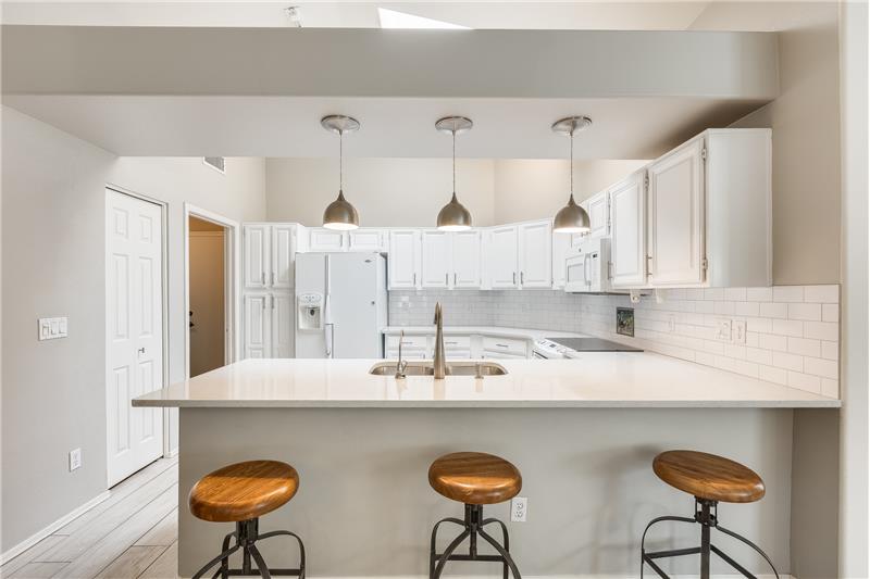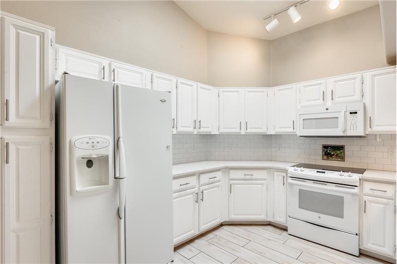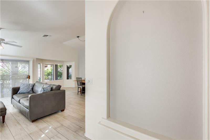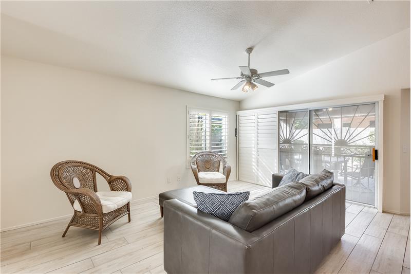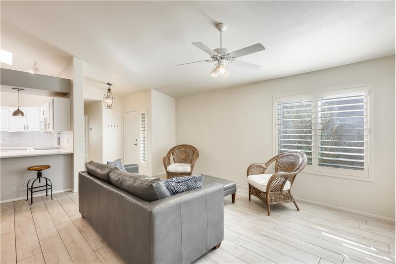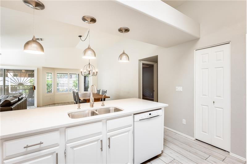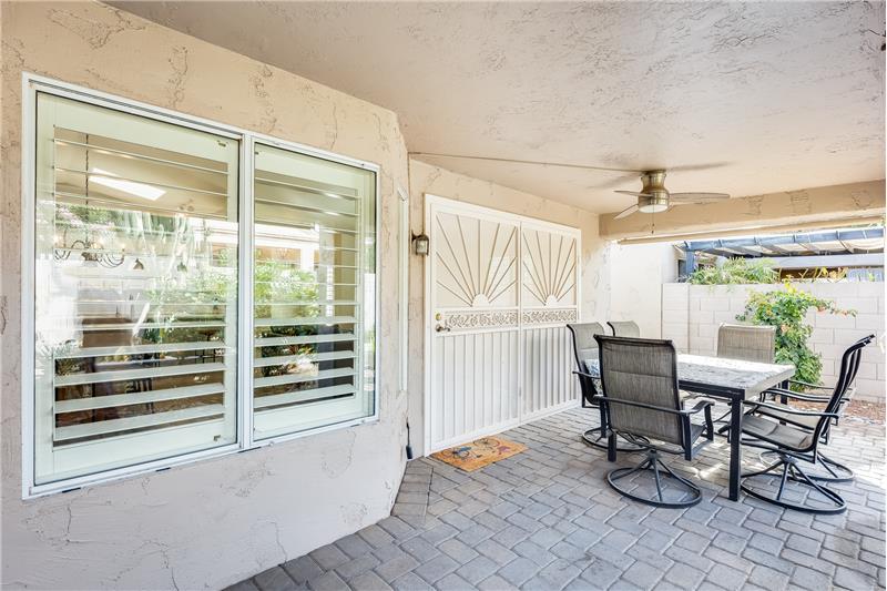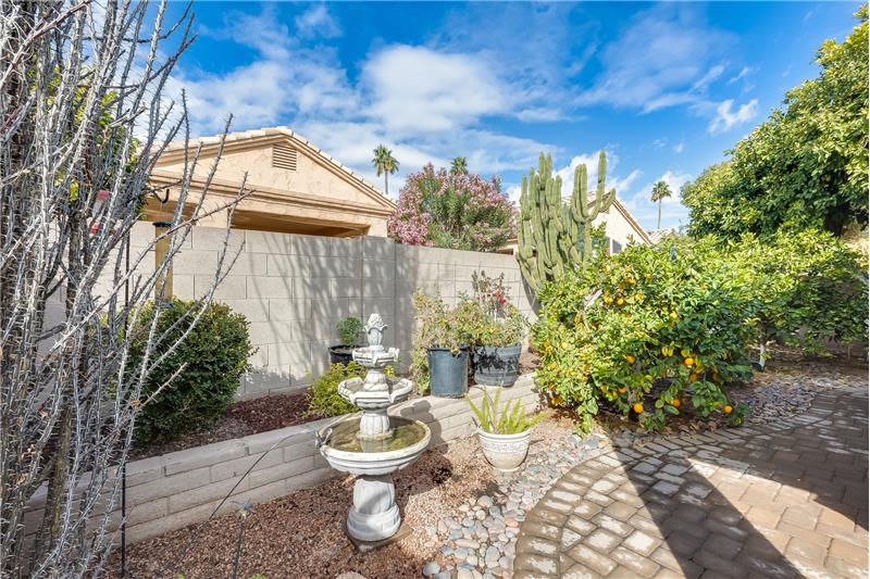 Updated Taos split plan. OWNED SOLAR. Paver driveway and sidewalk to entry. Tile plank flooring in main areas. Vaulted ceiling and white cabinets and sky light brighten this kitchen that features Silestone counters, custom backsplash, large custom pantry & Culligan drinking water system Custom curbless tile showers for EZ access & new toilets in both bathrooms. Plantation shutters on windows. Newer washer/dryer. Garage has Walls of cabinets & chest freezer stays. HVAC aprox 5 yrs old. Nice covered paver patio with Meyer lemon, sweet orange and grapefruit trees!
