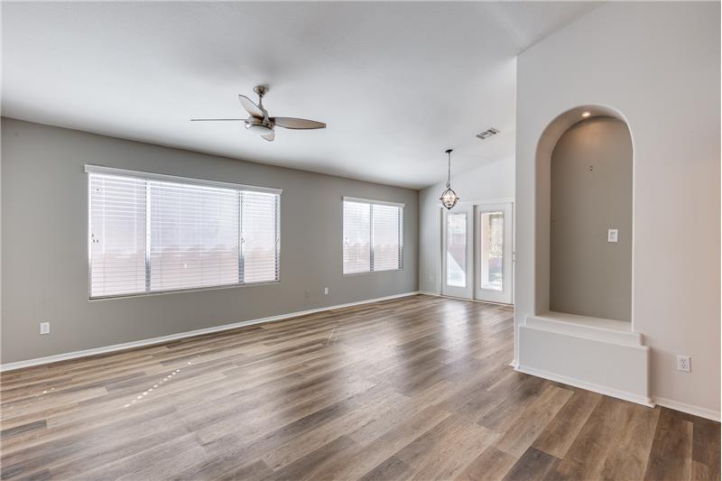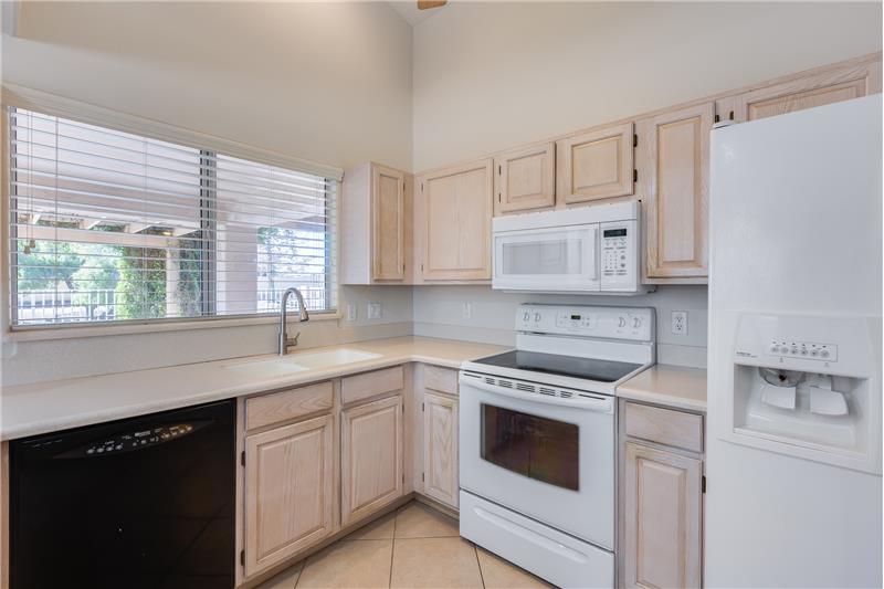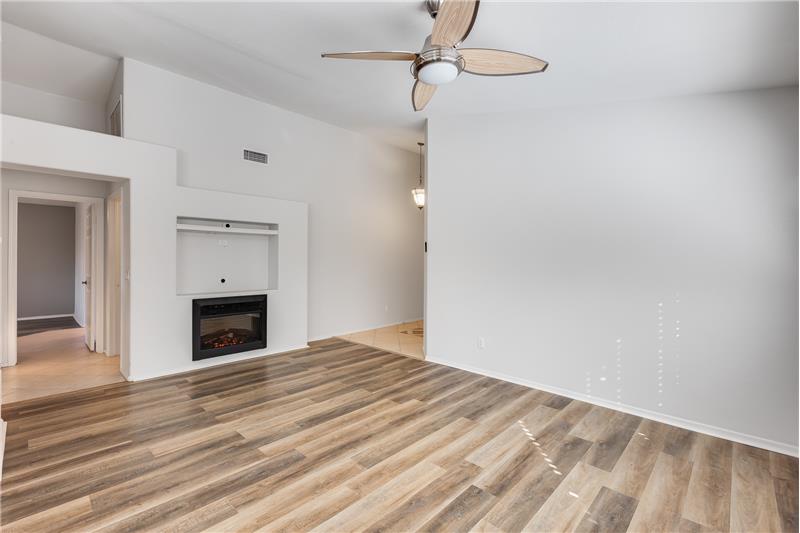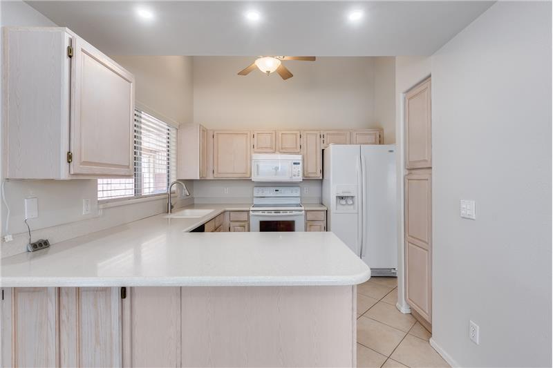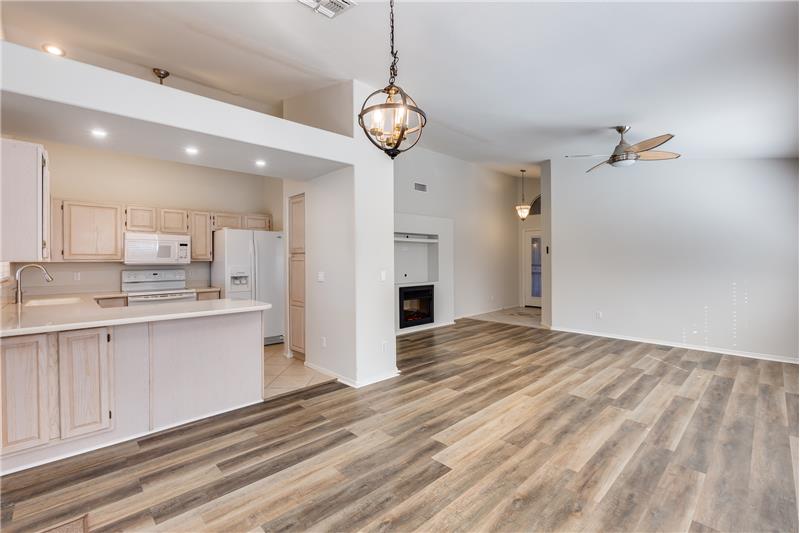 This charming home is filled with thoughtful upgrades throughout. Step inside to enjoy newer flooring and fresh interior paint, an inviting electric fireplace, and blinds built into the doors for added convenience. The kitchen showcases Corian countertops, while ceiling fans throughout ensure year-round comfort. Additional features include attic access with pull-down stairs, an upgraded master closet, and raised toilets. The garage cabinets provide ample storage. Turf in backyard and views of Pima Lake.