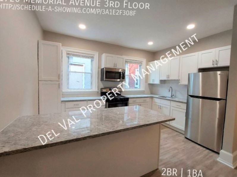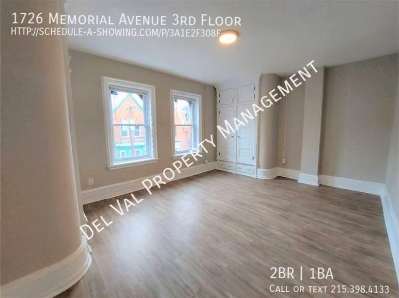 • We've Improved the Rent! Large 3rd FL Apartment For Rent – 1726 Memorial Avenue, Philadelphia – near University City • $1,265/month plus utilities • 2 Bedrooms • 1 Bathroom • Laminate wood floors throughout • Island kitchen comes equipped with NEW Stainless-Steel Appliances • Two Large Bedrooms include ample closet space • Washer & Dryer on premises • Central Air • Forced-air heat • For More Information or a Showing, please see Description Page!