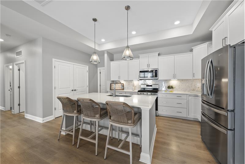 BETTER THAN NEW RANCH WITH FENCED BACKYARD! You will love this Epcon low maintenance community (no age restrictions) with sidewalks on both sides of the road. 2 Bedrooms + Sunroom/Office/Den/Flex Room with an open concept & lots of natural light. Spacious living room with ceiling fan, trey ceiling & gas fireplace. Chef's kitchen with HUGE island, quartz counters, custom tile backsplash, soft close cabinets & under cabinet lighting. Stainless steel appliances include a gas stove & Refrigerator. 2 kitchen pantries - 1 is HUGE - great storage! Oversized laundry room with tile floor, cabinets