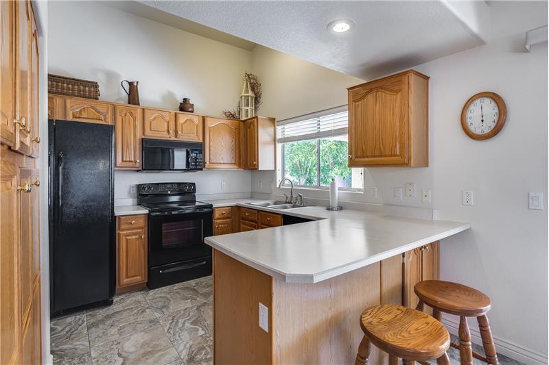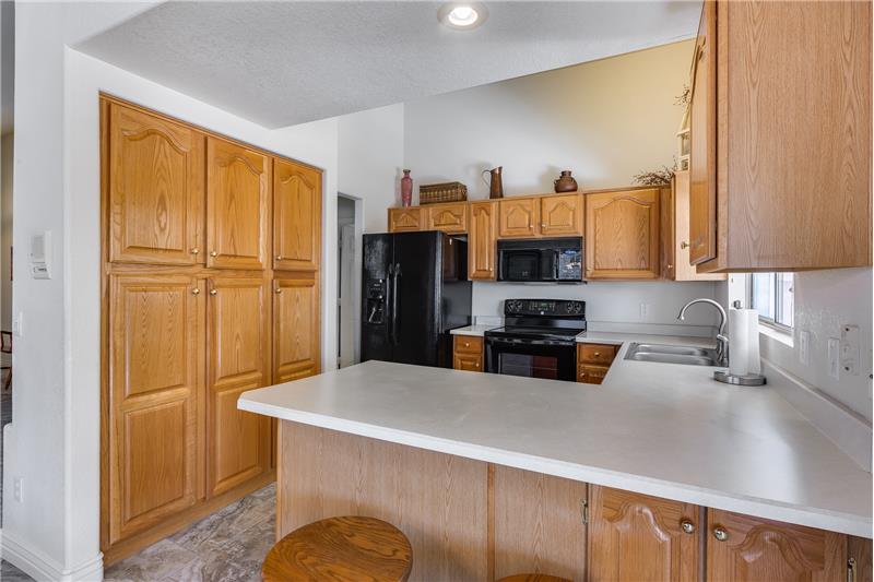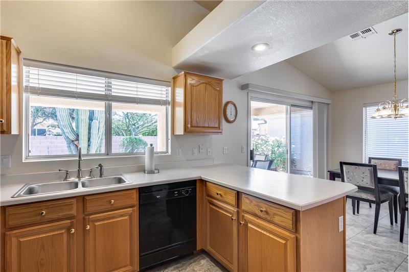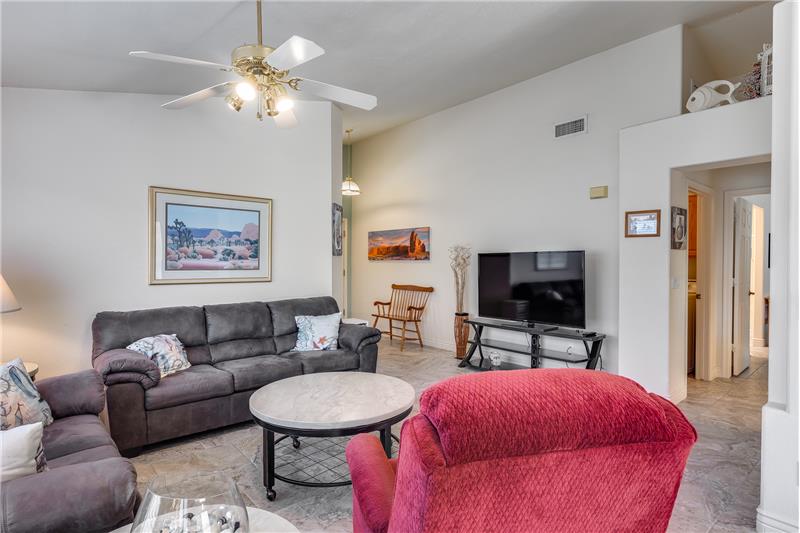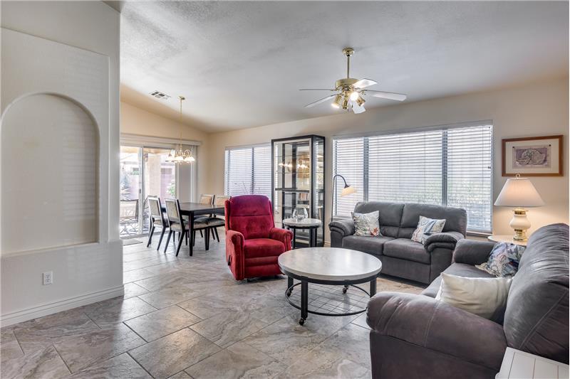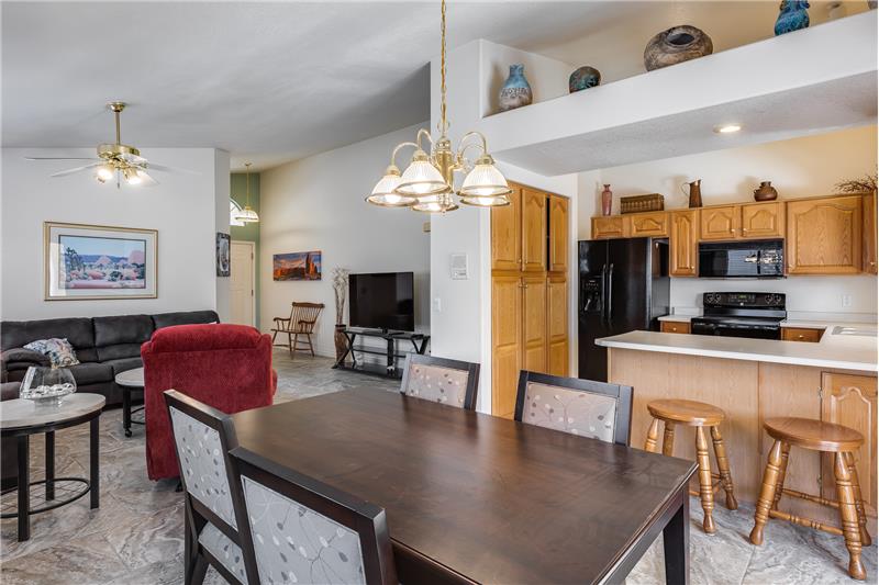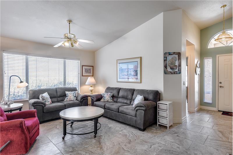 Welcome to this beautifully maintained home in the desirable Pueblo Village community! Step inside to discover an inviting open floor plan featuring vaulted ceilings, neutral tones, and tile flooring throughout. This fully furnished residence offers a stunning kitchen with warm wood cabinetry, built-in appliances, ample counter space, and a kitchen island with a breakfast bar, perfect for casual dining or entertaining. The serene primary suite boasts a bay window that fills the space with natural light, along with a private en-suite bath for added comfort and privacy.