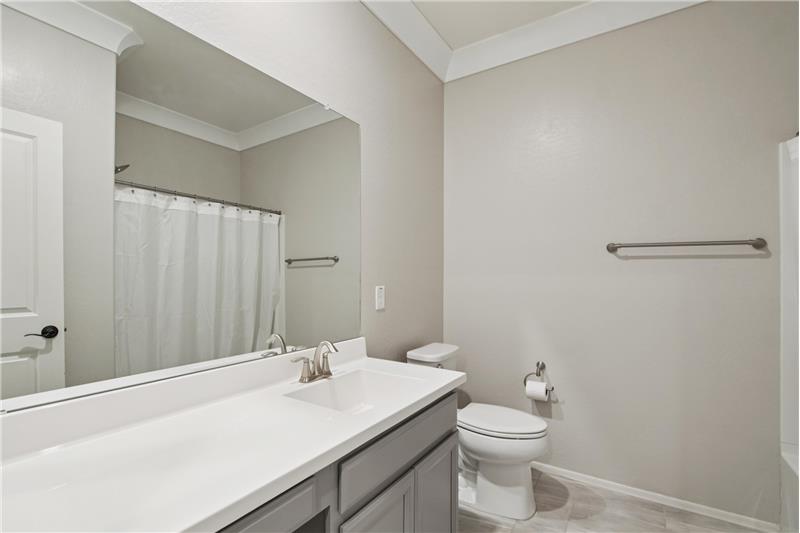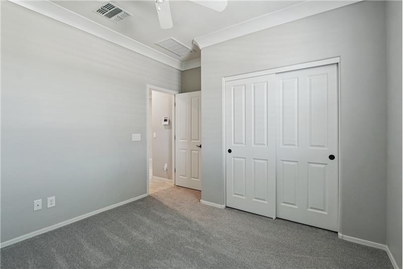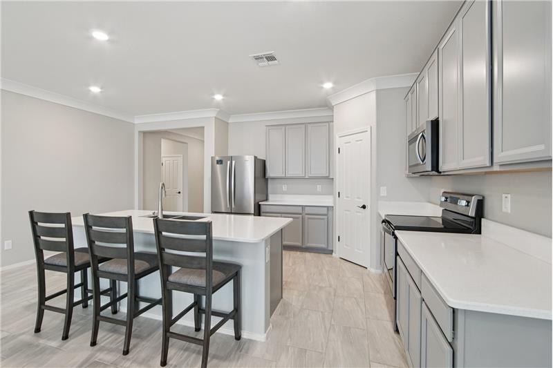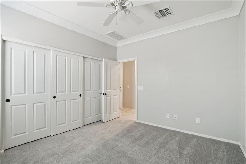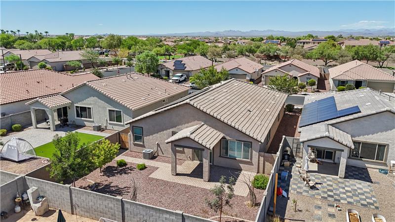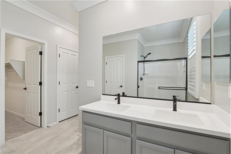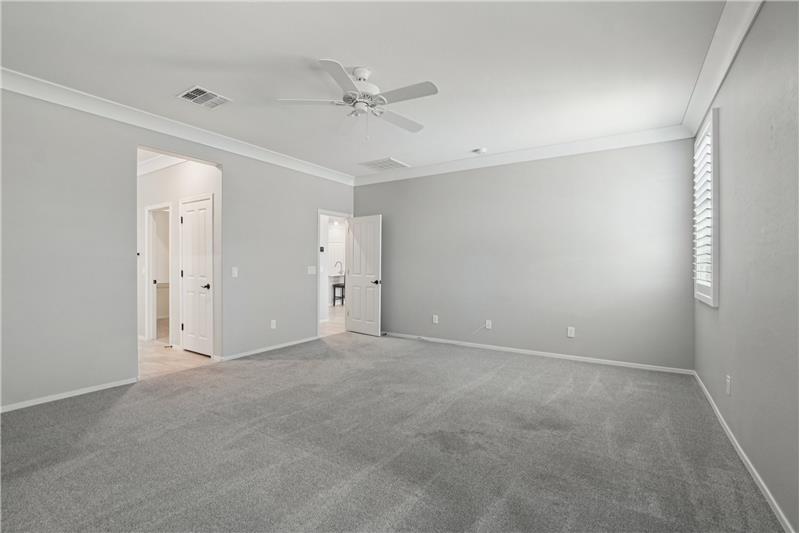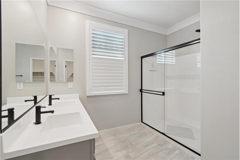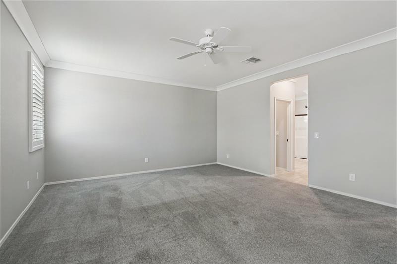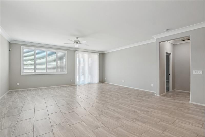 Beautifully maintained single-level home featuring an open concept floor plan with a spacious great room and modern kitchen. The kitchen includes stainless steel appliances, a large center island, and an oversized walk-in pantry. Tile flooring throughout the main living areas, bathrooms, and laundry and carpet in the bedrooms. The split floor plan offers a private primary suite with a generous walk-in closet, dual-sink raised vanity, and large walk-in shower. Additional features include beautiful plantation shutters throughout the home, two-tone paint, and solar!