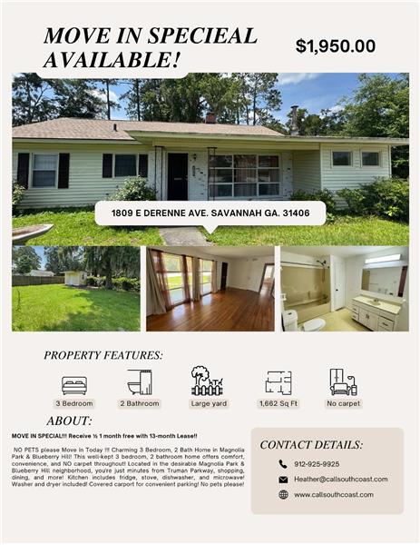 MOVE IN SPECIAL!!! Receive ½ 1 month free with 13-month Lease!! 1809 E Derenne Ave Rent - $1895 Pets – NO PETS please Move in Today !!! Charming 3 Bedroom, 2 Bath Home in Magnolia Park & Blueberry Hill! This well-kept 3 bedroom, 2 bathroom home offers comfort, convenience, and NO carpet throughout! Located in the desirable Magnolia Park & Blueberry Hill neighborhood, you're just minutes from Truman Parkway, shopping, dining, and more! Kitchen includes fridge, stove, dishwasher, and microwave! Washer and dryer included! Covered carport for convenient parking! No pets please!