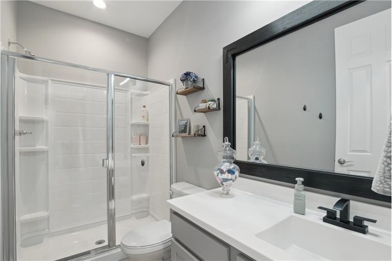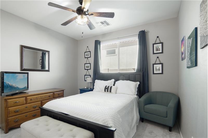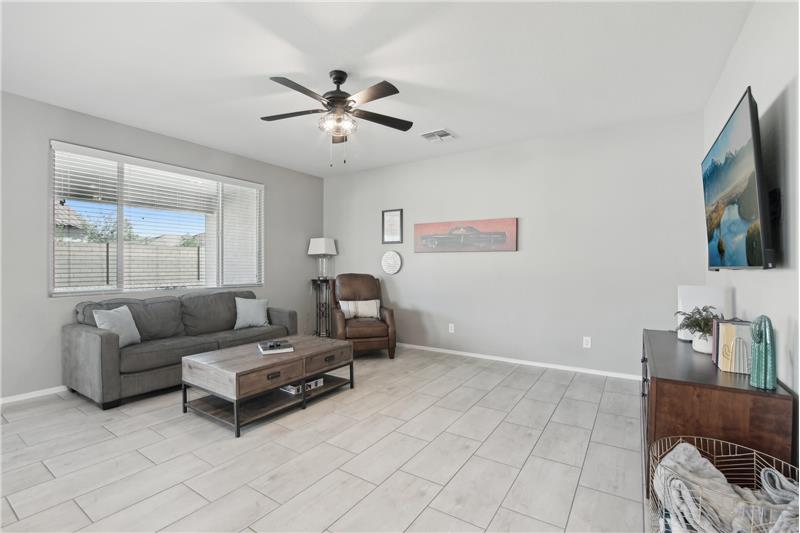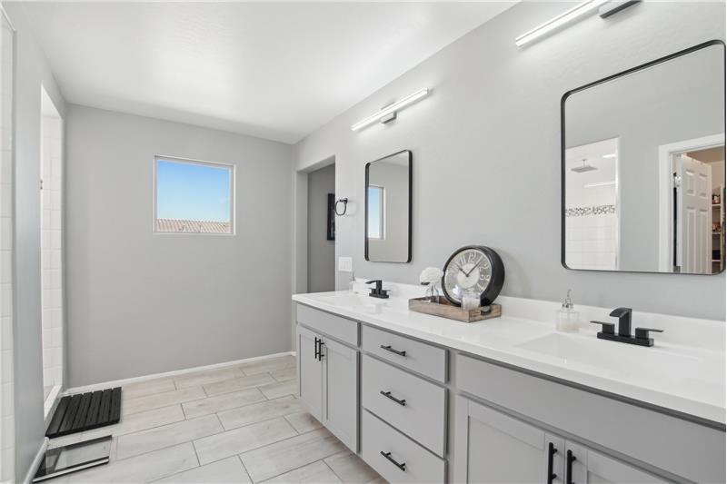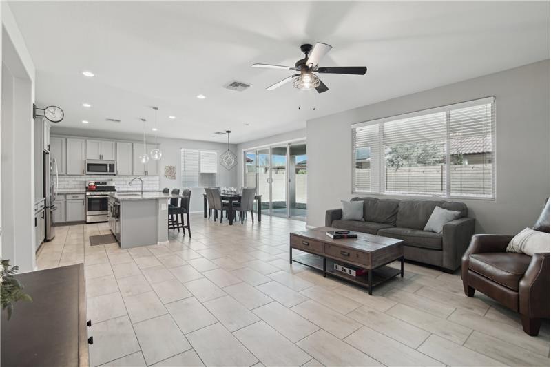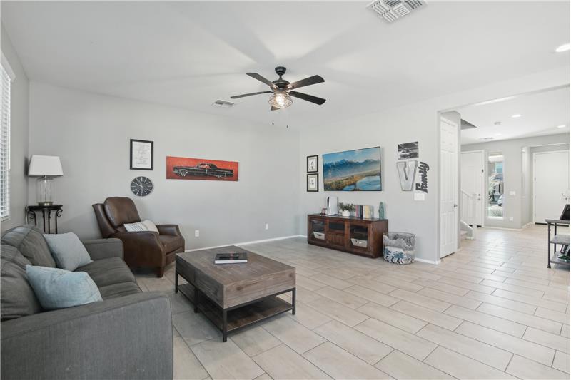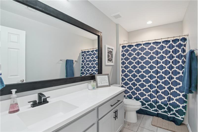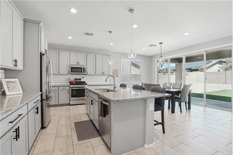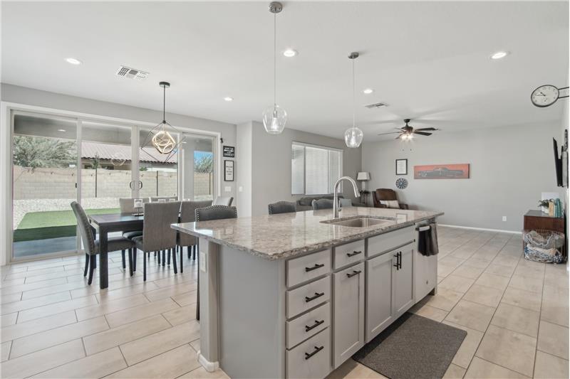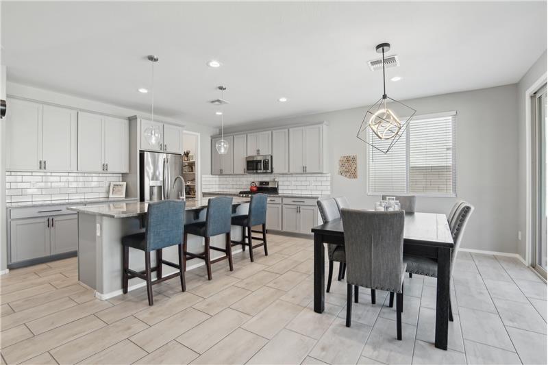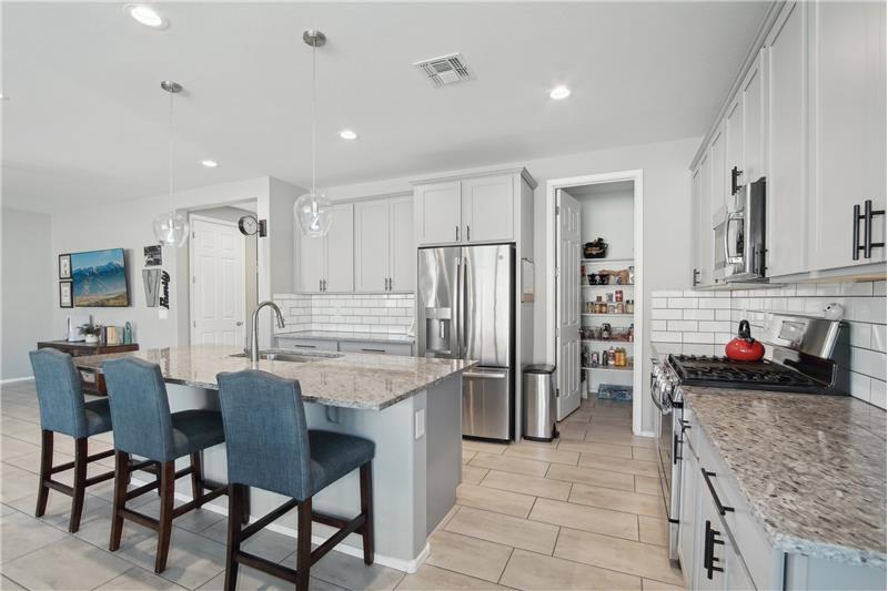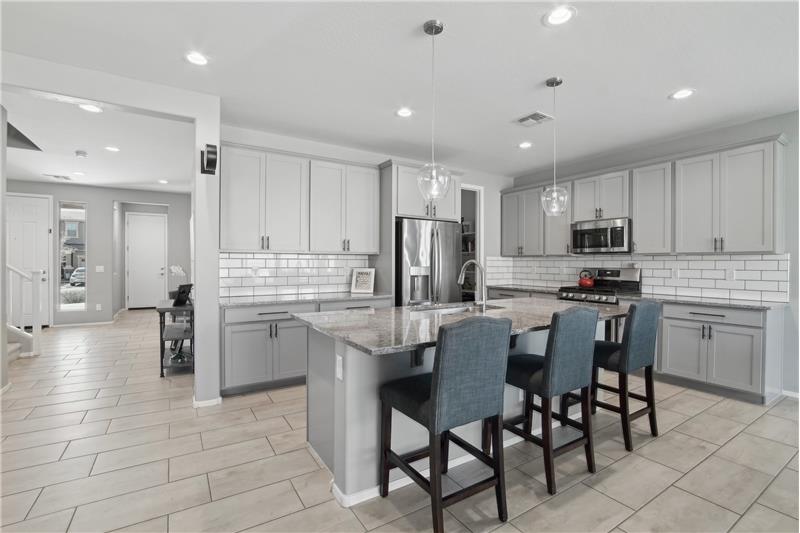 Discover this beautiful four-bedroom, three-bath, two-story home featuring elevated finishes throughout and a 47-foot RV garage! Step inside to upgraded tile flooring throughout the main floor, where you'll find a convenient bedroom and full bath—ideal for guests or multi-generational living. The open floorplan flows into a spacious living room and a stunning chef's kitchen with a large island featuring quartz countertops, upgraded cabinetry, and a spacious pantry. This kitchen is truly a dream for the household chef! Upstairs, you'll find two additional bedrooms, and a full bath.