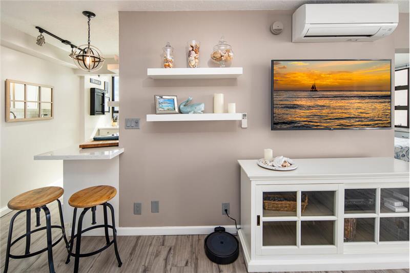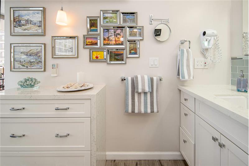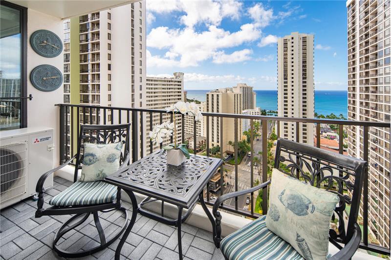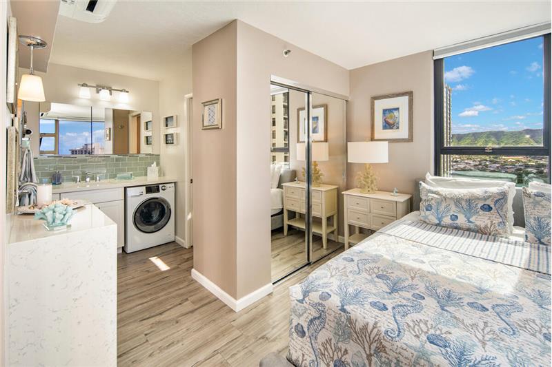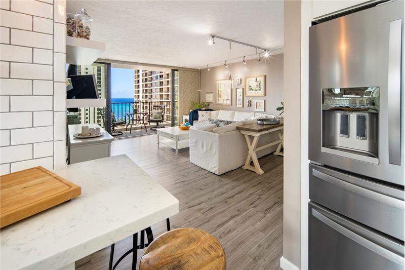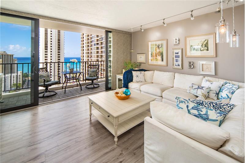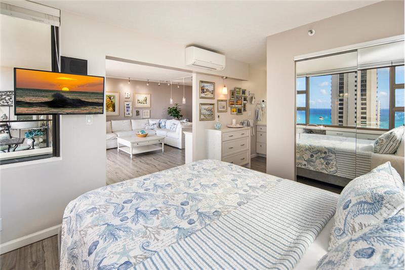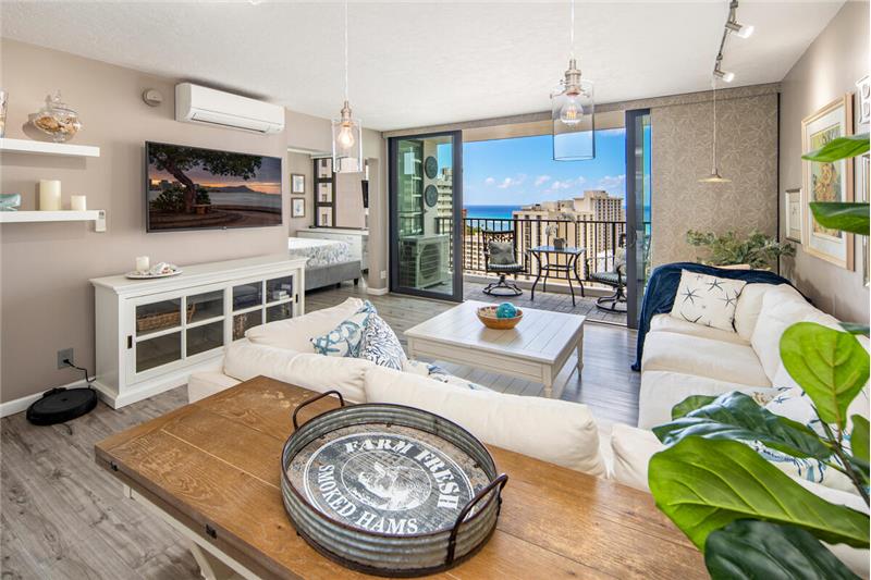Luxurious Designed! This largest 1Br/1Ba condo-hotel, a highly desirable corner end location with ocean view and the brilliant colors of city lights has been fully renovated to luxurious standards. With over $135k in improvements consisting of new double-pane lanai sliding glass doors and windows, split AC system, customized kitchen and baths, luxury vinyl flooring, flat surface ceiling, built-in drawer & cabinet/desk, organized closet system, and so many more to truly appreciate. It features removable lanai composite tile flr, approved washer, custom storage room and with luxurious furni ...