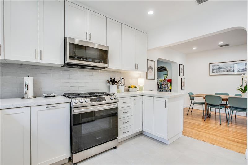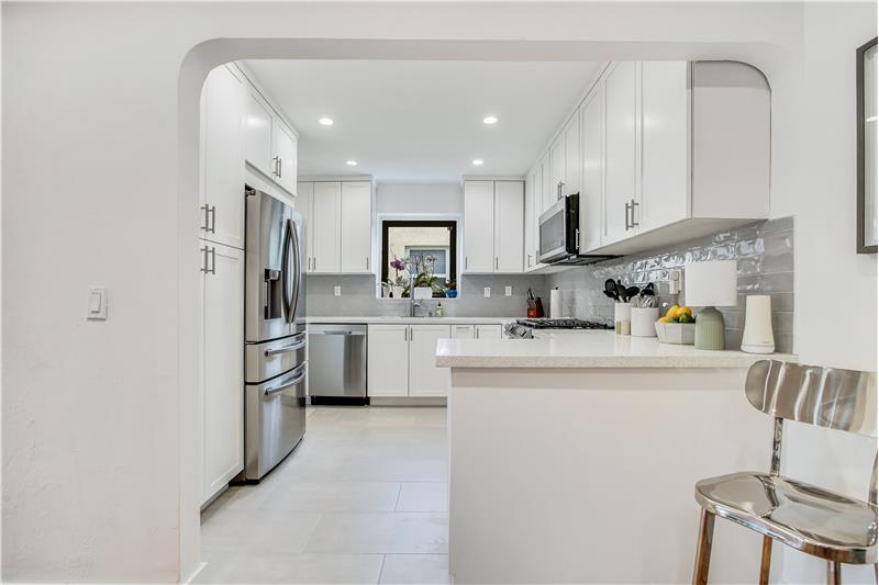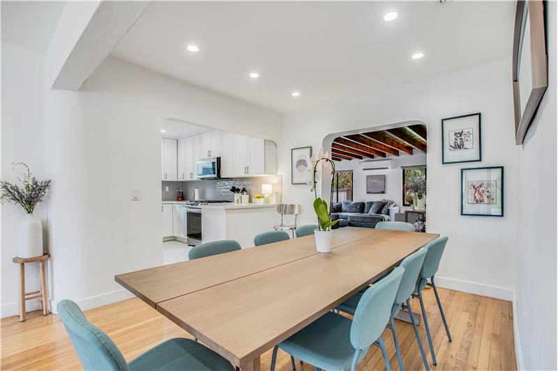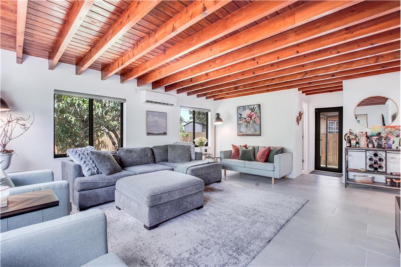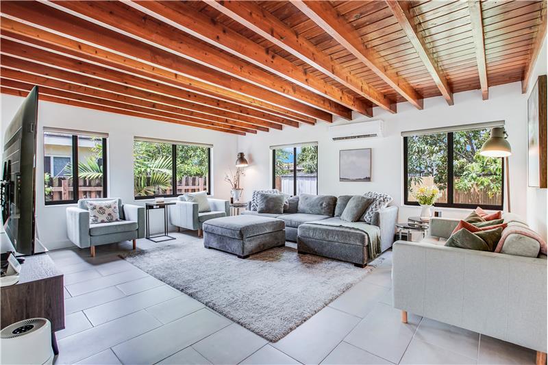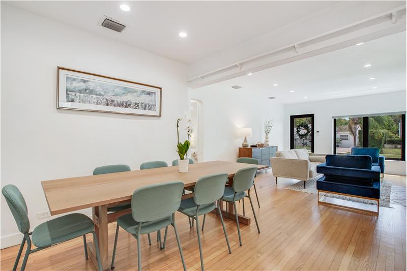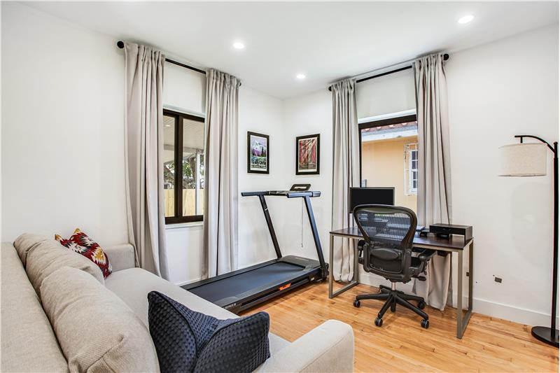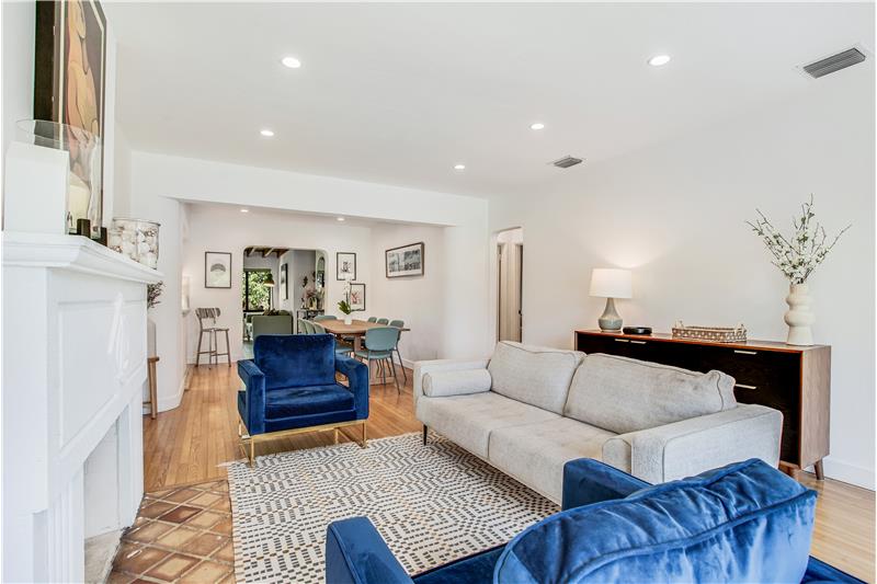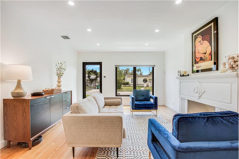 Enjoy many modern updates & spacious light filled interiors with 2 bd/2 ba & den/1 car garage. 1,703 SF. Inviting living room with decorative fireplace. Original hardwood floors. Open kitchen with Samsung appliances, gas range, quartz counter & custom cabinetry. Main bedroom with walk-in closet. Large Florida room with views of backyard & perfect for indoor/outdoor entertainment. Fenced backyard with covered terrace & fruit trees. All impact windows & doors. Sprinkler system. Great street & a central location. Short stroll to several nearby parks, public library, Aquatic Center, Schools & more