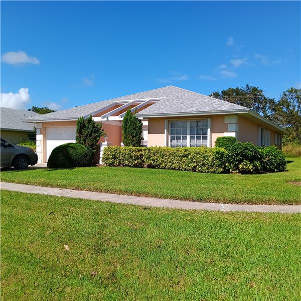 **REDUCED PRICE** This Garden Home inside Grove Isle has over 1700 sqft of air-conditioned living space with a wide open feel featuring vaulted ceilings. NEW STAINLESS STEEL APPLIANCES. Very LOW HOA ($345) Includes LAWN CARE, ROOF REPLACEMENT ESCROW, EXTERIOR PAINT and 24/7 security with a Manned Guard Gate to add piece of mind. Make this home your own with some updates or enjoy a Bargain winter retreat. This Community has 2 clubhouses/pools and backs to the Indian River with trails leading to riverfront deck and picnic area. Beaches and arts venues just minutes away!