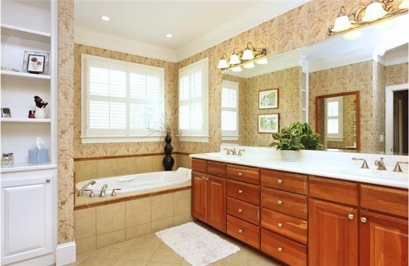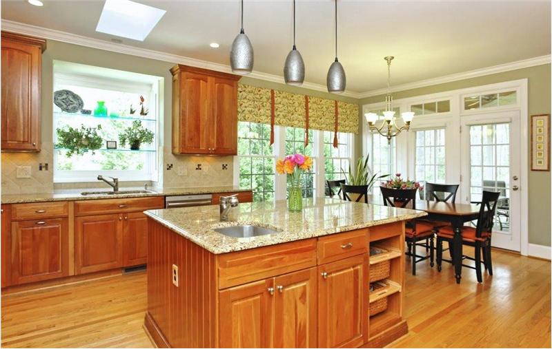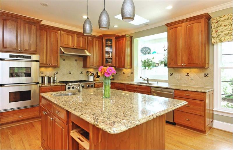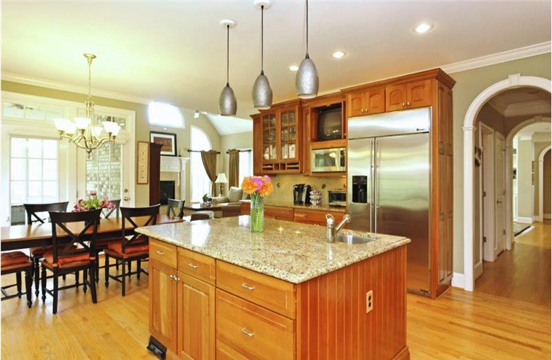 Granite counters, stainless appliances, wine cooler, veggie sink, double oven, micro, pullout drawers, screened porch, skylights, stamped concrete, glass shelves, HUGE center island, hardwoods thruout (except master), bonus/gameroom on 3rd floor, window seating, trey ceiling, arch doorways, decorative moldings, built in bookshelves, Cathedral ceilings, landscaping & GORGEOUS master bath.