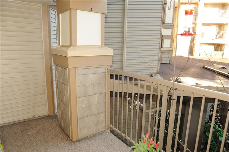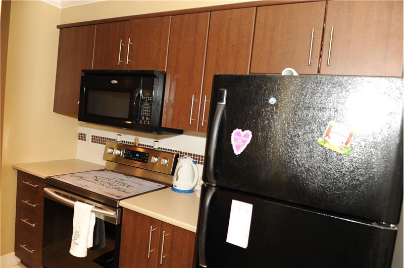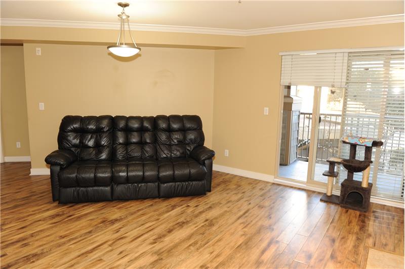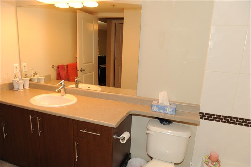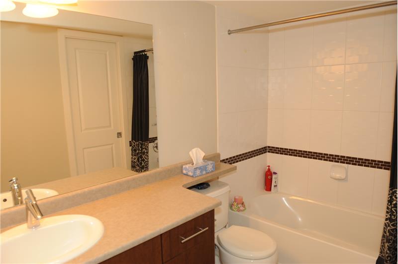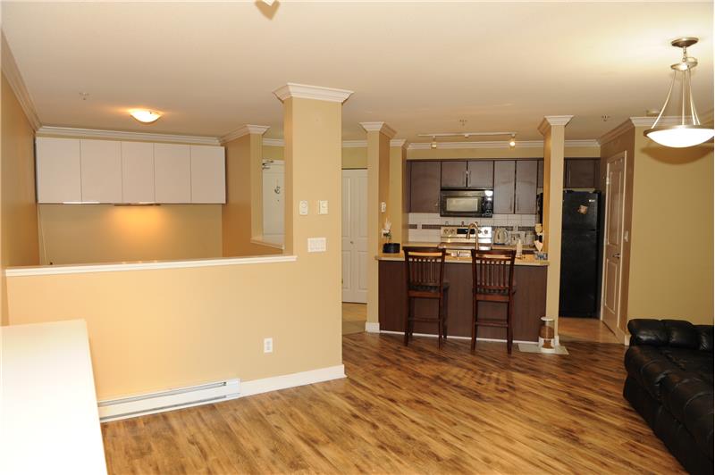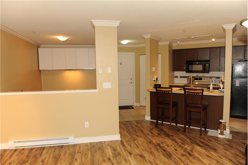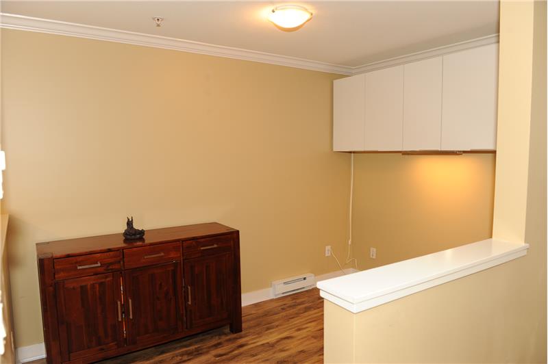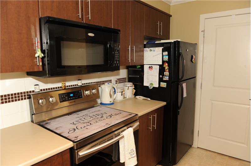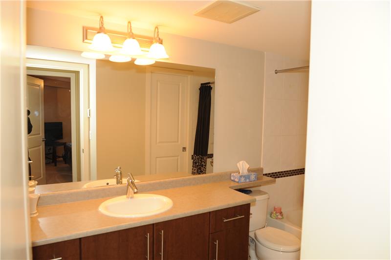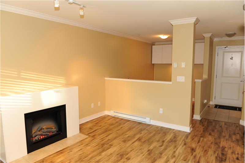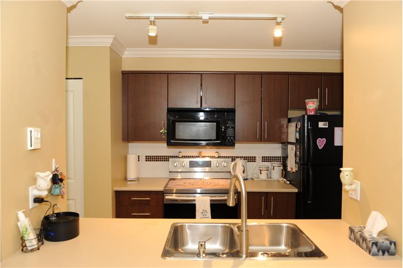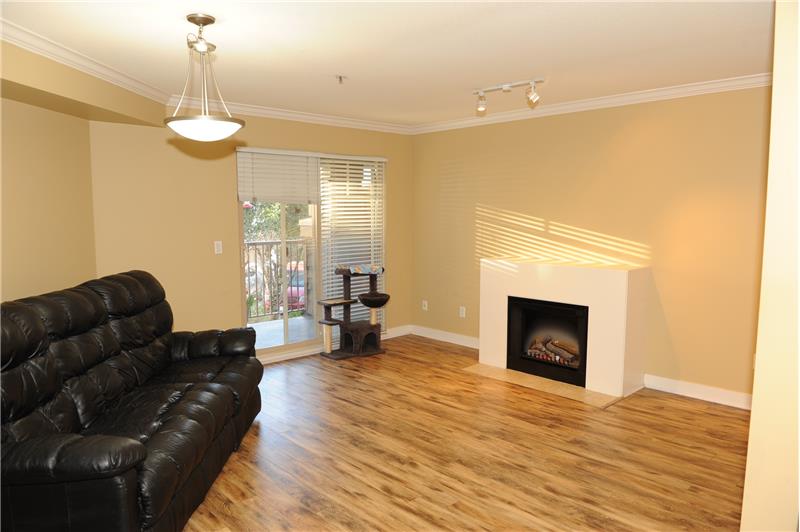 URBANO! Alert Investors or First Time Buyers: Spacious open floor plan features 1 bedroom and Den. kitchen with ample counter space, built-in microwave and breakfast bar. Living room with a electric fireplace and patio door leading to the covered balcony. The primary bedroom is a good size with a walk-in closet and a cheater ensuite. Large laundry room area with plenty of room for storage. The den can be easily turned into a 2nd bedroom. Low maintenance fees. This unit comes with 1 parking and a storage locker. Ideally located within walking distance to shopping, transit, library & recreation