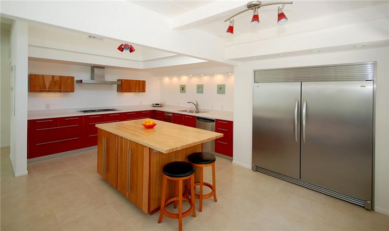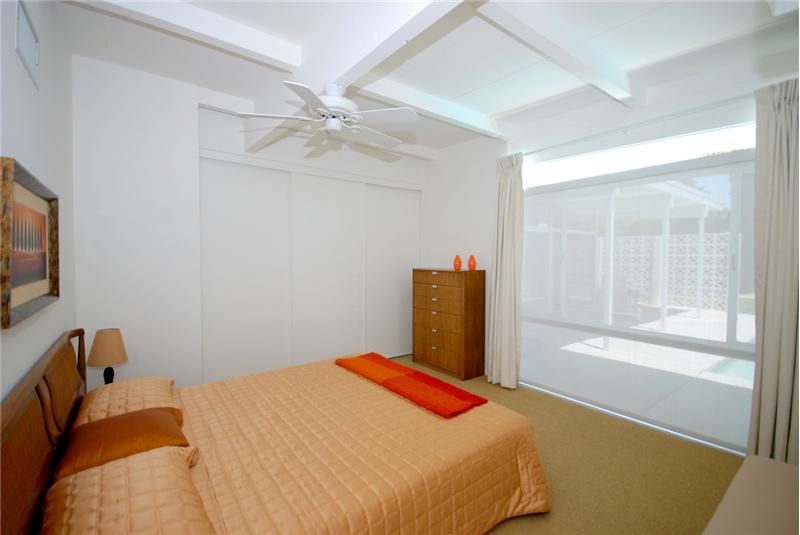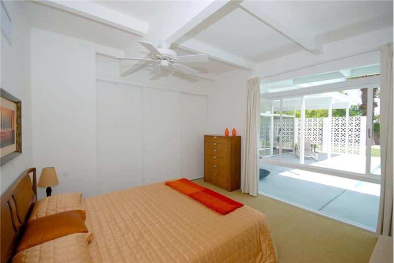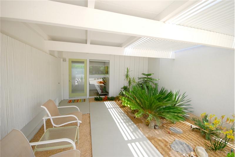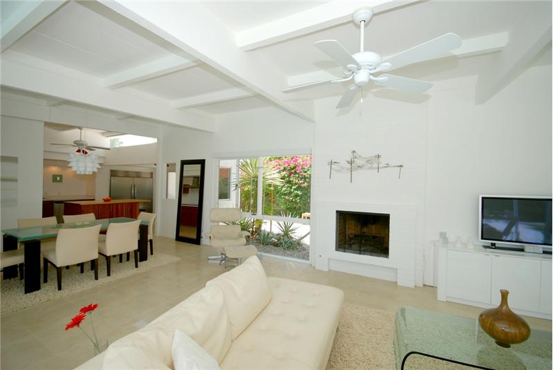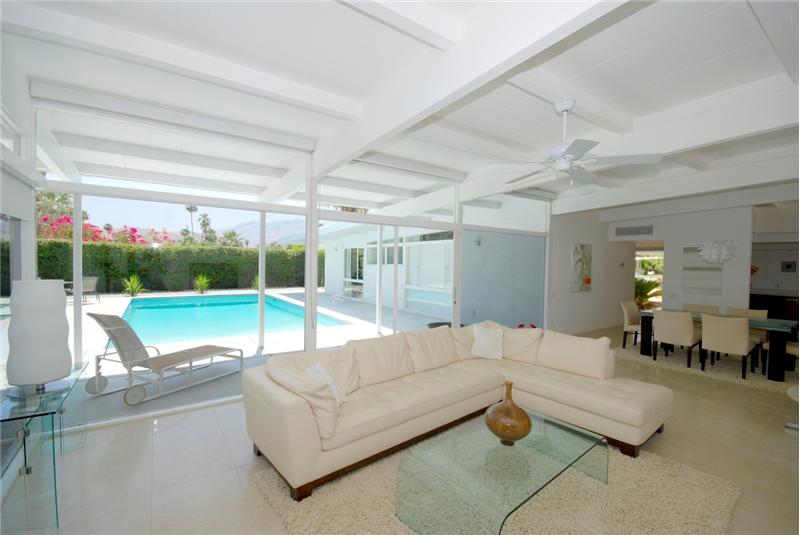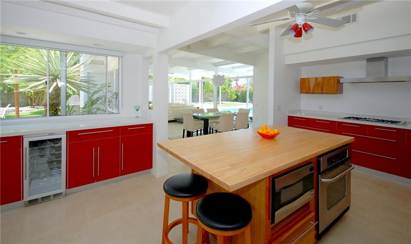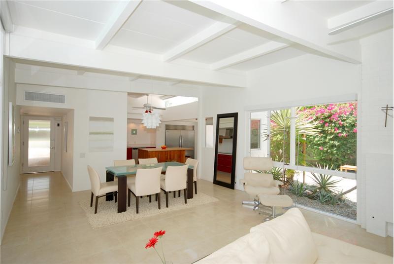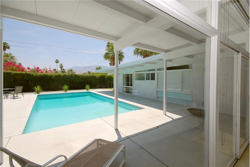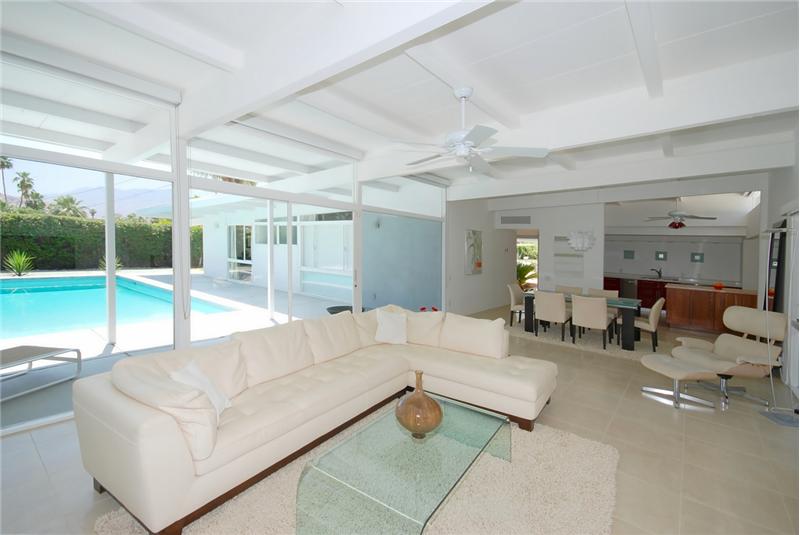 Mid-Century modern masterpiece. Redone classic (1955) spacious post and beam L-shaped ranch situated on a huge lot in a quiet cul-de-sac of only 3 homes within one of Central Palm Springs finest neighborhoods. Architecturally significant visual delights everywhere. Fabulous pavilion-style living wing with totally remodeled (2007) 14' x 19' gourmet Euro-style kitchen with silestone, upgraded appliances and wine cooler. Open to living/dining area with high ceilings, walls of glass, fireplace, screen block wall, atrium, mountain views and nearby saltwater pool. 20' ivory porcelain tile insta ...